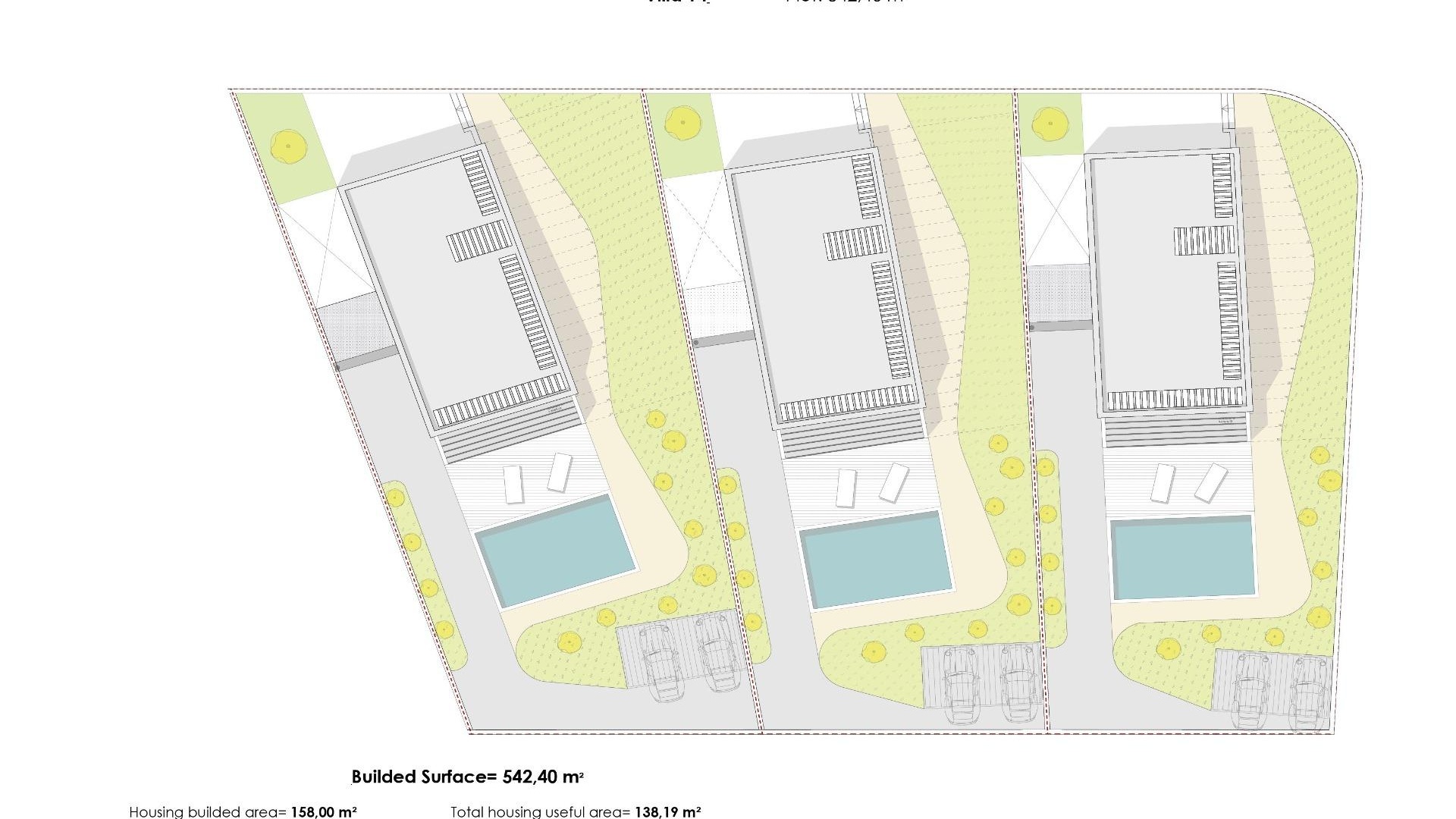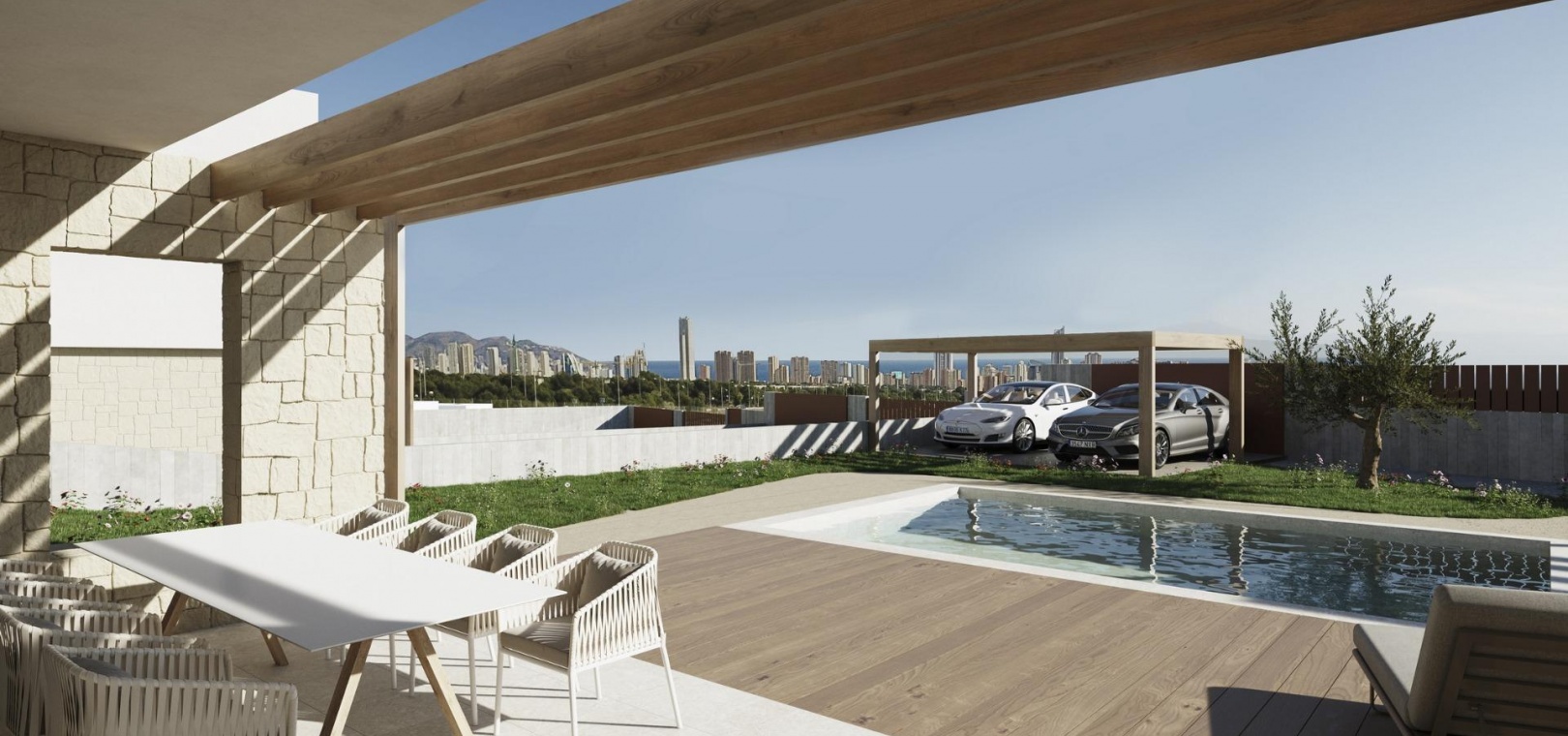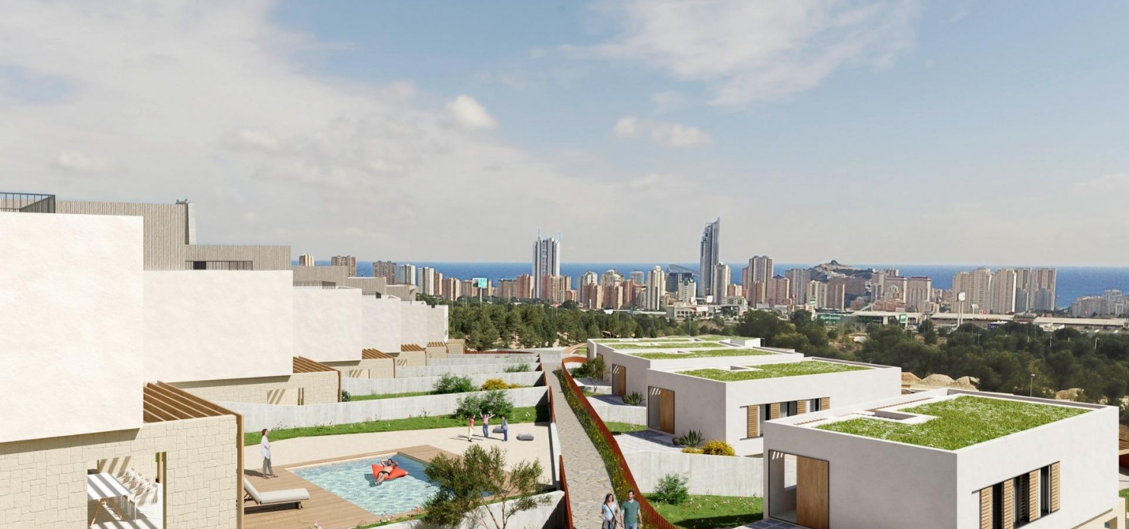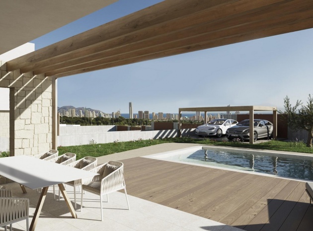 Villas avec 3 chambres et 3 salles de bains, cuisine ouverte avec coin salon, terrasse avec vue magnifique sur Benidorm, jardin privé avec piscine et place de parking.