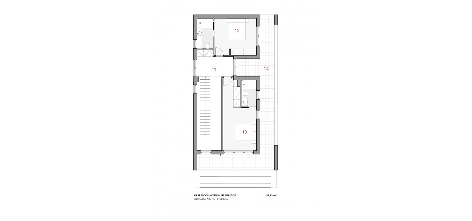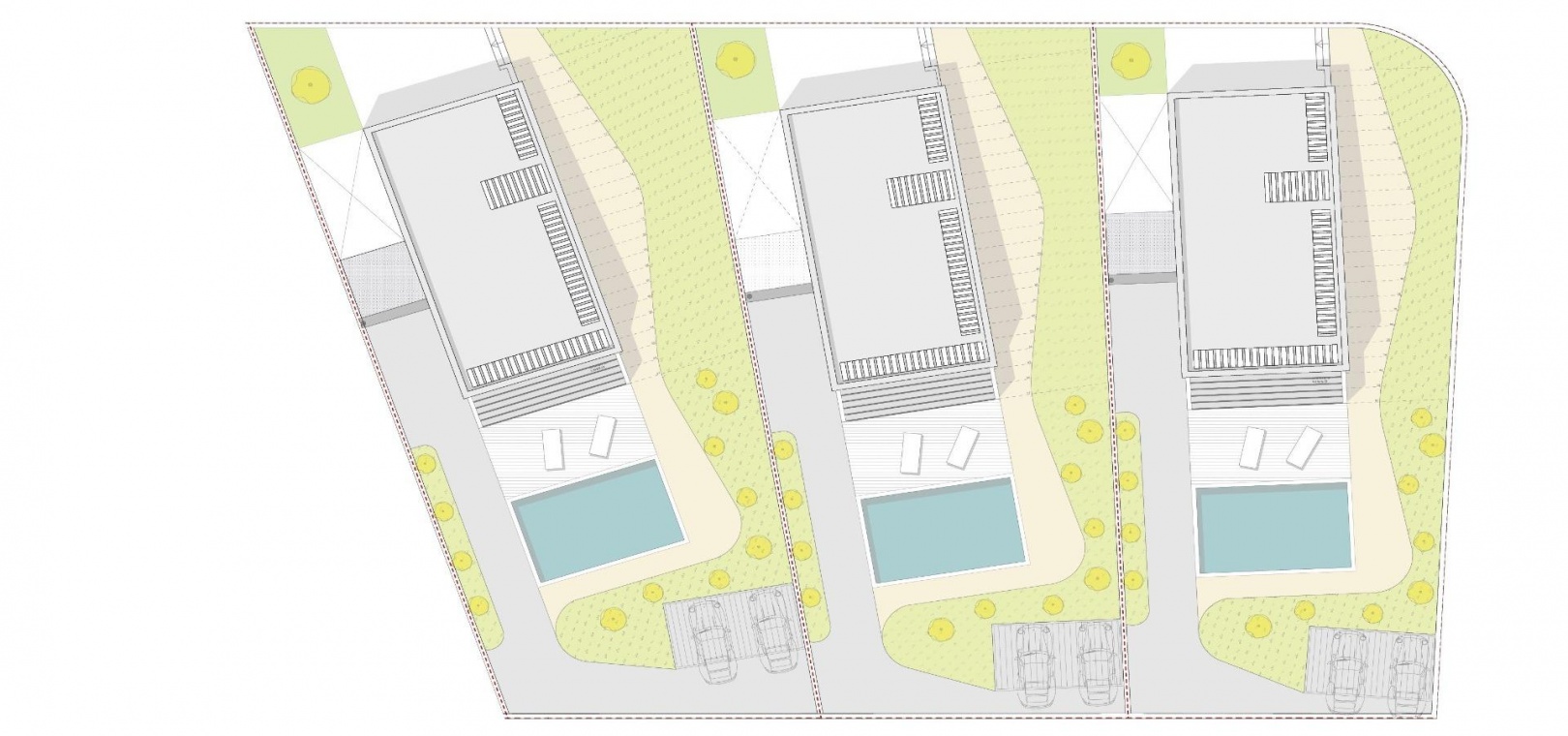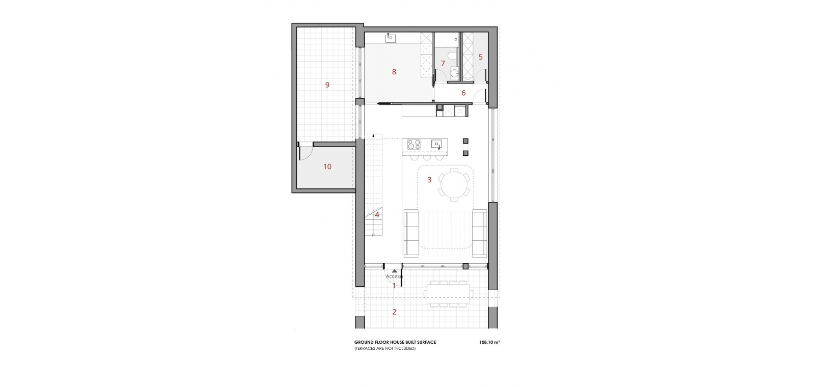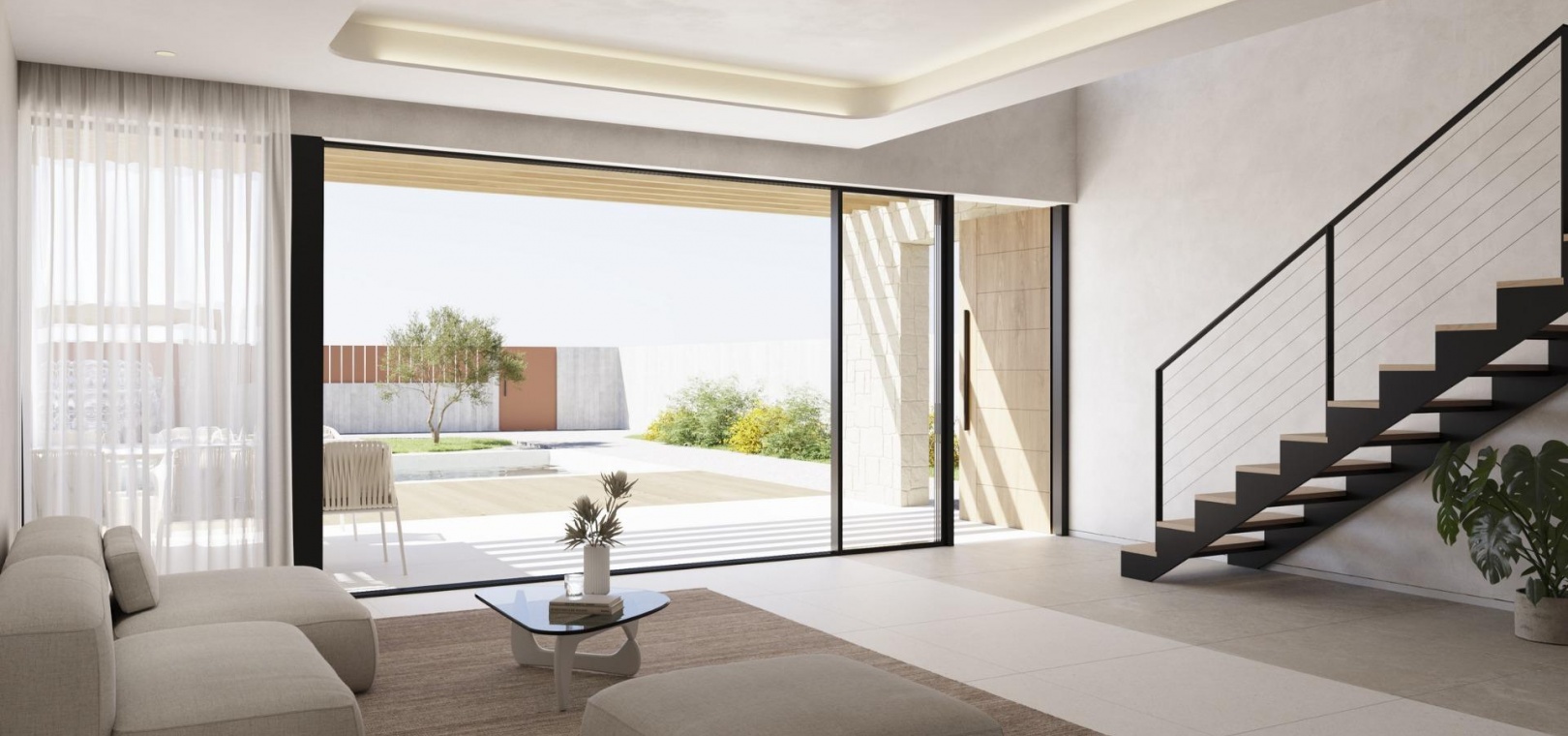 L'entrée principale de la villa est située dans la partie inférieure du terrain, avec un grand parking pour deux véhicules. Une pièce d'eau avec des chaises longues vous introduit au rez-de-chaussée, caractérisé par de larges murs ornés de maçonnerie. Dans le prolongement du salon se trouve une terrasse, rendue possible par une grande fenêtre pliante. Des volets en bois sur les murs en maçonnerie offrent un espace extérieur partiellement couvert pour plus de confort.