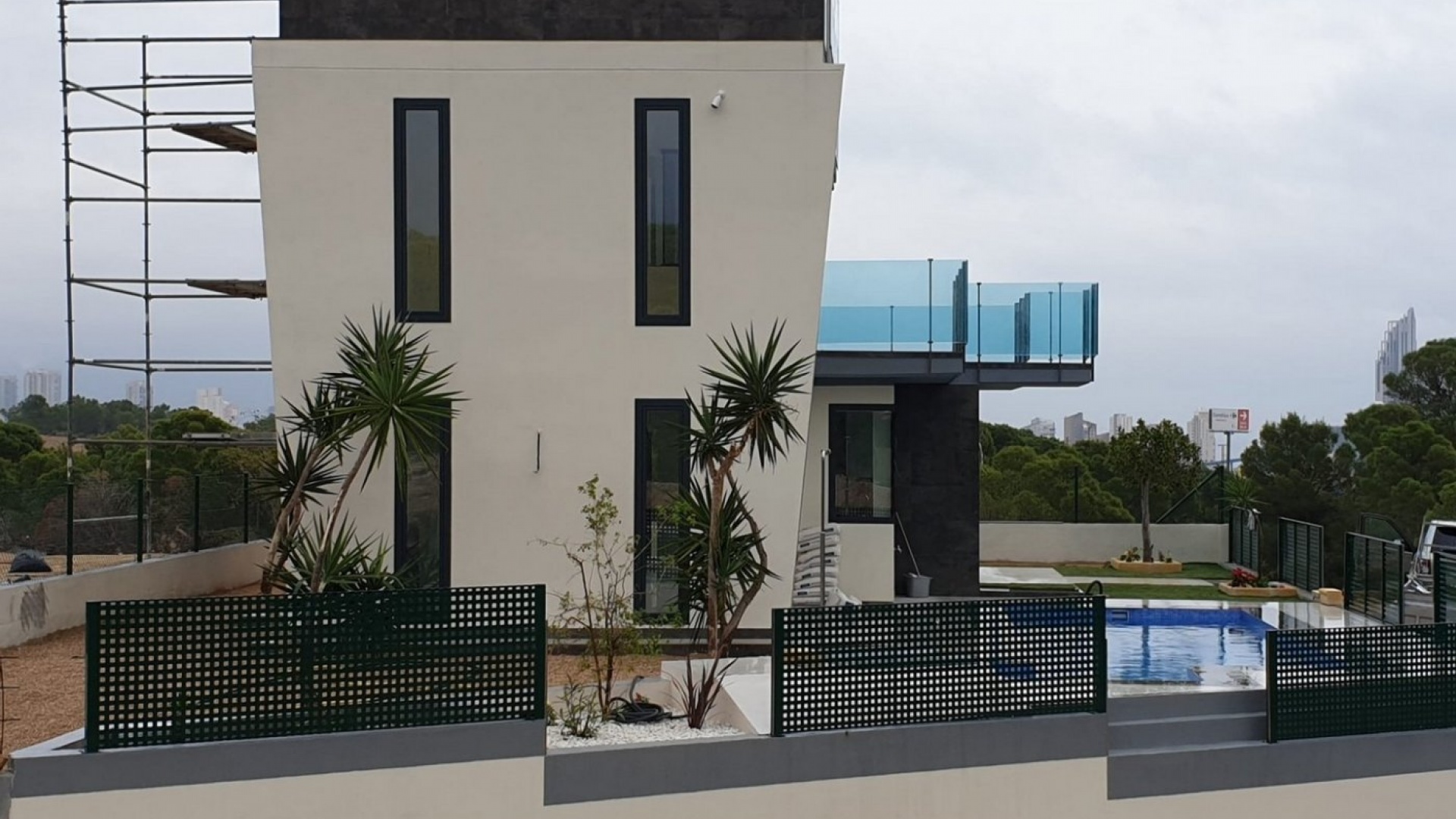 Villas modernes de nouvelle construction à Finestrat avec 3 chambres, 3 salles de bains, salon et cuisine décloisonnés, terrasse ouverte, solarium et parking pour 2 voitures.