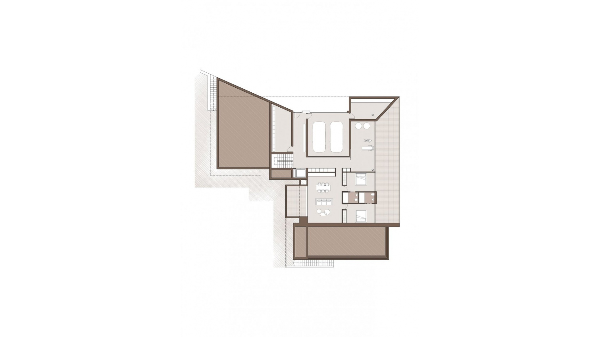 La villa articule les espaces intérieurs à travers des géométries simples, pures et emphatiques. On y accède par une rampe et des escaliers intégrés dans le sol, soutenant la partie supérieure de la maison sur un socle en pierre qui donne accès au lieu de vie.