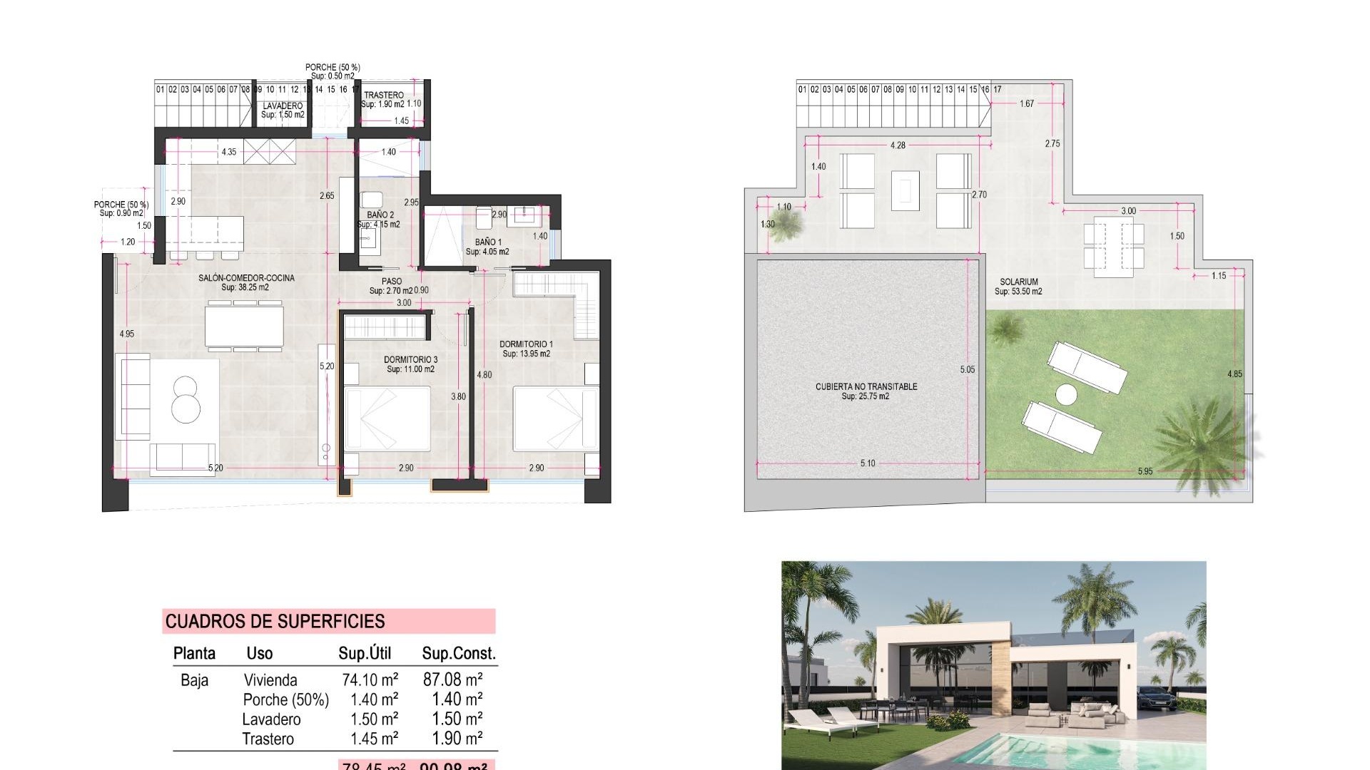 Villas avec 2 salles de bains, 2 salles de bains, cuisine ouverte avec salon, armoires équipées, terrasse, solarium privé et place de parking dans le jardin.