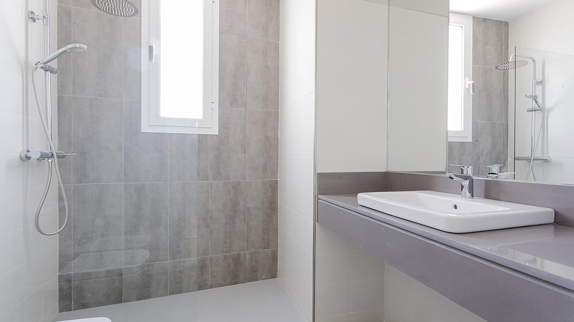 Toutes les salles de bains sont équipées d'une douche au lieu d'une baignoire, de miroirs encastrés et également d'un comptoir en pierre et d'une cloison en verre dans la salle de bains principale.
