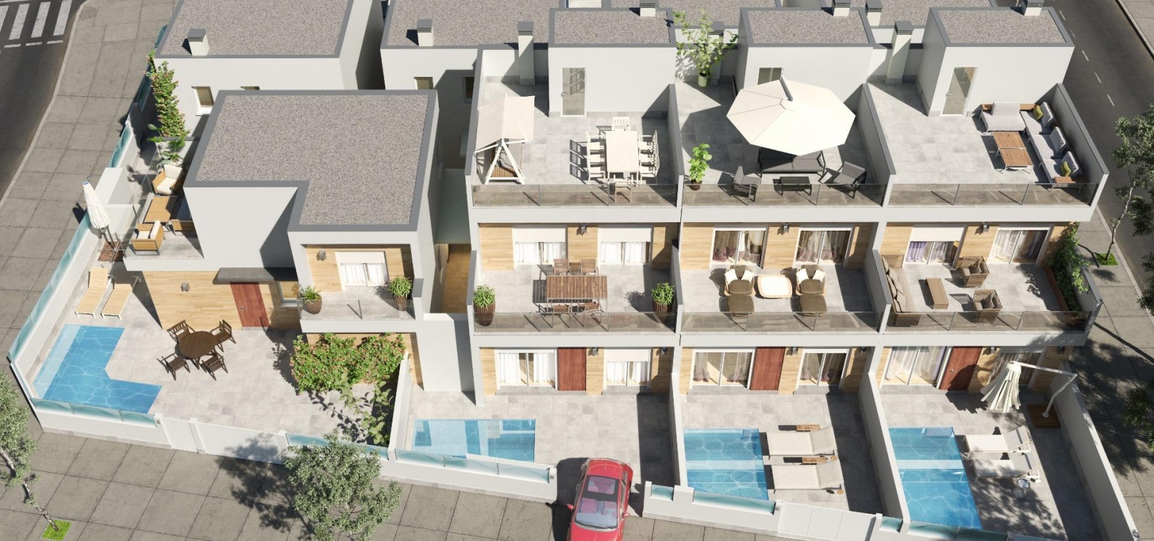 Nouvelle construction de 8 villas indépendantes et semi-détachées à San Pedro Pinatar, toutes avec piscine privée, terrasse, solarium et parking à l'intérieur de la parcelle.