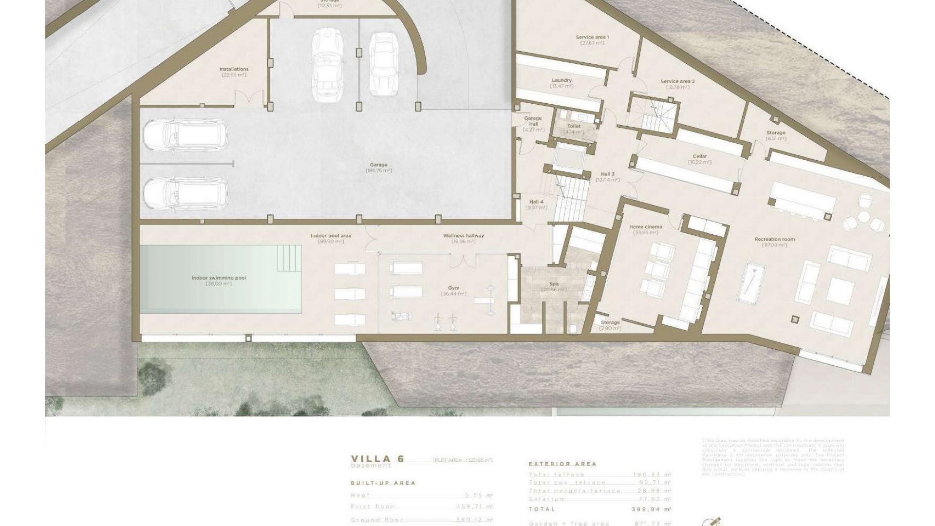 Elle dispose de 4 chambres à coucher et de leur propre dressing. La cuisine entièrement équipée dispose d'un grand îlot central et d'un accès direct à la salle à manger extérieure, avec une cuisine de service attenante. Depuis ce niveau, vous pouvez profiter de différents porches couverts et non couverts, avec différents espaces de détente à côté de la belle piscine, y compris un espace barbecue. Le sous-sol comprend une salle de jeux, une cave à vin et un garage pouvant accueillir 3 à 4 voitures. La villa dispose d'un deuxième sous-sol avec un grand gymnase, un hammam et une salle de cinéma.