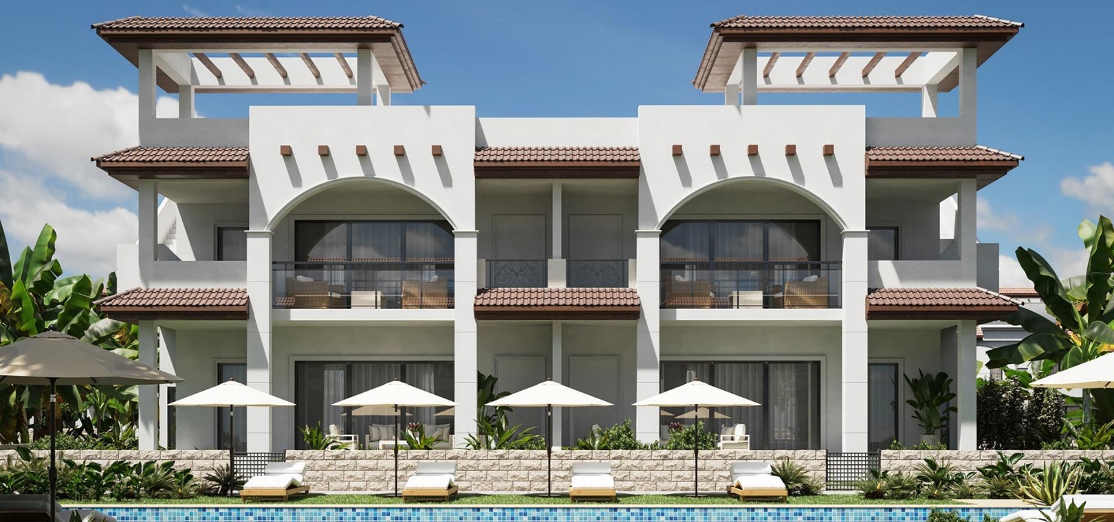 Villas modernes jumelées construites sur 2 étages et disposant de 3 chambres à coucher, 2 et 3 salles de bains, cuisine ouverte et coin salon, armoires encastrées, terrasses, jardin privé et solarium.