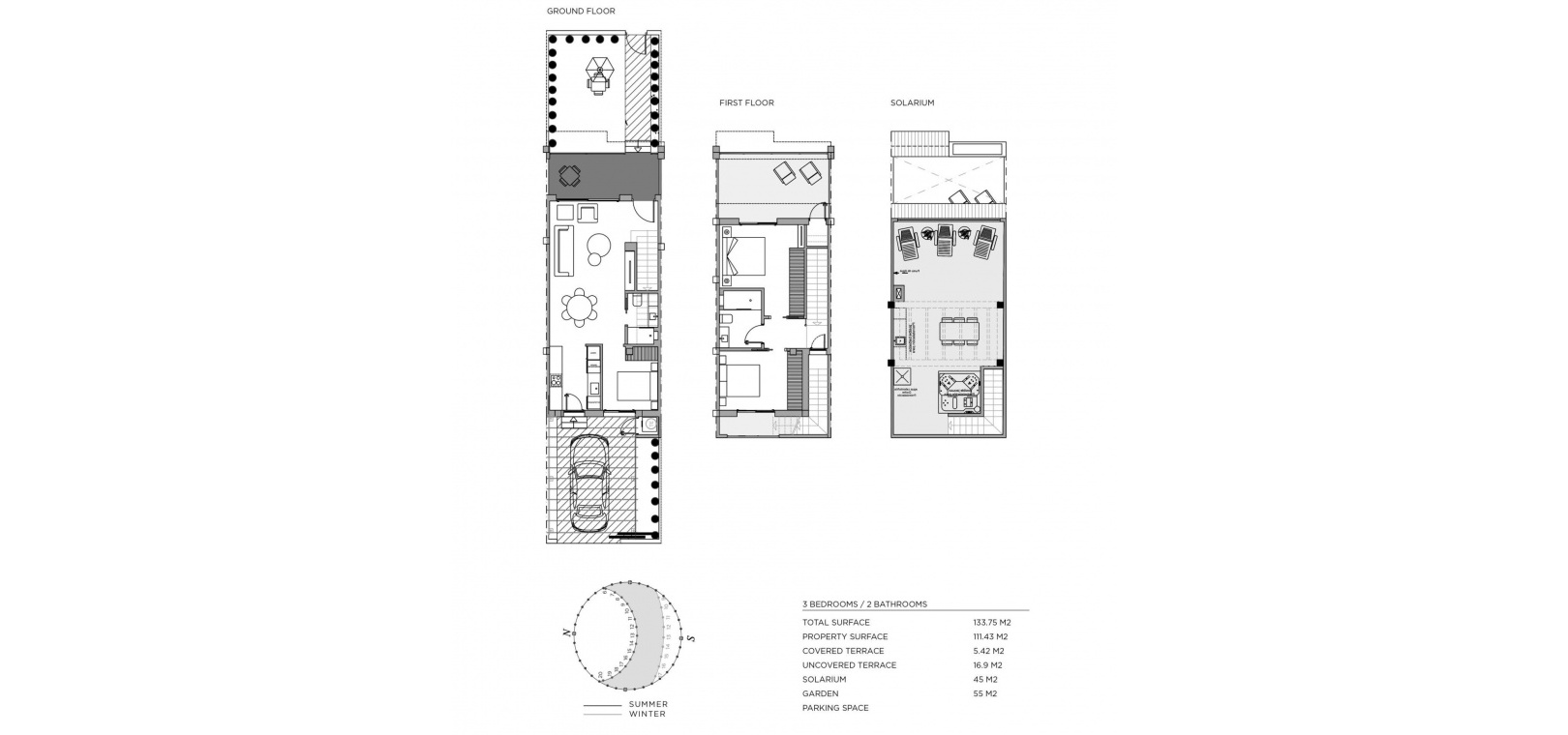 Maisons de ville modernes construites sur 2 étages et disposant de 3 chambres, 2 salles de bains, cuisine ouverte sur le salon, armoires encastrées, terrasses, jardin privé et solarium.