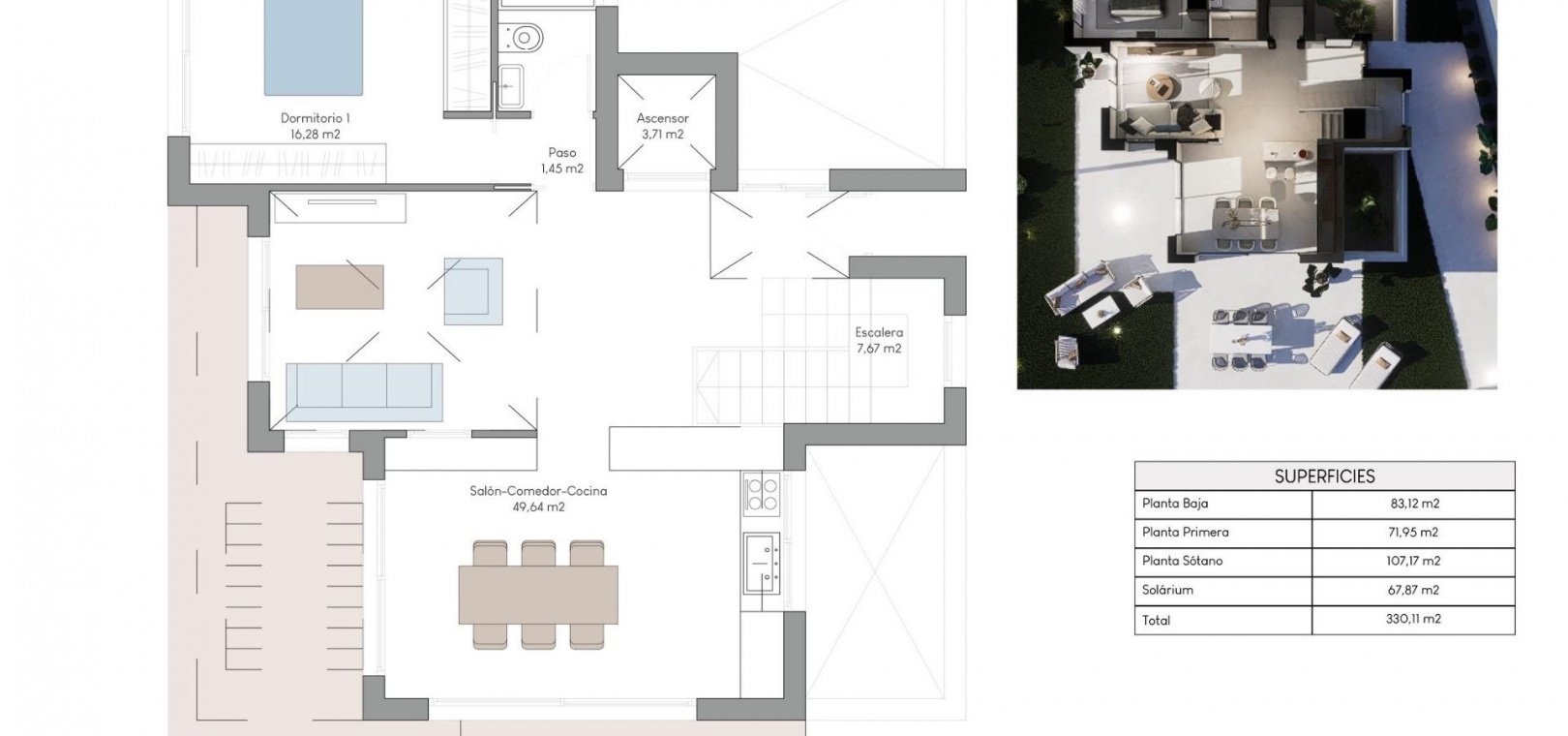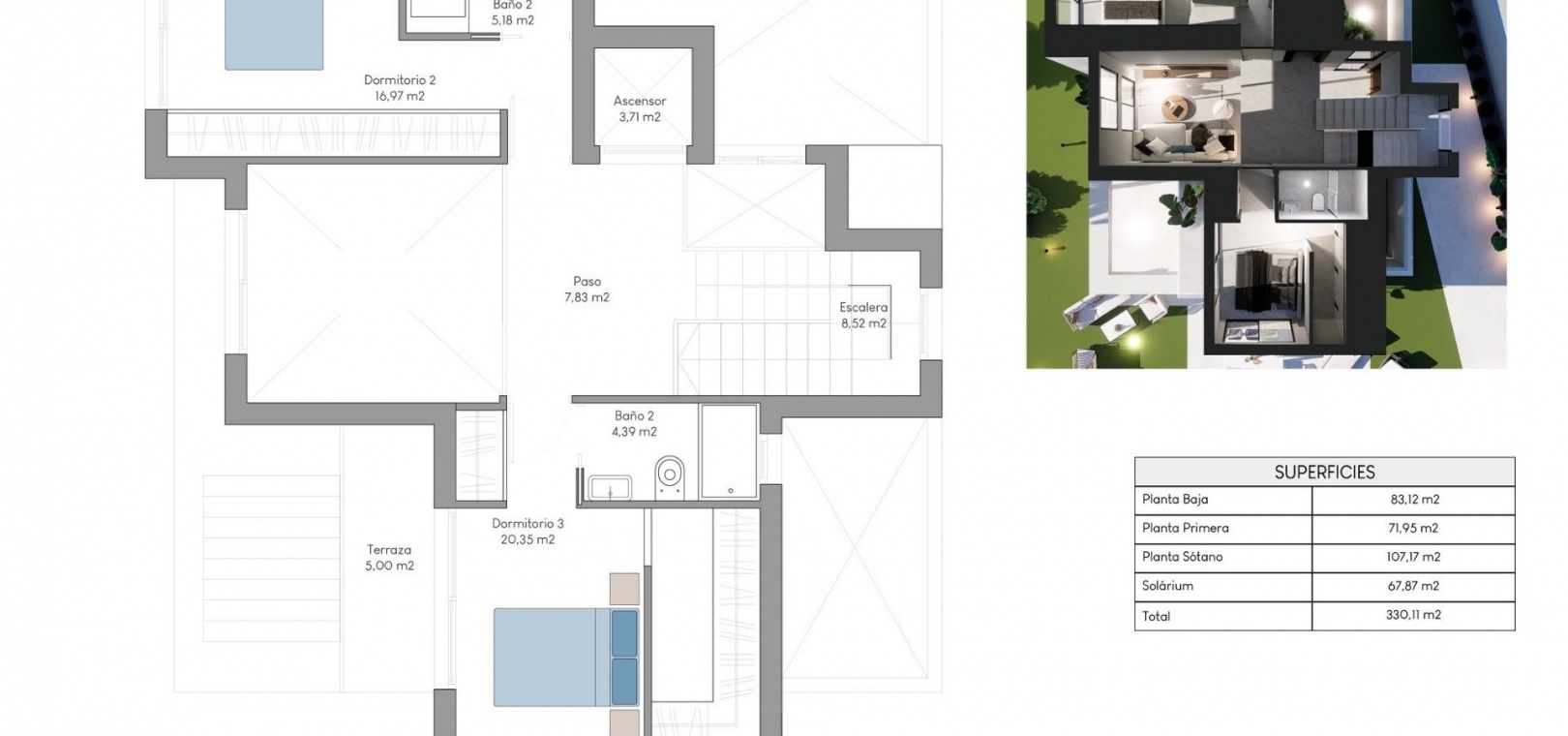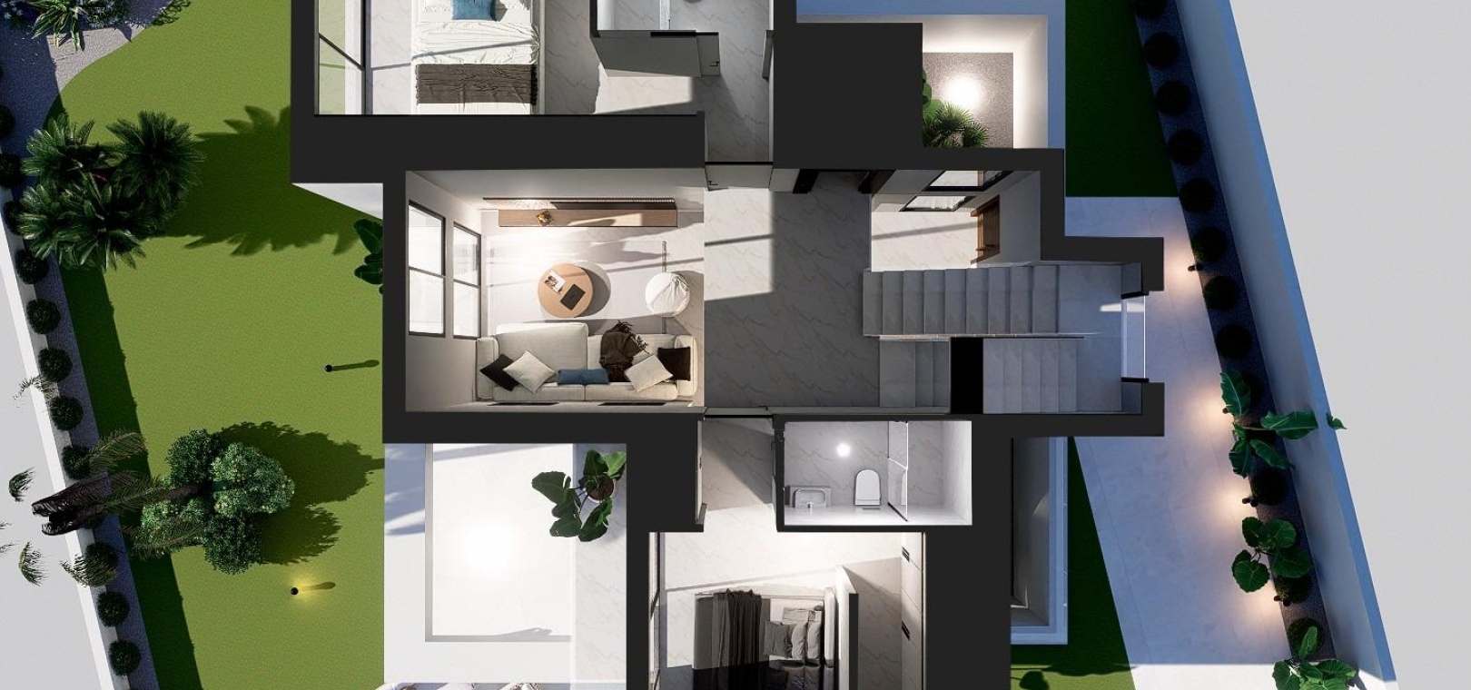 Les villas sont construites sur 2 étages et disposent de 3 chambres à coucher, 3 salles de bains, cuisine ouverte avec salon, armoires encastrées, solarium privé, jardin avec piscine et parking pour 2 voitures.