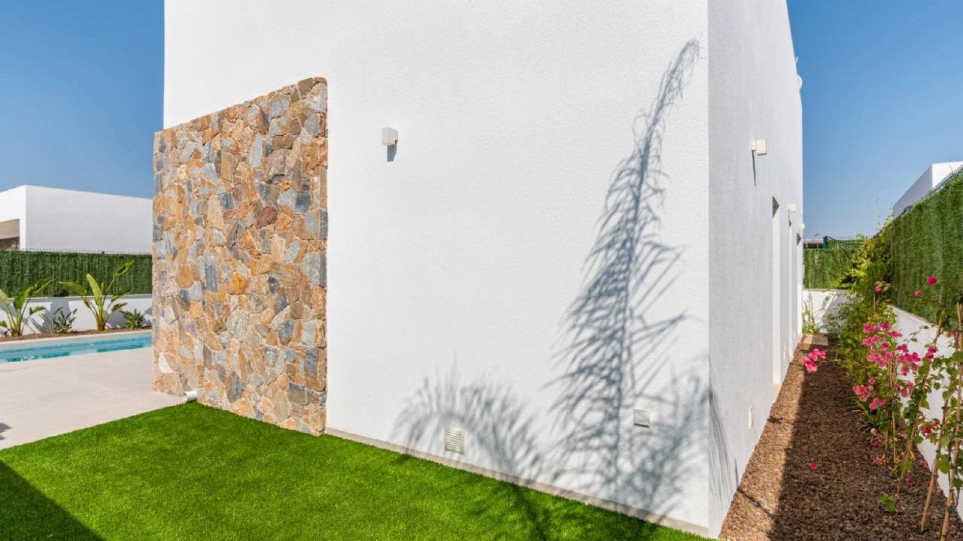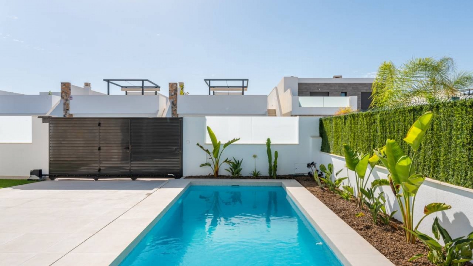 Chaque villa est dotée d'une piscine privée, d'un jardin méticuleusement aménagé avec un système d'irrigation, de salles de bains entièrement équipées avec parois de douche, d'appareils de cuisine, d'une climatisation ventilée chaud/froid, d'un solarium sur le toit et d'un éclairage LED dans toute la maison.