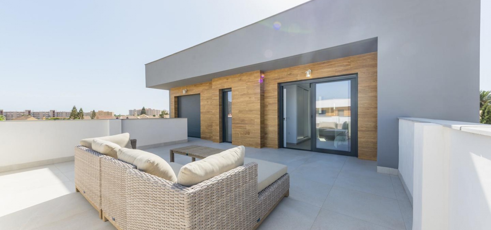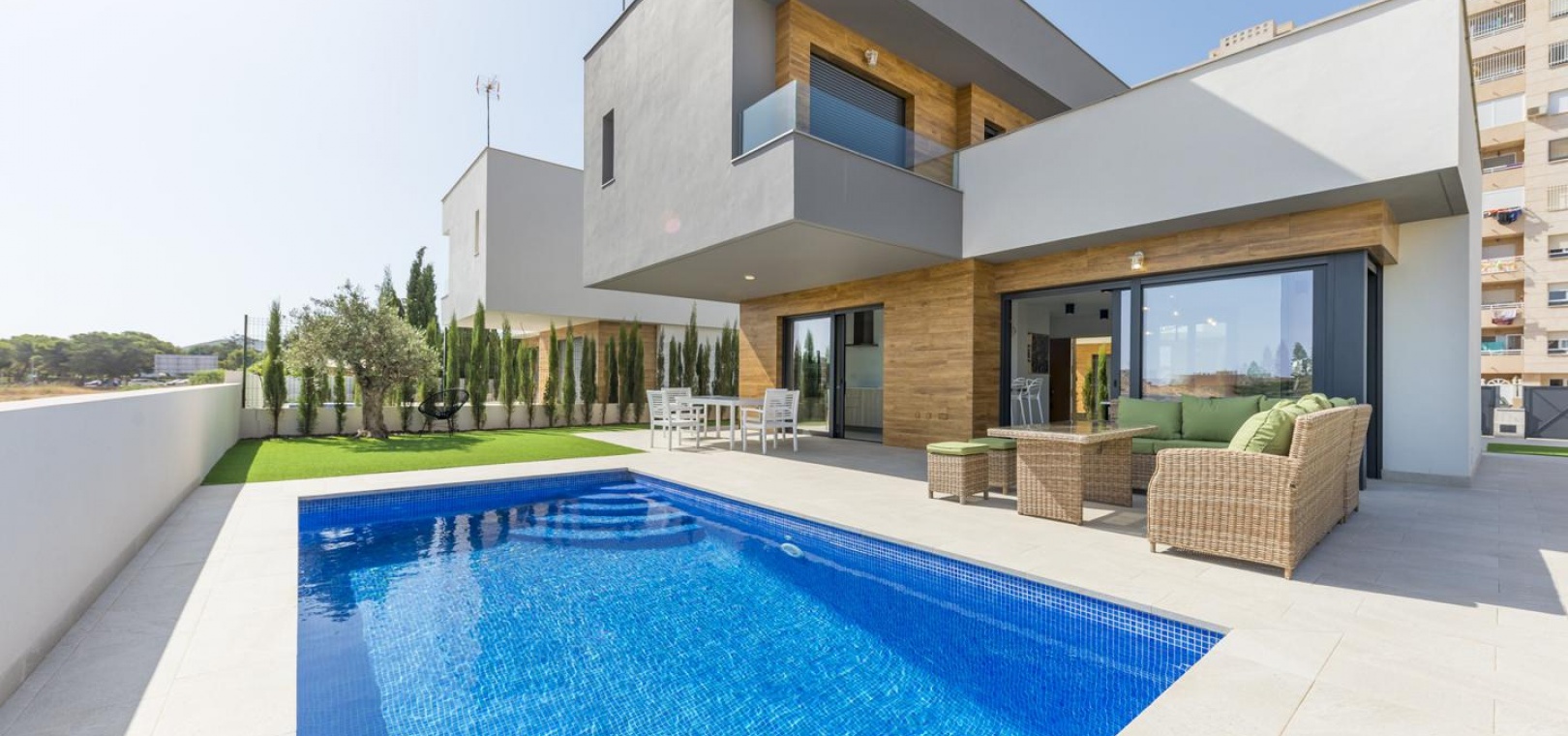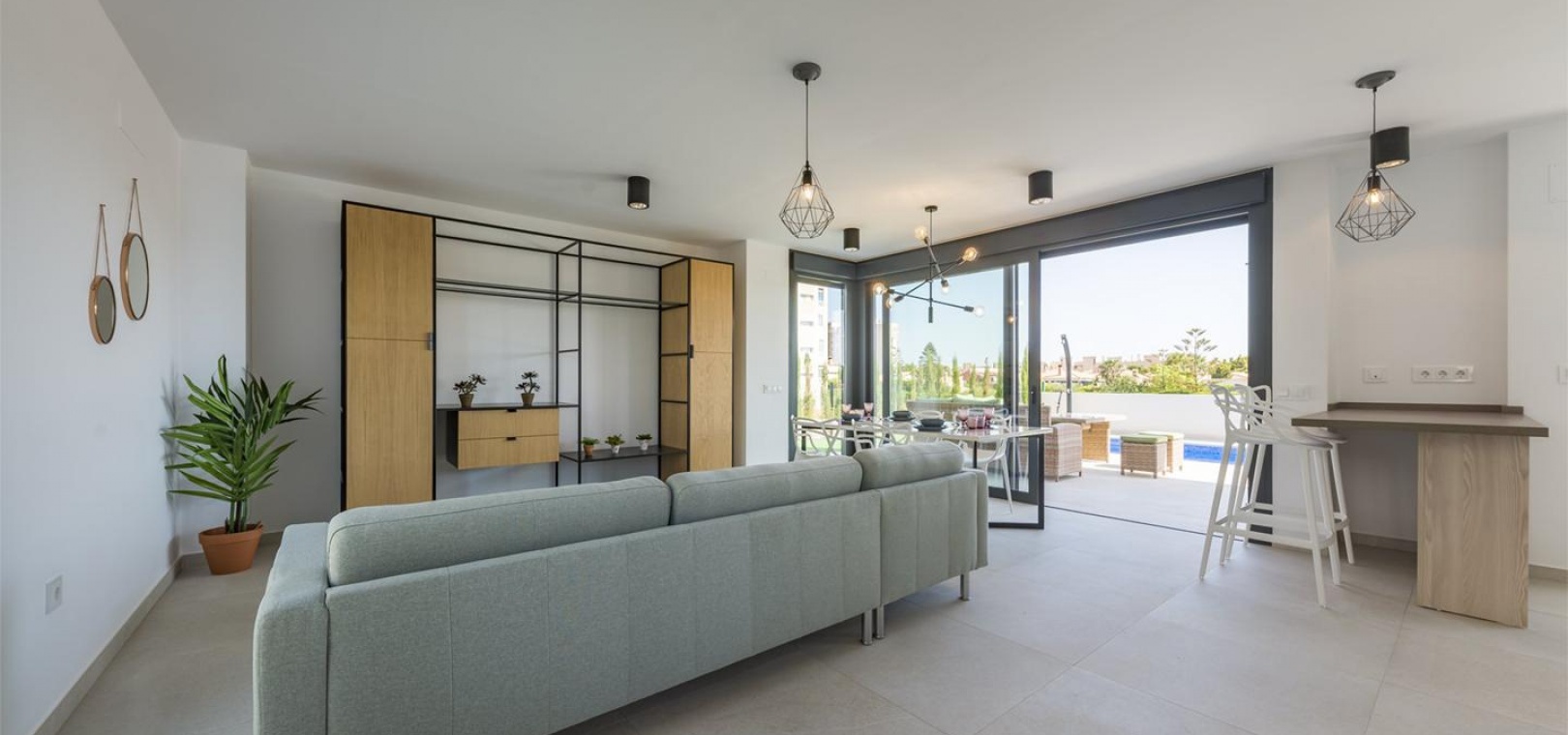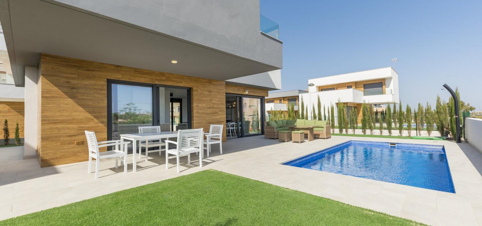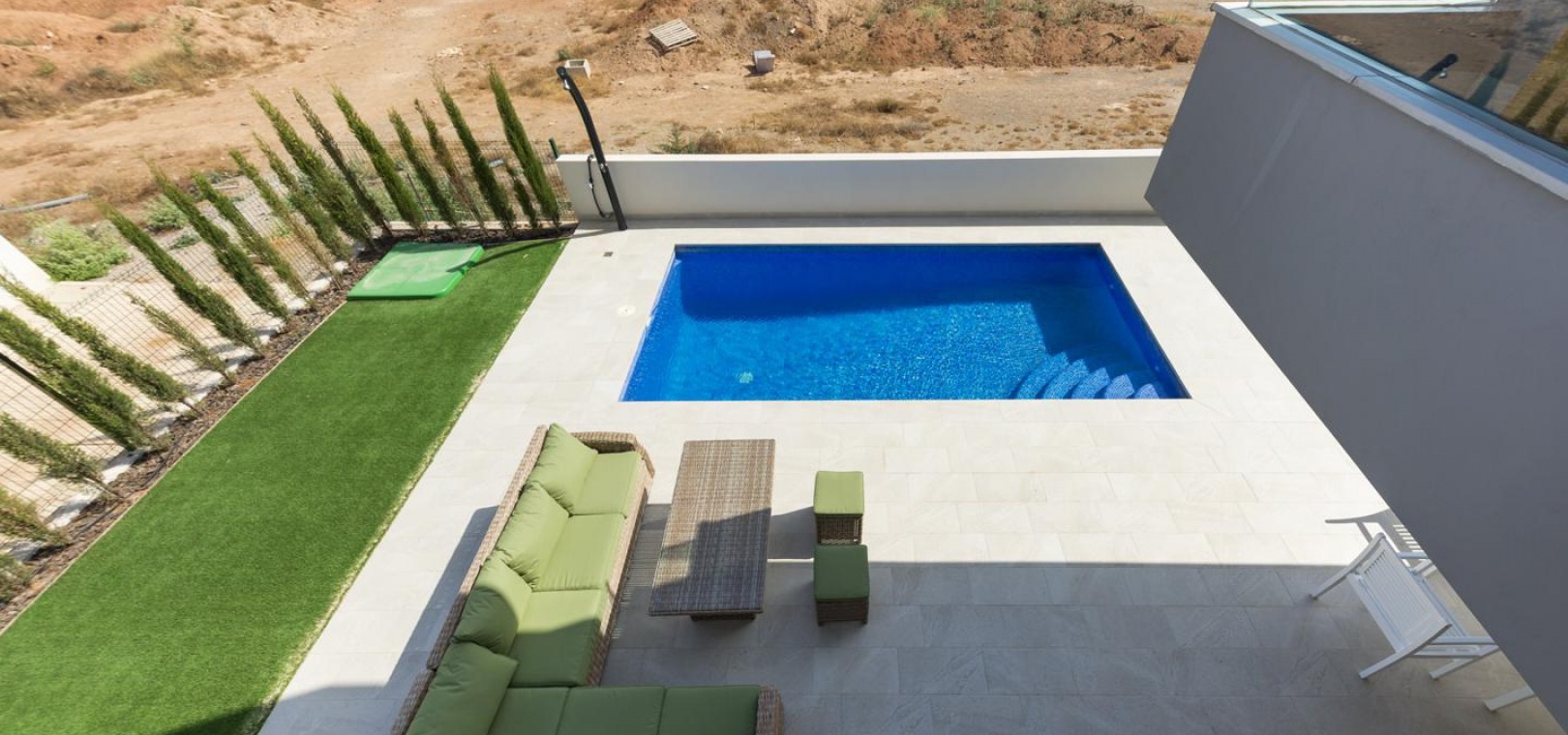 Construite avec des matériaux de première qualité, la villa dispose de 3 chambres à coucher, 3 salles de bains (dont 2 ensuite), une cuisine équipée, un jardin entièrement fini avec des plantes et du gazon artificiel et un solarium.
