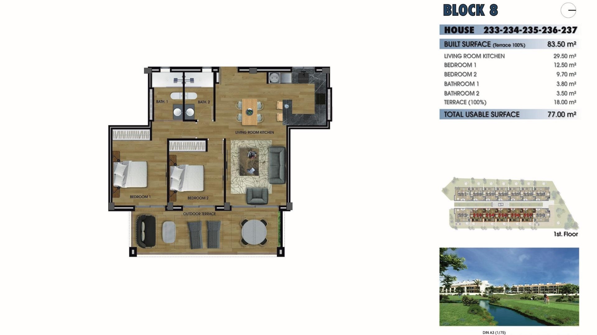 Ce magnifique complexe sera composé de 244 appartements de 2 et 3 chambres à coucher, répartis en 8 blocs et 20 villas privées.