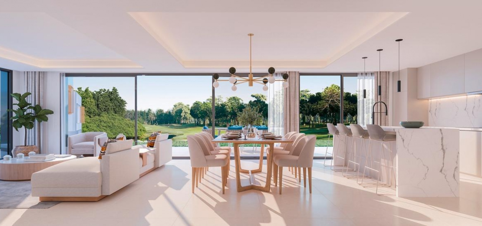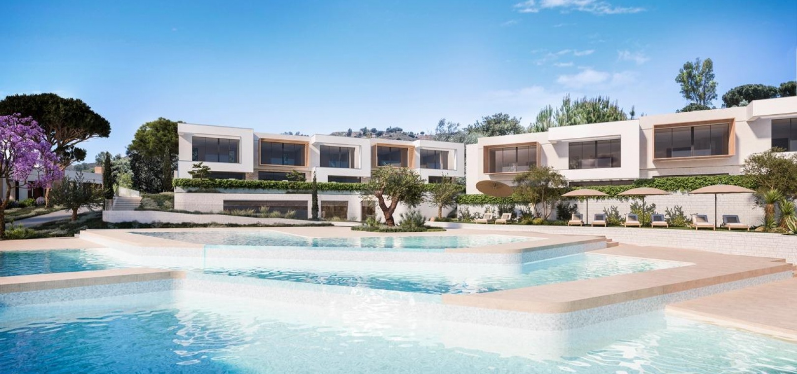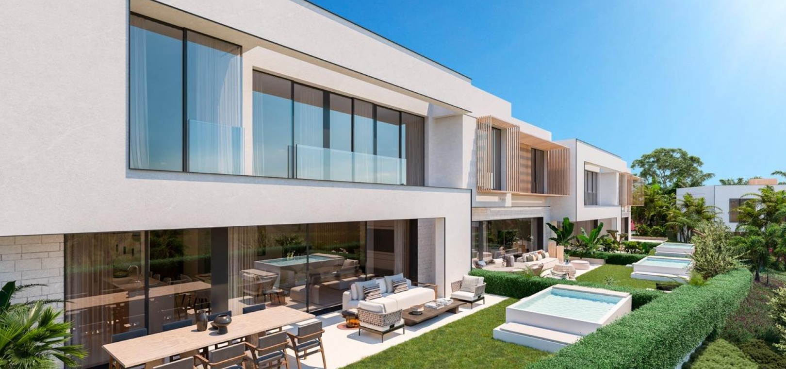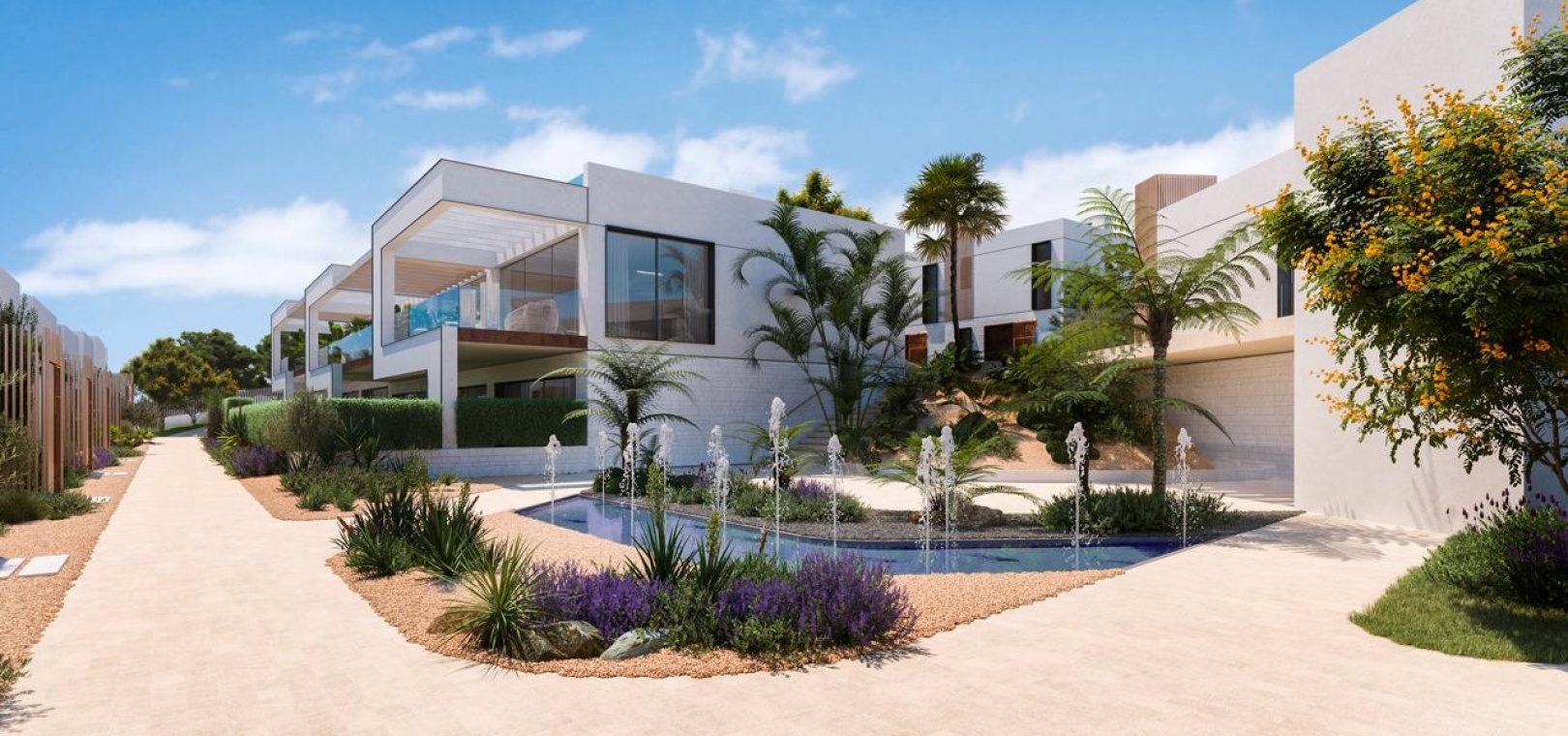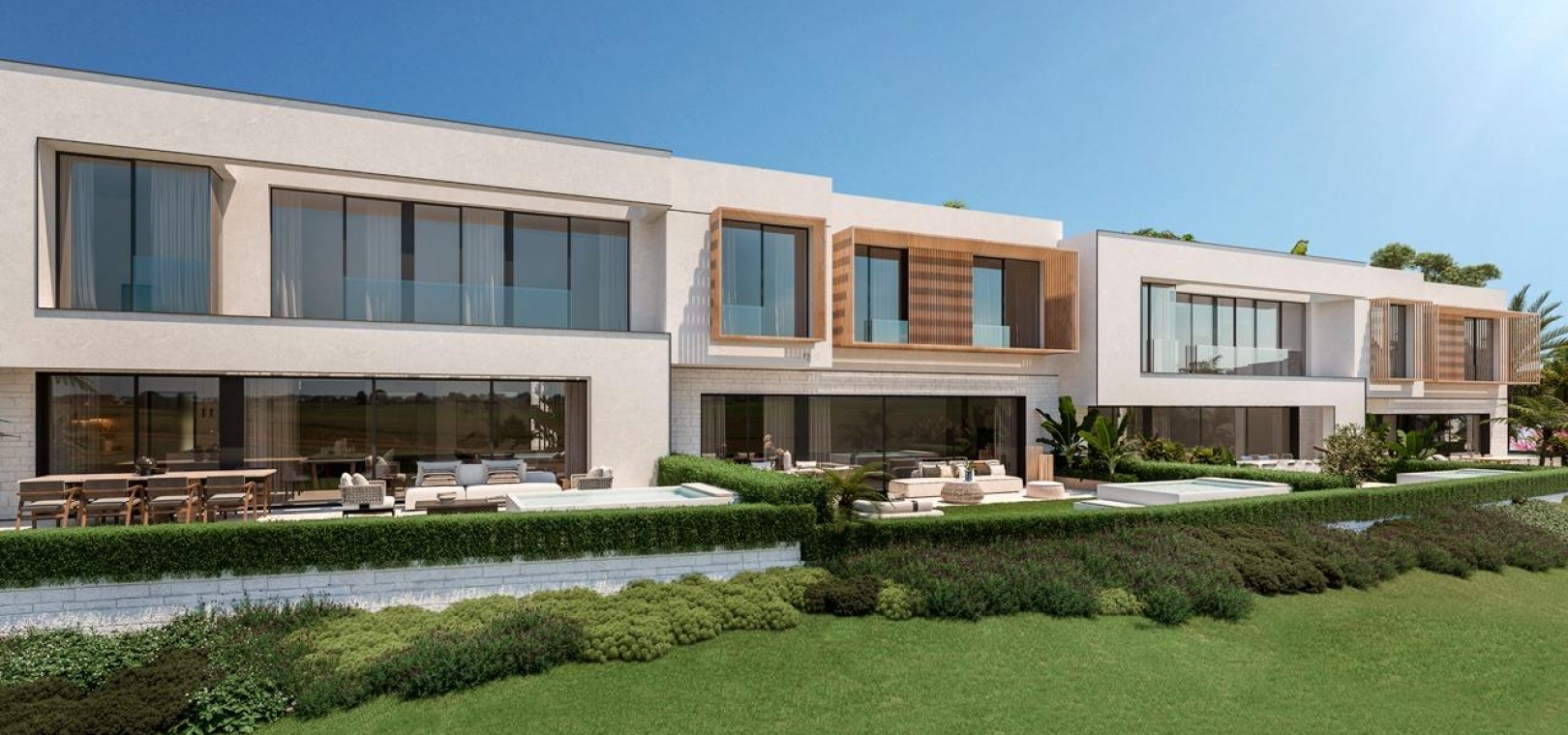 La conception moderne et élégante de ces maisons de ville a été réalisée de manière experte avec l'importance de la lumière et de l'espace en tête de liste des souhaits. Le plan ouvert contemporain a été conçu pour s'intégrer parfaitement avec des fenêtres du sol au plafond menant aux vastes terrasses privées et aux solariums. Ces espaces extérieurs privés ont été créés pour maximiser les vues enviables sur le golf que l'on peut apprécier depuis l'ensemble du projet. Les unités de deux et trois chambres permettent de varier les agencements, de nombreuses maisons bénéficiant d'un immense espace de vie de 8 mètres de large et d'une terrasse. En collaboration avec nos partenaires expérimentés en design d'intérieur, nous avons créé des ensembles de meubles sur mesure pour compléter les intérieurs lumineux et aérés.