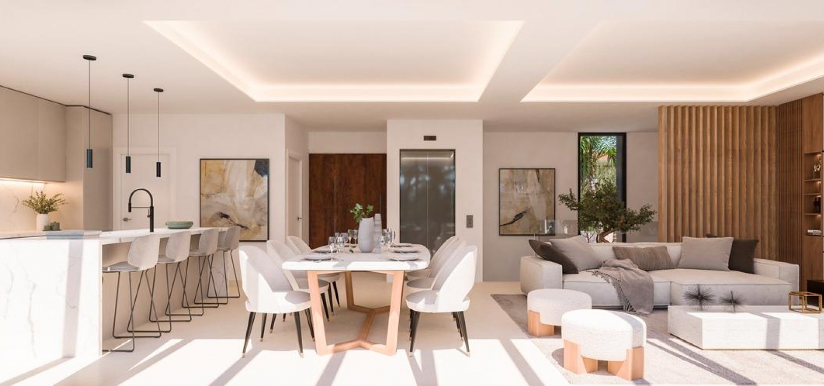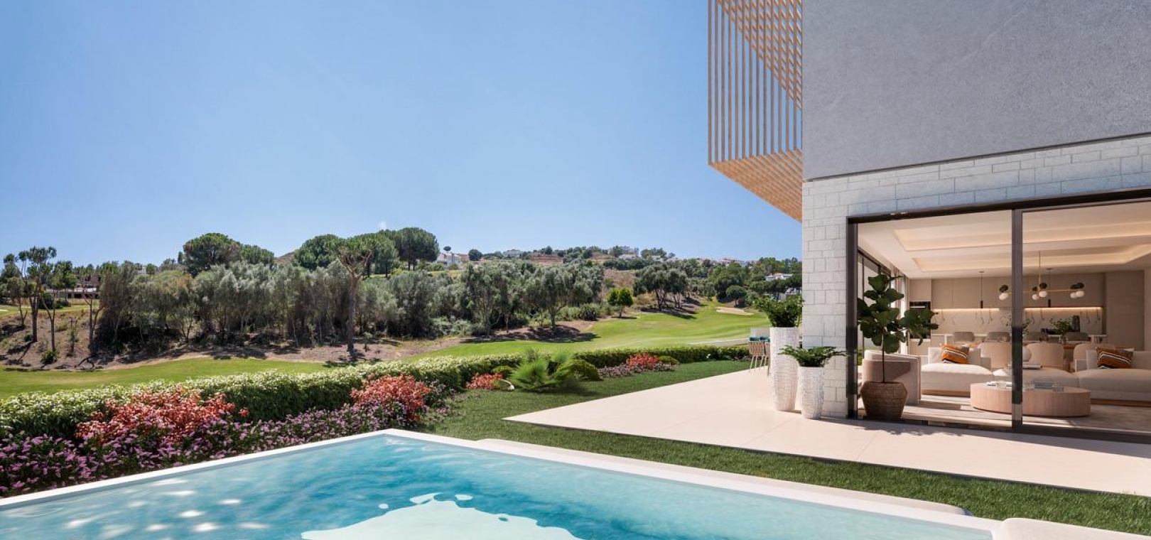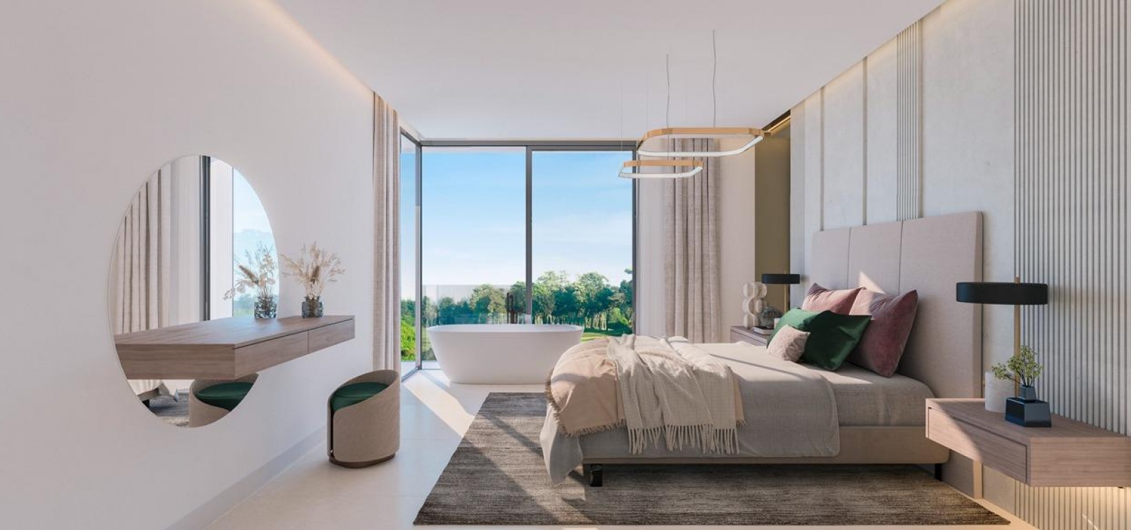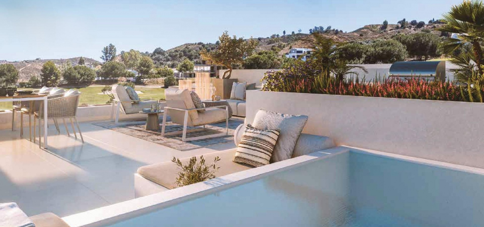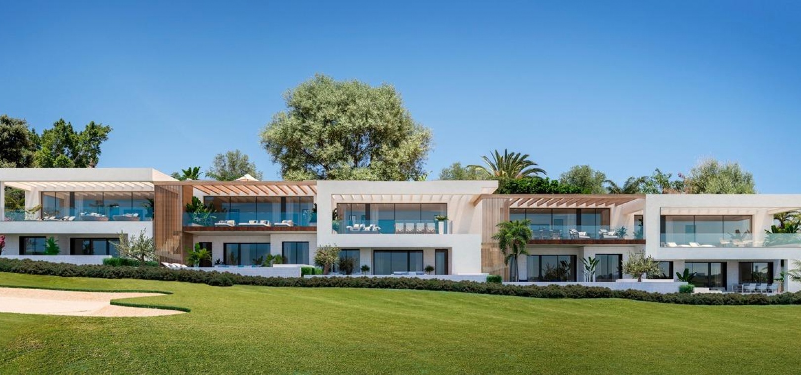 La conception moderne et élégante de ces maisons de ville a été réalisée de manière experte avec l'importance de la lumière et de l'espace en tête de liste des souhaits. Le plan ouvert contemporain a été conçu pour s'intégrer parfaitement avec des fenêtres du sol au plafond menant aux vastes terrasses privées et aux solariums. Ces espaces extérieurs privés ont été créés pour maximiser les vues enviables sur le golf que l'on peut apprécier depuis l'ensemble du projet. Les unités de deux et trois chambres permettent de varier les agencements, de nombreuses maisons bénéficiant d'un immense espace de vie de 8 mètres de large et d'une terrasse. En collaboration avec nos partenaires expérimentés en design d'intérieur, nous avons créé des ensembles de meubles sur mesure pour compléter les intérieurs lumineux et aérés.