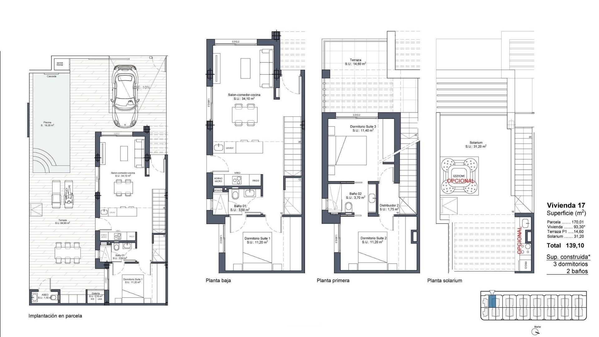Les propriétés modernes disposent de 3 chambres, 2 salles de bains, des toilettes invités, une cuisine ouverte avec le coin salon, des placards intégrés, un solarium, un jardin privé avec piscine et un espace de stationnement hors route.