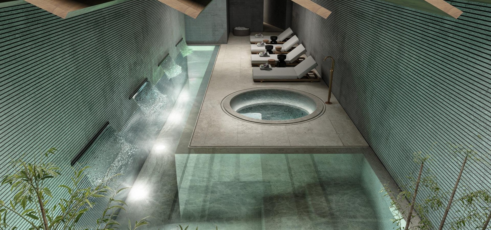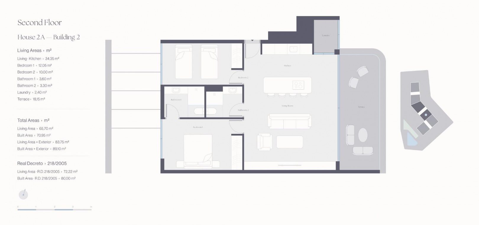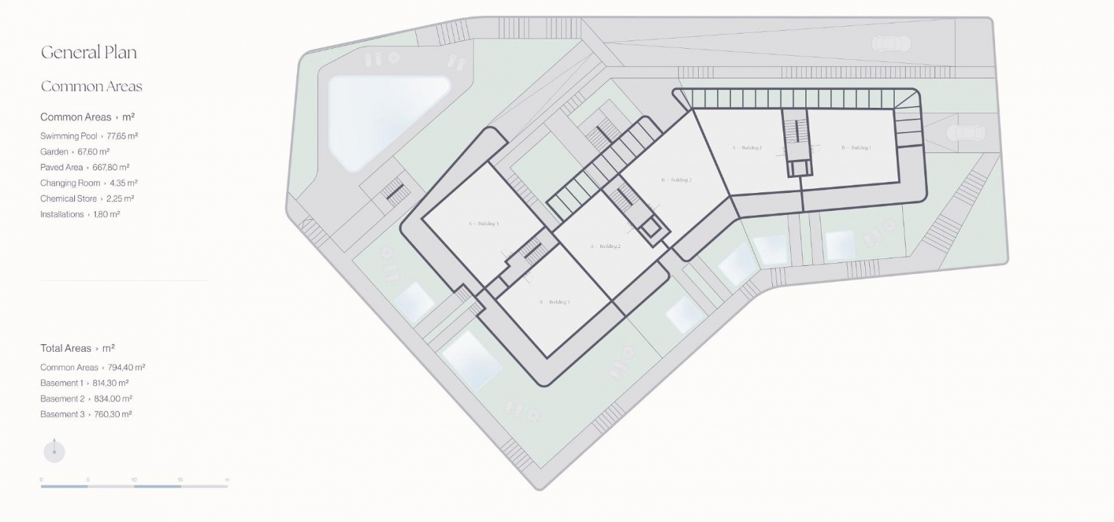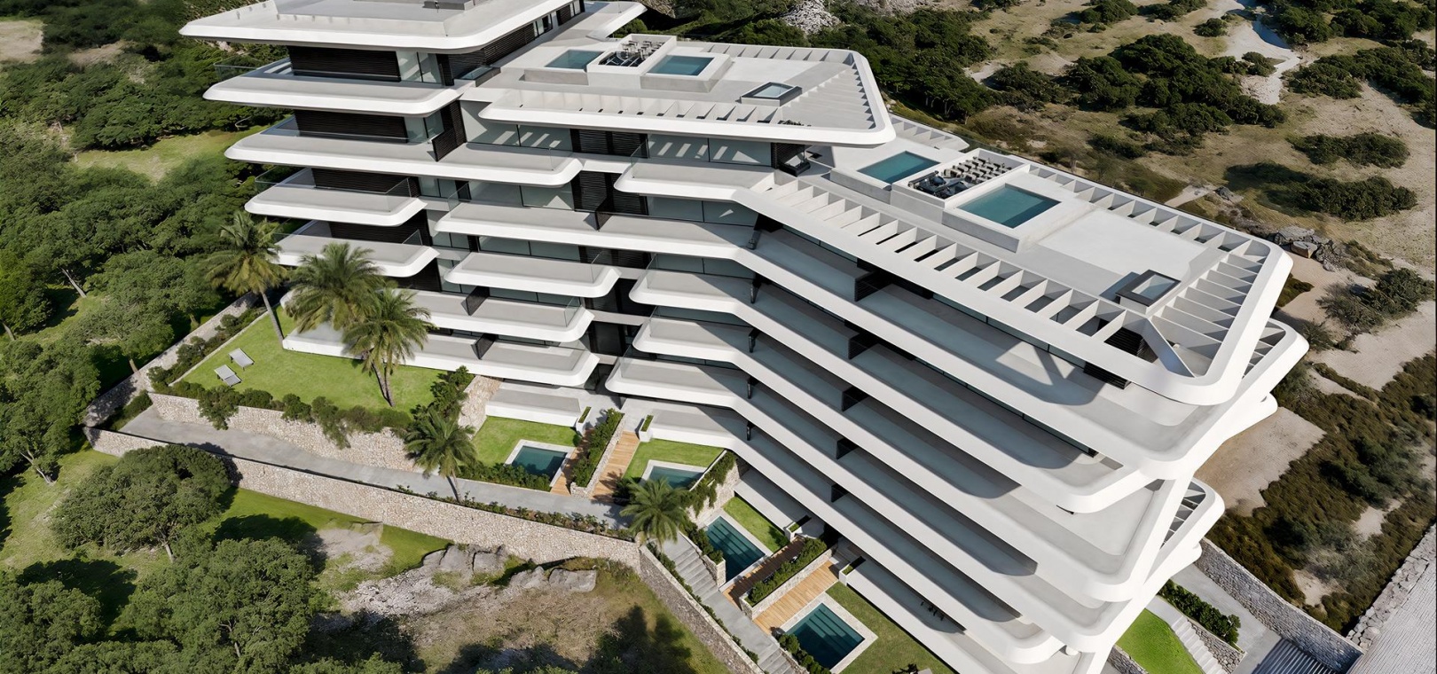 Les maisons au rez-de-chaussée disposent d'un jardin et d'une piscine privée en option, et les penthouses d'un solarium et d'une piscine sur le toit.