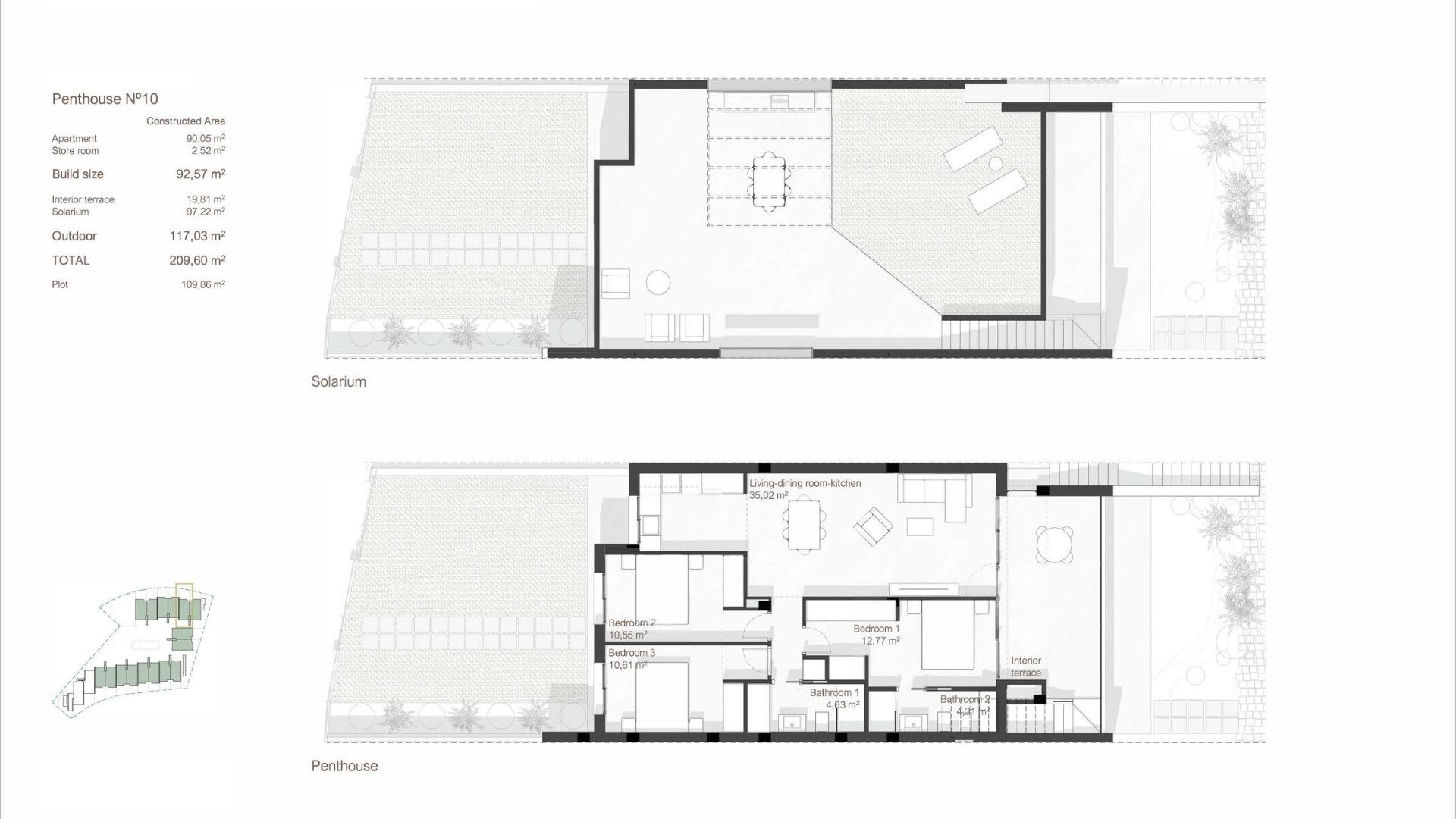 Les acquéreurs peuvent choisir entre des appartements en rez-de-chaussée avec de vastes jardins privés ou des penthouses avec leur propre solarium sur le toit, idéal pour profiter du soleil toute la journée. Chaque propriété offre un agencement spacieux et lumineux avec :