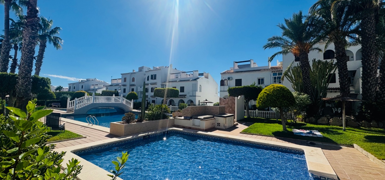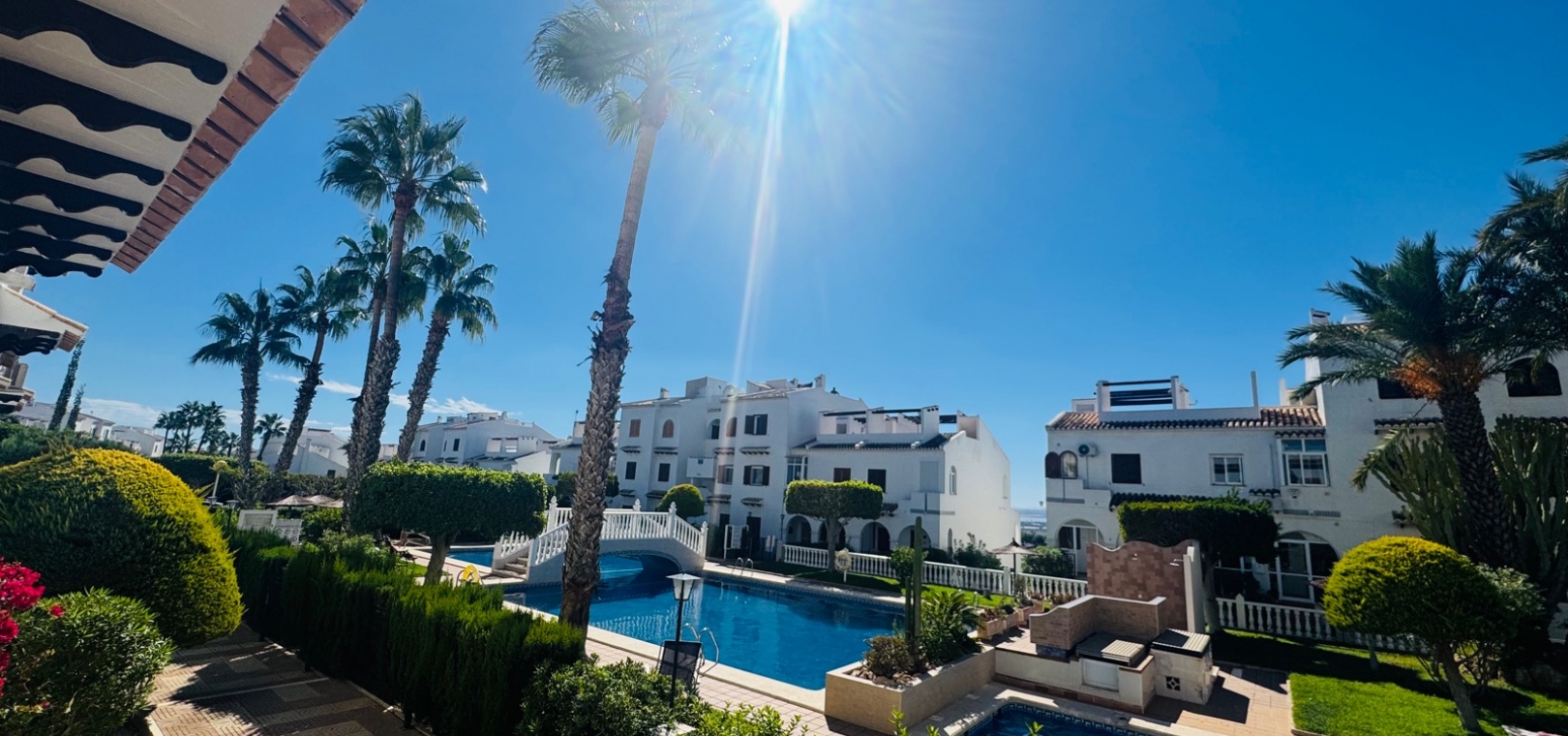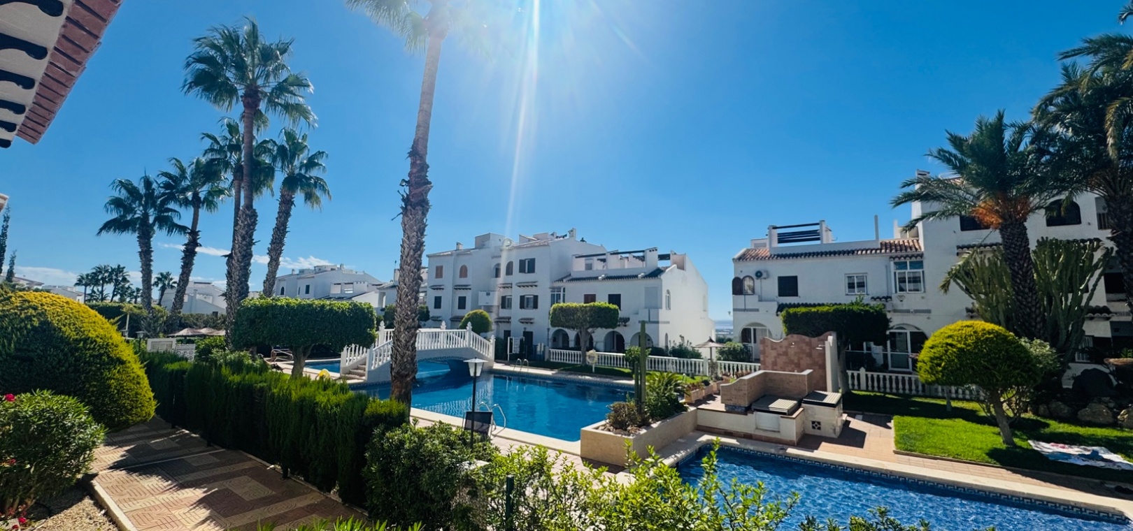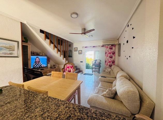 Nous sommes ravis de vous présenter cette charmante maison de ville, comprenant 2 chambres et 1,5 salles de bain, ainsi qu'un séjour spacieux et lumineux qui allie confort et style. Une chambre supplémentaire pour les invités a été ajoutée dans le solarium, construite avec une structure en aluminium durable, offrant une flexibilité supplémentaire pour accueillir des visiteurs ou pour le rangement. Le design ouvert maximise l'espace et la lumière naturelle, créant une ambiance sereine et accueillante dans toute la maison.Cette propriété est située dans le très prisé complexe Bravo Hills Club, idéalement positionnée avec la façade donnant sur la route principale et l'arrière sur les magnifiques jardins communs et la piscine. Les résidents bénéficient de places de stationnement dans la rue ainsi que de places sécurisées à l'intérieur du complexe fermé. Chaque niveau de la maison offre une perspective différente sur les environs, avec la plus belle vue depuis la terrasse sur le toit, l'endroit parfait pour se détendre et profiter du paysage méditerranéen.