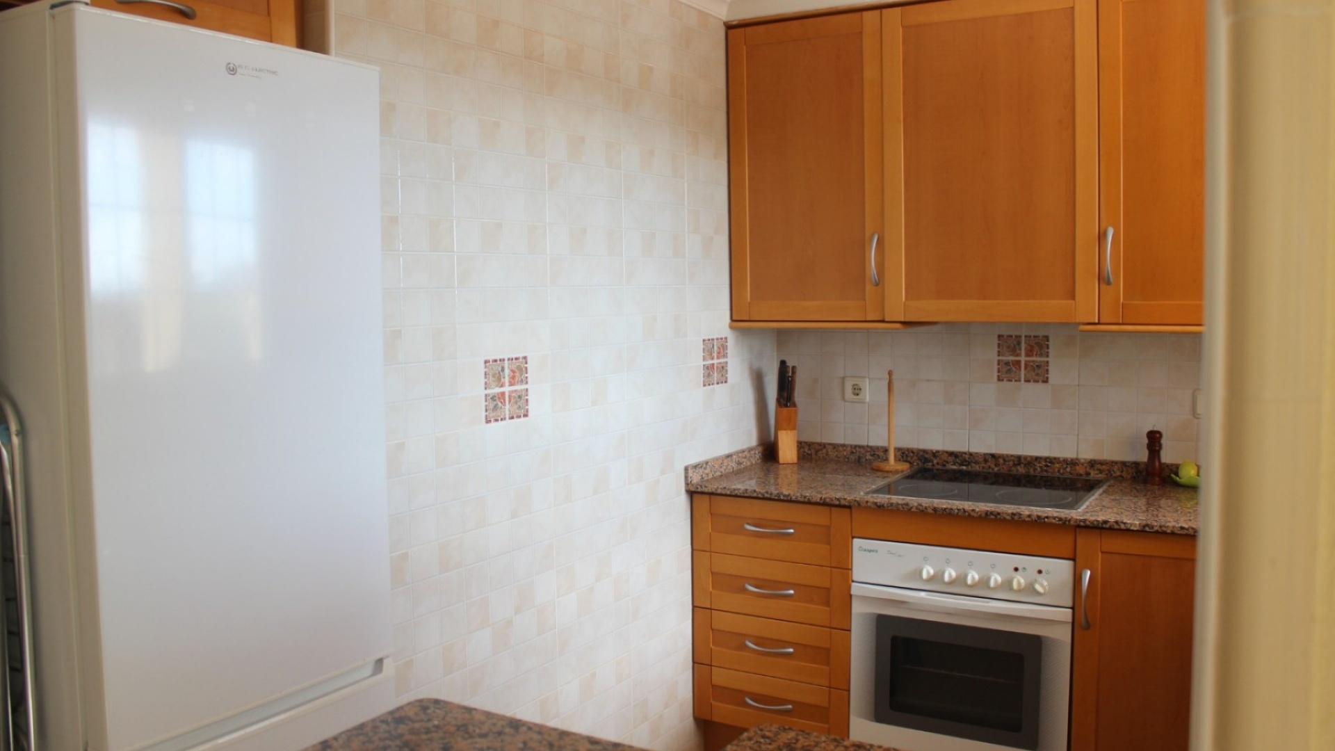 Au rez-de-chaussée il y a un salon / salle à manger avec une cheminée, une cuisine ouverte entièrement équipée, une buanderie séparée, 1 x chambre double avec placards et 1 x salle de douche.
