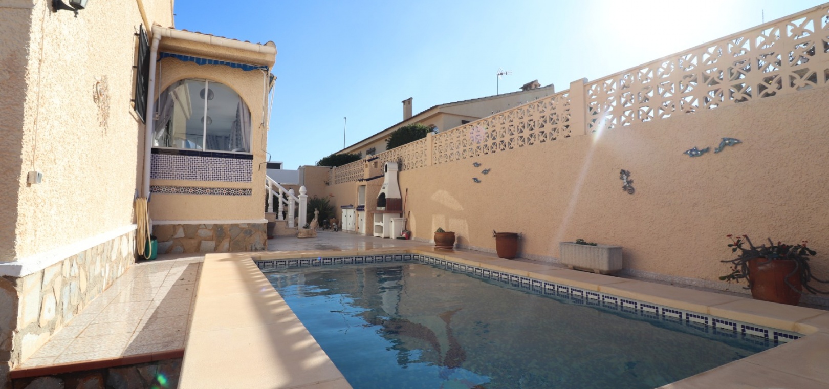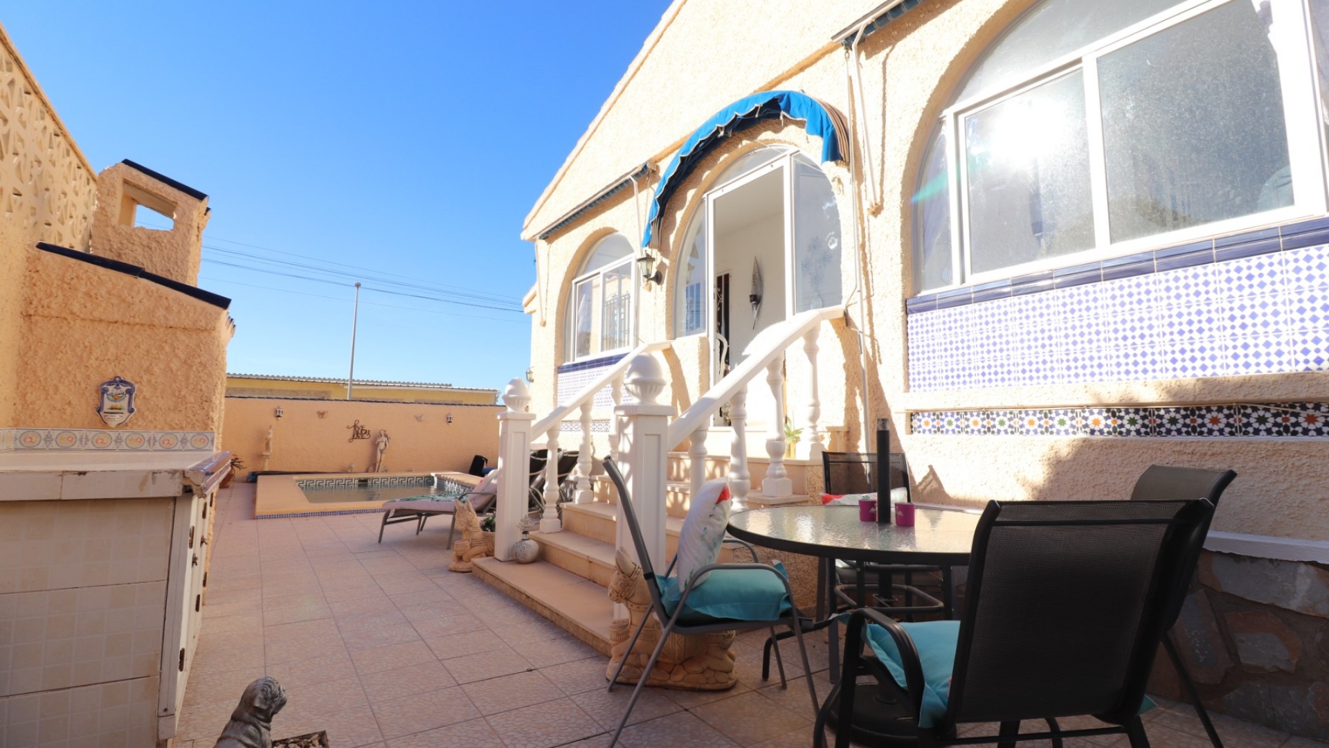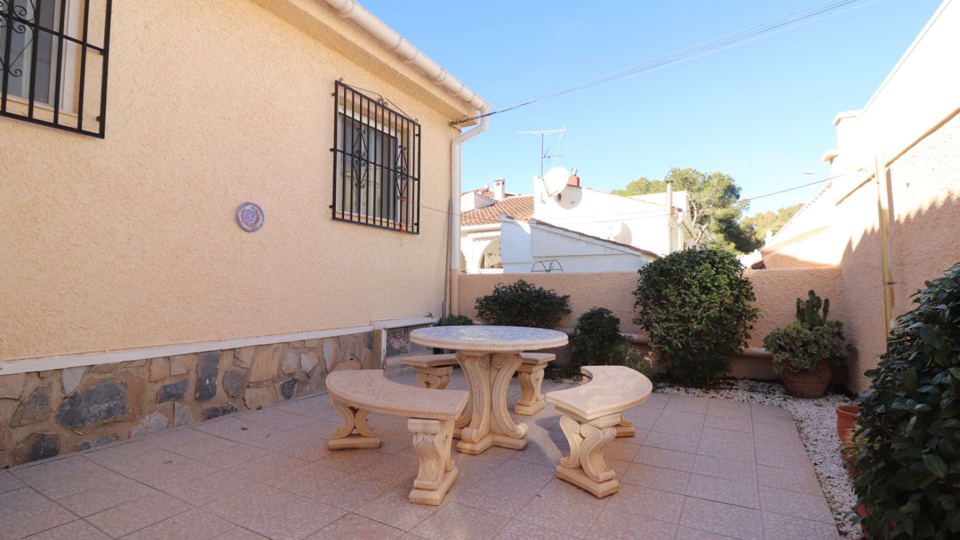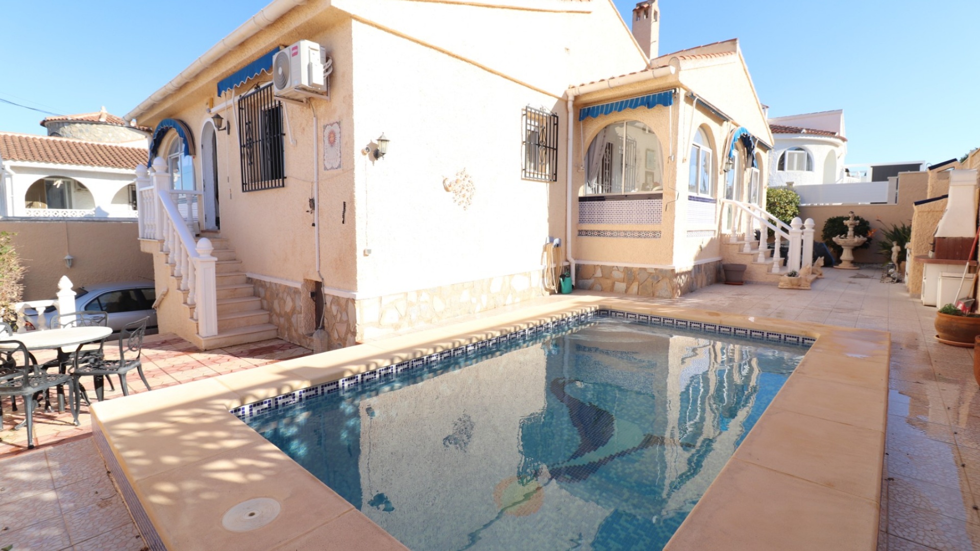 Cette villa individuelle de quatre chambres, exposée sud-ouest et avec sous-sol, est située à Benijofar dans un quartier recherché, à seulement cinq minutes à pied de nombreuses commodités, dont un terrain de sport, une école, un centre médical, une pharmacie et un centre commercial avec McDonald's, de nombreux restaurants et cafés. De plus, plusieurs grandes chaînes de supermarchés se trouvent à proximité. Le golf de La Marquesa est à seulement cinq minutes en voiture, et la magnifique côte sud de la Costa Blanca est à environ 12 minutes. Cette charmante villa dispose d'une terrasse couverte et vitrée donnant sur un salon chaleureux avec cheminée et climatisation. Une large arche relie le salon à la salle à manger, qui mène ensuite à une cuisine équipée. La propriété principale comprend deux chambres doubles avec placards intégrés, la chambre principale bénéficiant de la climatisation et d'une salle de bains privative. Une salle d'eau familiale est également disponible. Le sous-sol, accessible depuis l'extérieur, offre un espace supplémentaire avec deux chambres doubles (dont une avec salle de bain attenante), une autre salle d'eau familiale, une kitchenette, une buanderie et un espace de rangement, offrant une grande flexibilité pour les invités ou la famille élargie. L'extérieur comprend un jardin carrelé avec parking hors voirie, une piscine privée de 3 x 6, un barbecue, un espace de travail et des bordures plantées. C'est une opportunité fantastique pour une résidence principale ou une résidence secondaire sur la Costa Blanca Sud.
