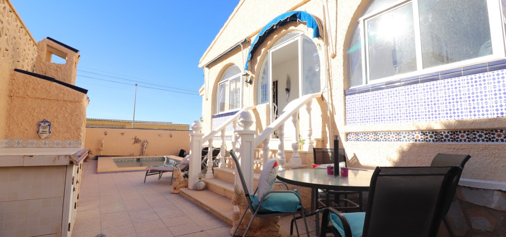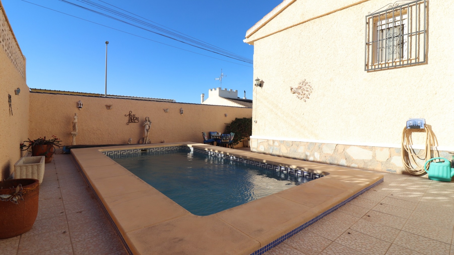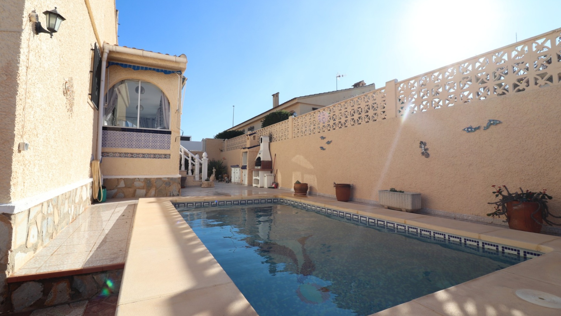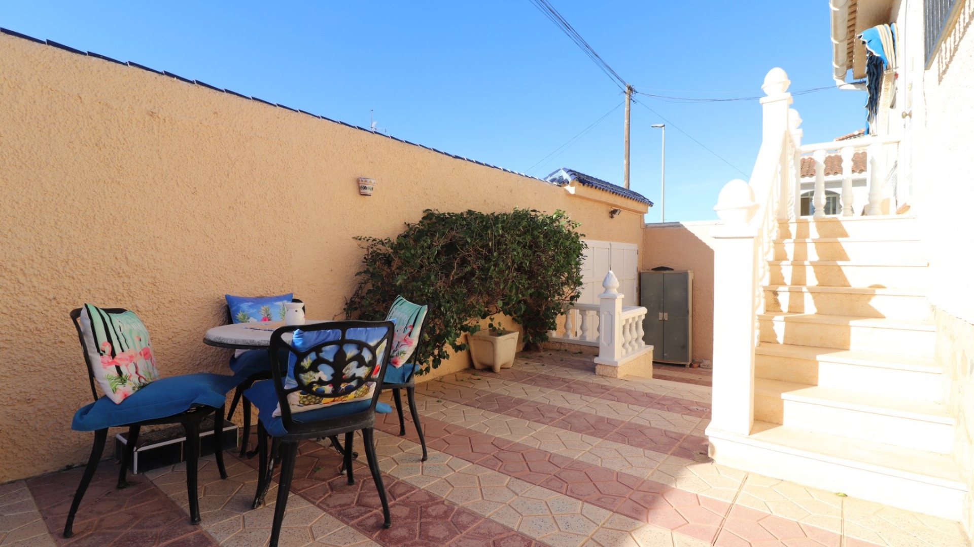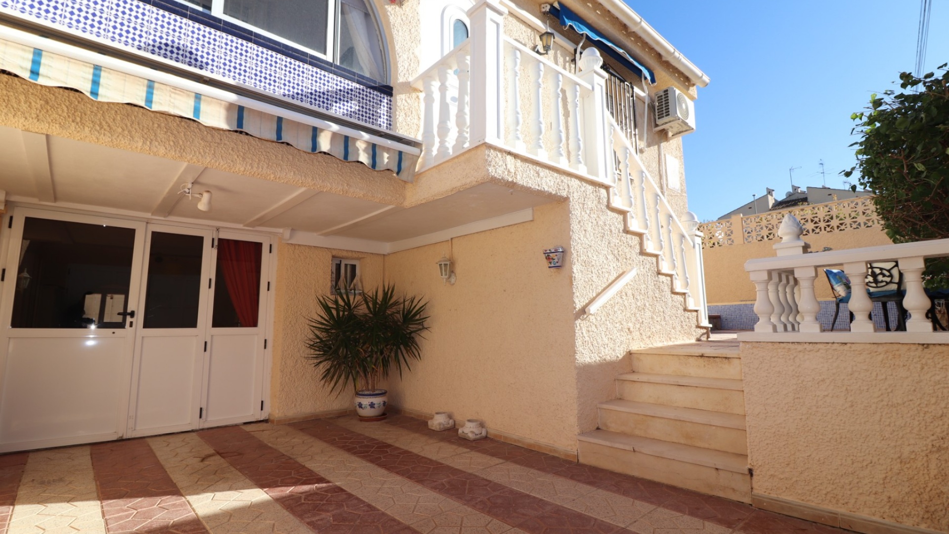 Cette villa individuelle de quatre chambres, exposée sud-ouest et avec sous-sol, est située à Benijofar dans un quartier recherché, à seulement cinq minutes à pied de nombreuses commodités, dont un terrain de sport, une école, un centre médical, une pharmacie et un centre commercial avec McDonald's, de nombreux restaurants et cafés. De plus, plusieurs grandes chaînes de supermarchés se trouvent à proximité. Le golf de La Marquesa est à seulement cinq minutes en voiture, et la magnifique côte sud de la Costa Blanca est à environ 12 minutes. Cette charmante villa dispose d'une terrasse couverte et vitrée donnant sur un salon chaleureux avec cheminée et climatisation. Une large arche relie le salon à la salle à manger, qui mène ensuite à une cuisine équipée. La propriété principale comprend deux chambres doubles avec placards intégrés, la chambre principale bénéficiant de la climatisation et d'une salle de bains privative. Une salle d'eau familiale est également disponible. Le sous-sol, accessible depuis l'extérieur, offre un espace supplémentaire avec deux chambres doubles (dont une avec salle de bain attenante), une autre salle d'eau familiale, une kitchenette, une buanderie et un espace de rangement, offrant une grande flexibilité pour les invités ou la famille élargie. L'extérieur comprend un jardin carrelé avec parking hors voirie, une piscine privée de 3 x 6, un barbecue, un espace de travail et des bordures plantées. C'est une opportunité fantastique pour une résidence principale ou une résidence secondaire sur la Costa Blanca Sud.