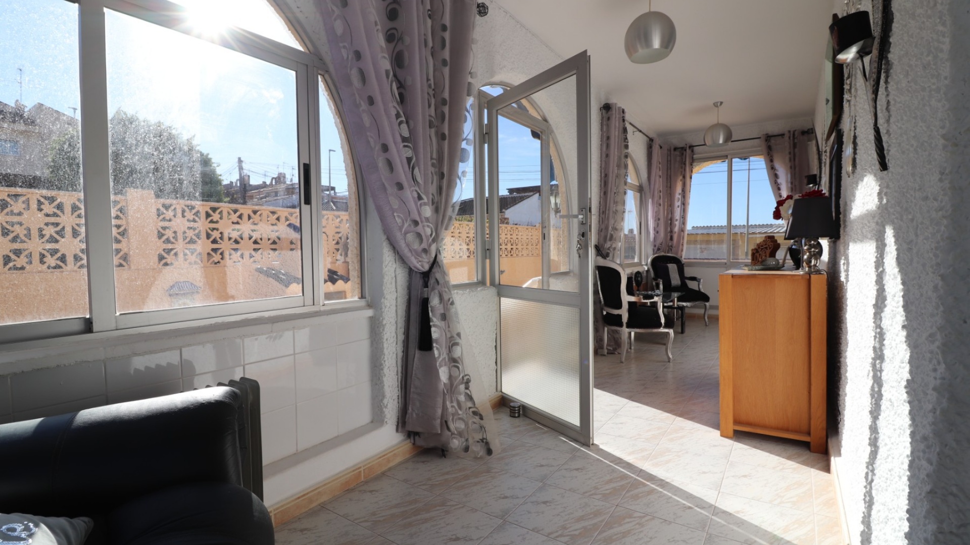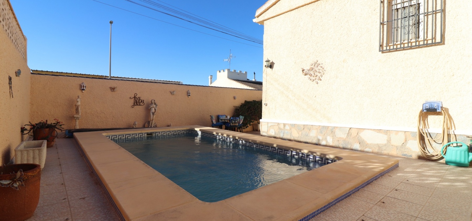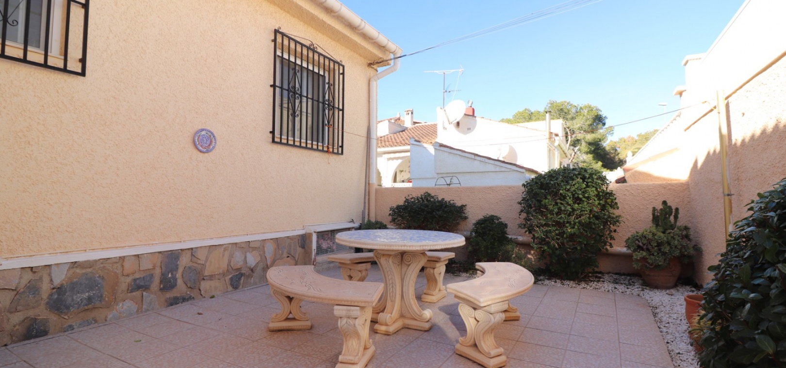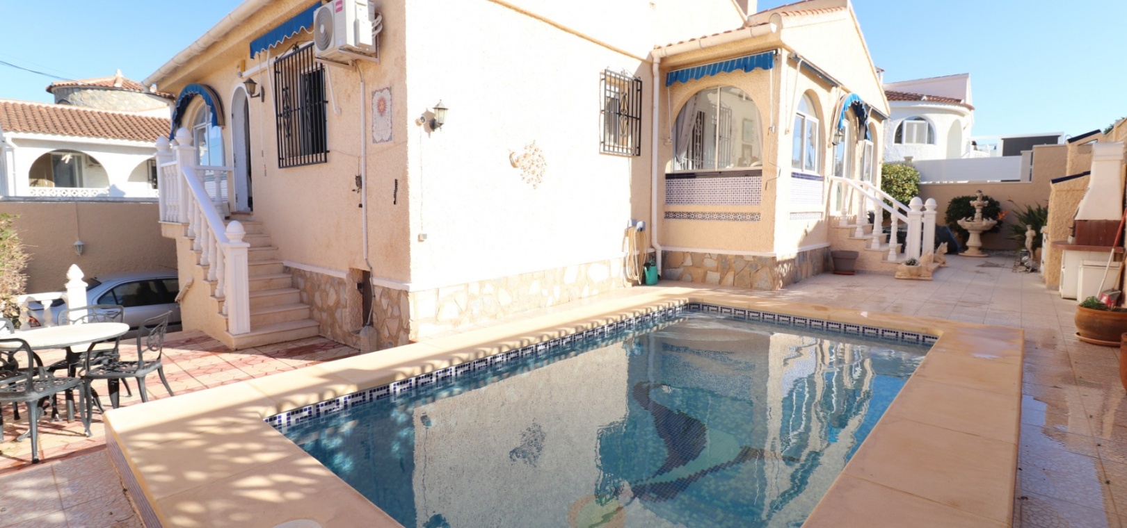Cette villa individuelle de quatre chambres, exposée sud-ouest et avec sous-sol, est située à Benijofar dans un quartier recherché, à seulement cinq minutes à pied de nombreuses commodités, dont un terrain de sport, une école, un centre médical, une pharmacie et un centre commercial avec McDonald's, de nombreux restaurants et cafés. De plus, plusieurs grandes chaînes de supermarchés se trouvent à proximité. Le golf de La Marquesa est à seulement cinq minutes en voiture, et la magnifique côte sud de la Costa Blanca est à environ 12 minutes. Cette charmante villa dispose d'une terrasse couverte et vitrée donnant sur un salon chaleureux avec cheminée et climatisation. Une large arche relie le salon à la salle à manger, qui mène ensuite à une cuisine équipée. La propriété principale comprend deux chambres doubles avec placards intégrés, la chambre principale bénéficiant de la climatisation et d'une salle de bains privative. Une salle d'eau familiale est également disponible. Le sous-sol, accessible depuis l'extérieur, offre un espace supplémentaire avec deux chambres doubles (dont une avec salle de bain attenante), une autre salle d'eau familiale, une kitchenette, une buanderie et un espace de rangement, offrant une grande flexibilité pour les invités ou la famille élargie. L'extérieur comprend un jardin carrelé avec parking hors voirie, une piscine privée de 3 x 6, un barbecue, un espace de travail et des bordures plantées. C'est une opportunité fantastique pour une résidence principale ou une résidence secondaire sur la Costa Blanca Sud.