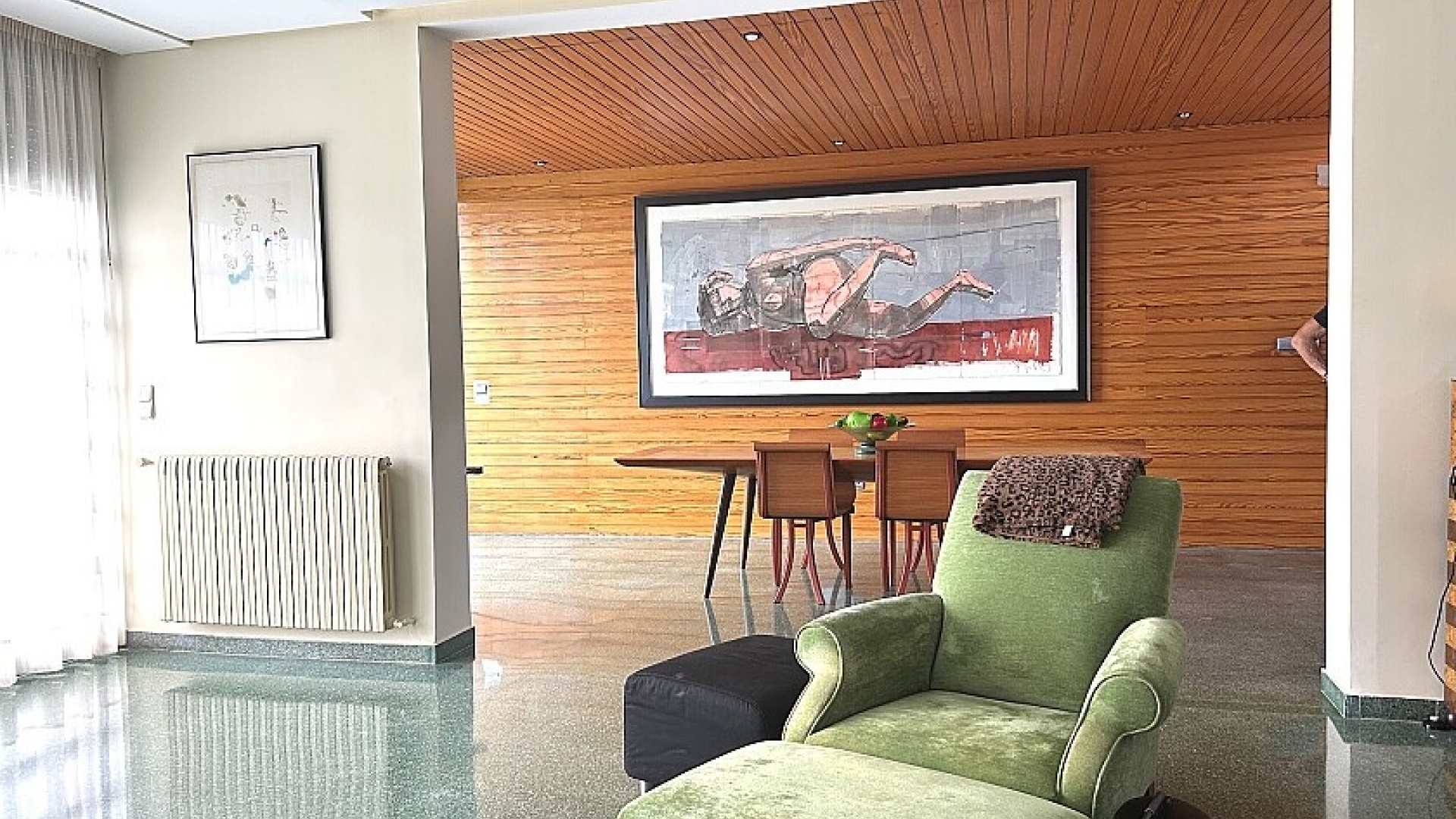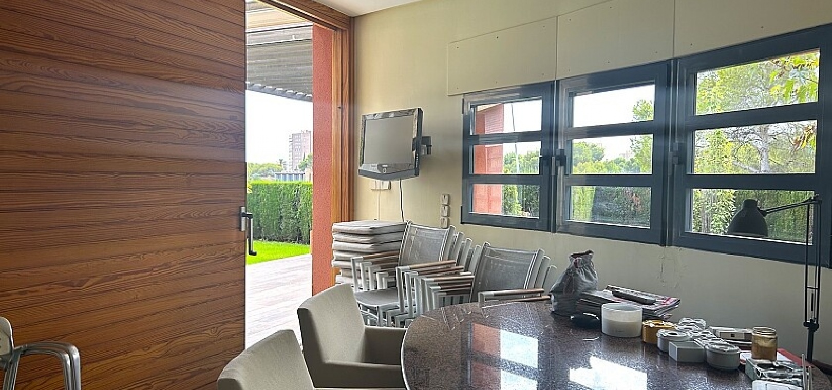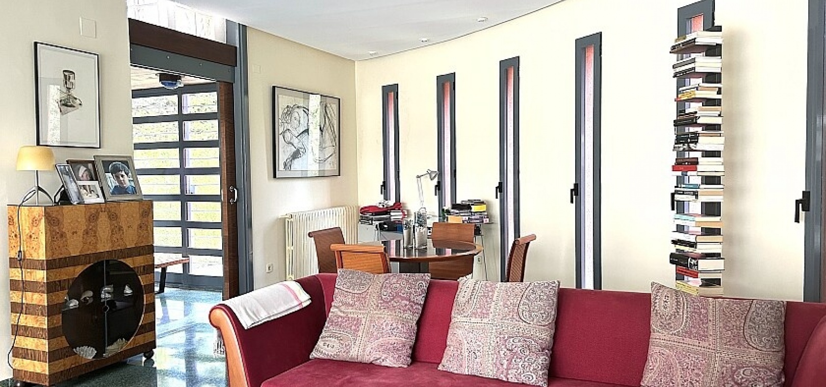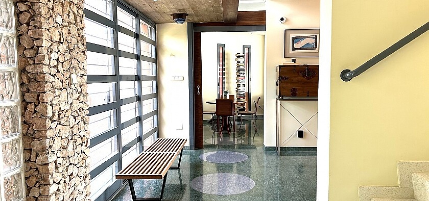 La maison a 413 m2 répartis sur trois étages. Au rez-de-chaussée, de 176 m2, il y a un grand séjour avec cheminée, cuisine séparée, salle à manger, débarras avec galerie et toilettes. Au premier étage, de 140 m2, se trouvent quatre grandes chambres avec leurs salles de bains et terrasses. Au sous-sol, d'une superficie de 96 m2, il y a un garage, un débarras et des locaux techniques.