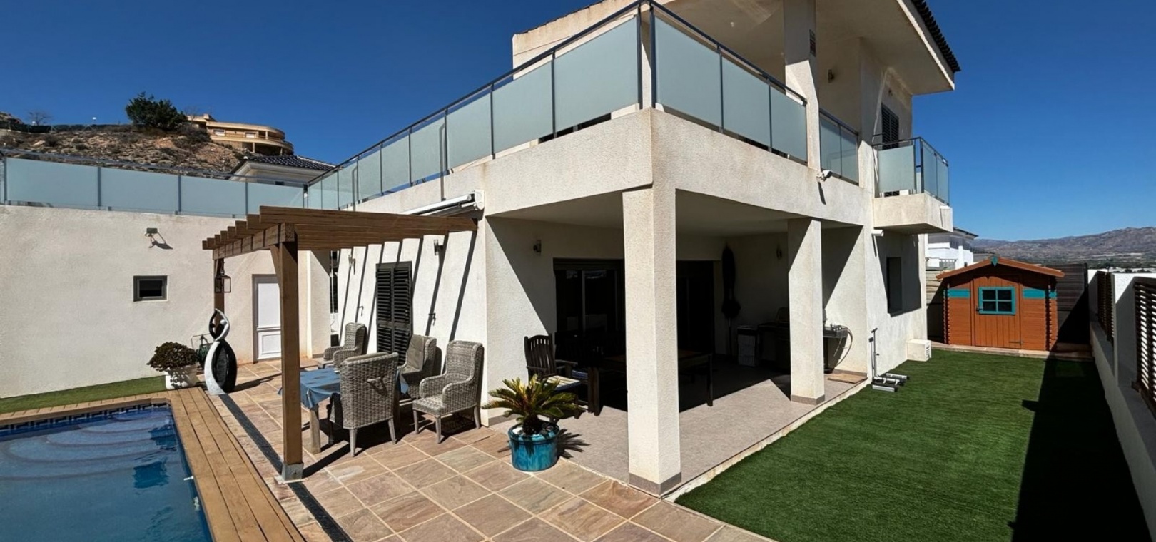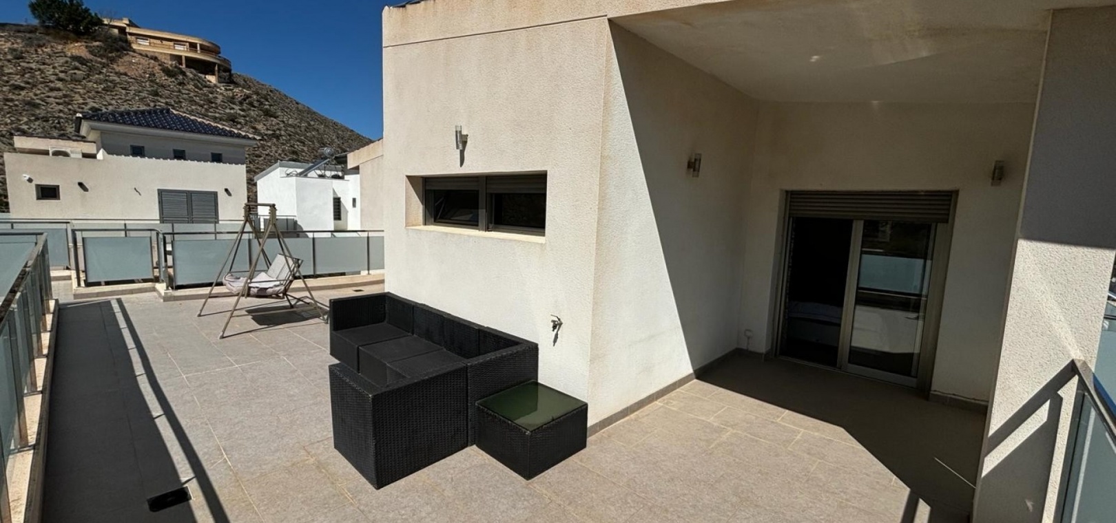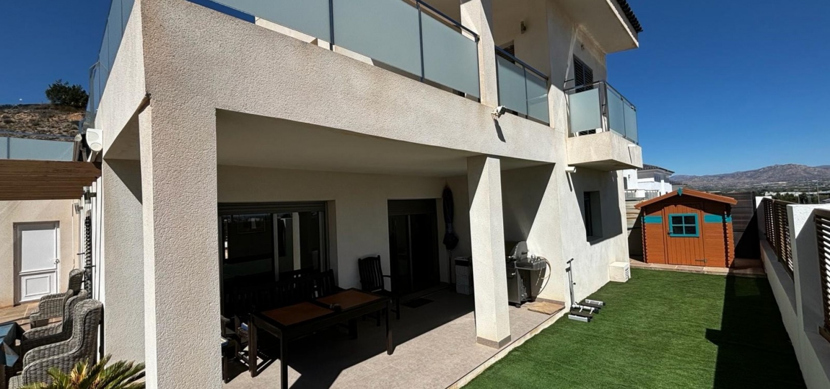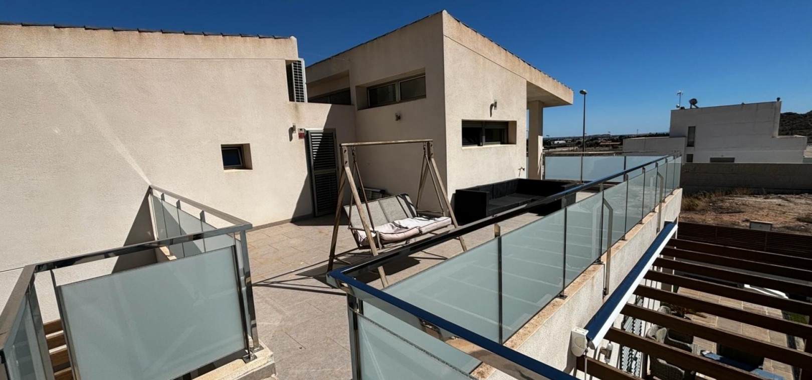 Nous avons ici une belle villa individuelle dans la campagne juste à l'extérieur de Cox, sur la Costa Blanca Sud. Cette spacieuse villa avec un terrain de 454 m2 et une construction de 167 m2, exposée plein sud et construite en 2009 par un seul propriétaire et se compose des éléments suivants : Au rez-de-chaussée, il y a un grand salon, des toilettes séparées, une chambre double avec accès au jardin et salle de douche attenante, une salle à manger ouverte et une cuisine entièrement équipée avec buanderie séparée de la cuisine avec accès au jardin. A l'étage se trouvent deux chambres doubles de bonne taille, toutes deux avec leur propre salle de bains aux couleurs coordonnées, une baignoire indépendante dans la salle de bains principale, un accès aux balcons et un grand solarium avec une vue imprenable sur les montagnes,
