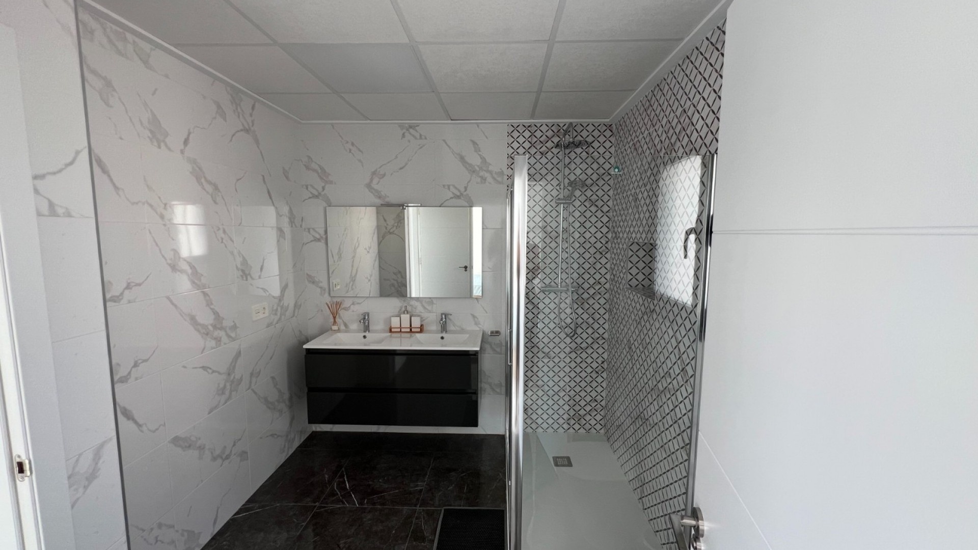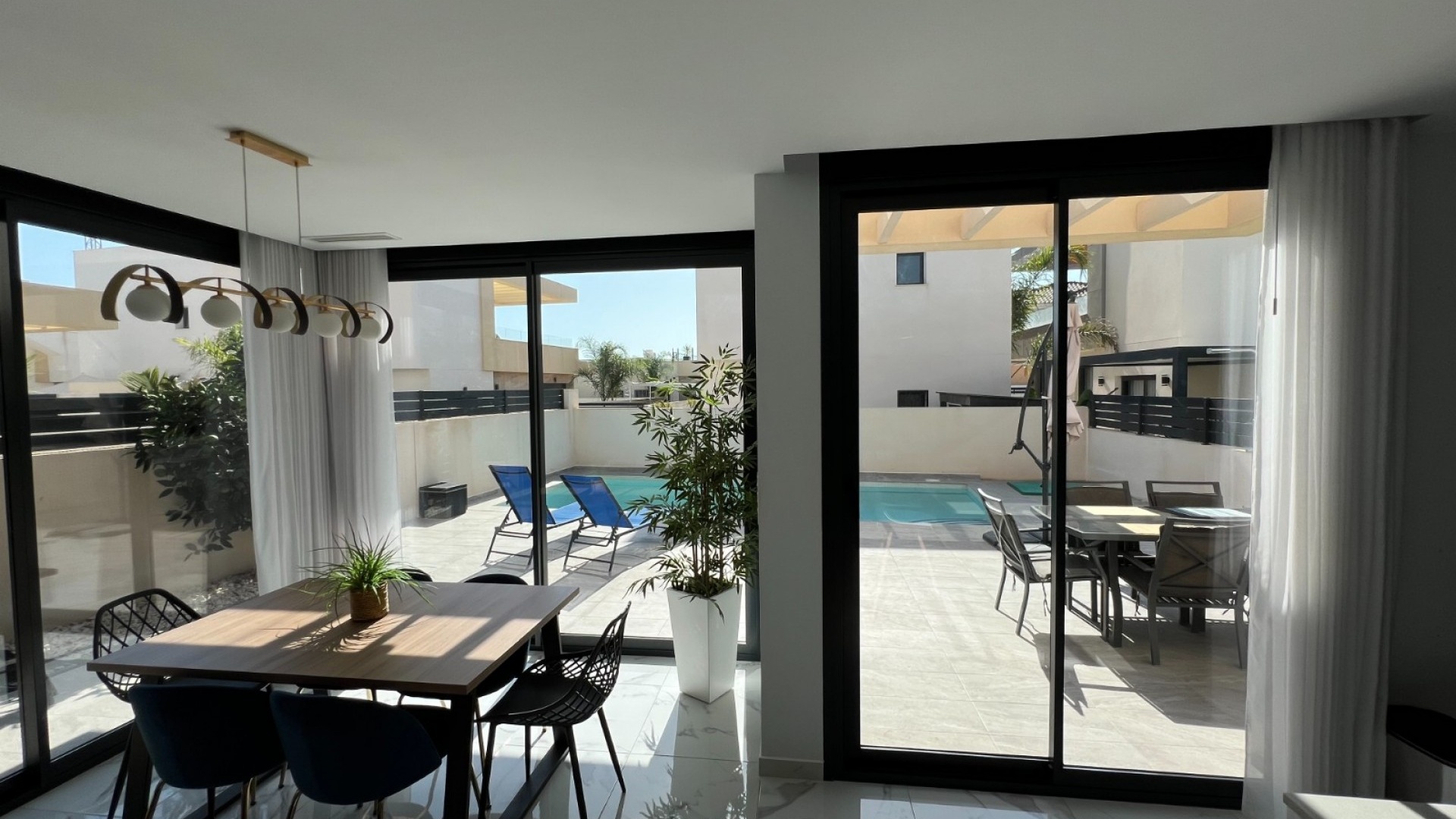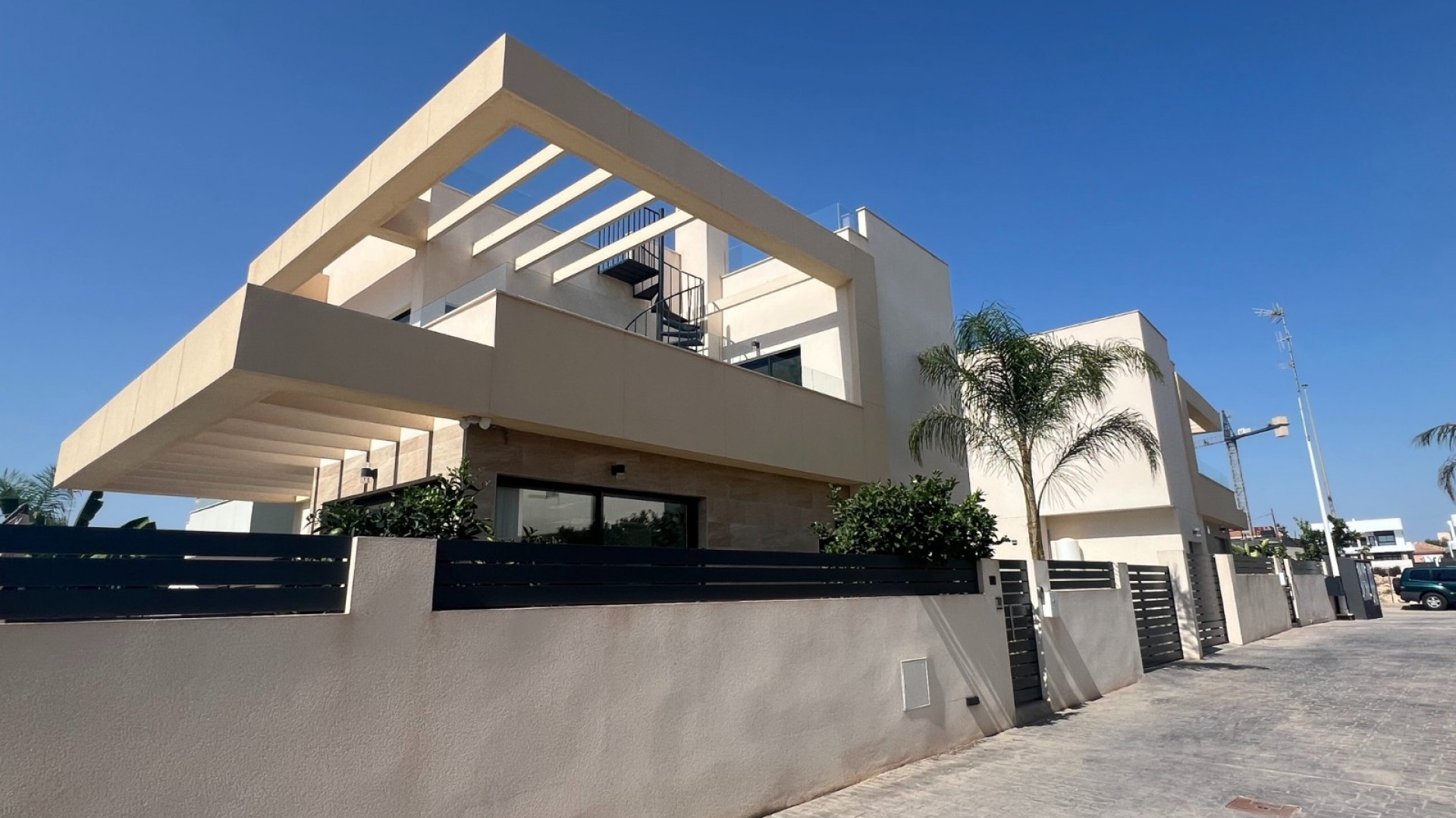 Cette villa moderne, construite en 2021, incarne le design contemporain et la vie de luxe. Située à La Herrada, Los Montesinos, la villa couvre une superficie construite d'environ 115 m² sur un terrain de 225 m² orienté sud et est, assurant une lumière naturelle abondante tout au long de la journée. Le rez-de-chaussée témoigne d'un espace de vie ouvert, avec une cuisine spacieuse parfaitement intégrée à un salon et une salle à manger. Trois grandes baies vitrées inondent l'espace de lumière et offrent une vue imprenable sur la piscine privée et une grande terrasse ensoleillée, parfaite pour la détente et les divertissements en plein air. La villa dispose de trois chambres aux dimensions généreuses, chacune équipée de nombreux placards. Deux de ces chambres comprennent une salle de bains privative, offrant intimité et commodité. Une chambre se distingue par son accès à un grand balcon, un endroit idéal pour le café du matin ou la détente en soirée. En plus de la terrasse et du balcon, la villa comprend un grand solarium, offrant une vue imprenable sur les environs, y compris les magnifiques lacs salés. Cette propriété est un excellent choix pour ceux qui recherchent une maison moderne et élégante dans un quartier paisible mais bien desservi.