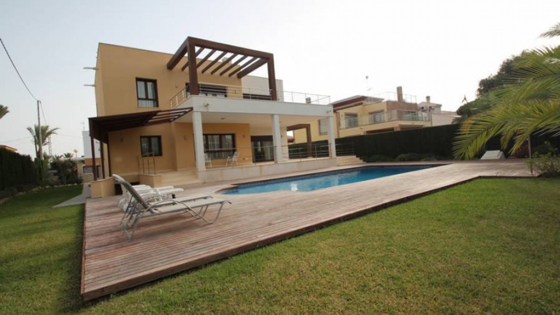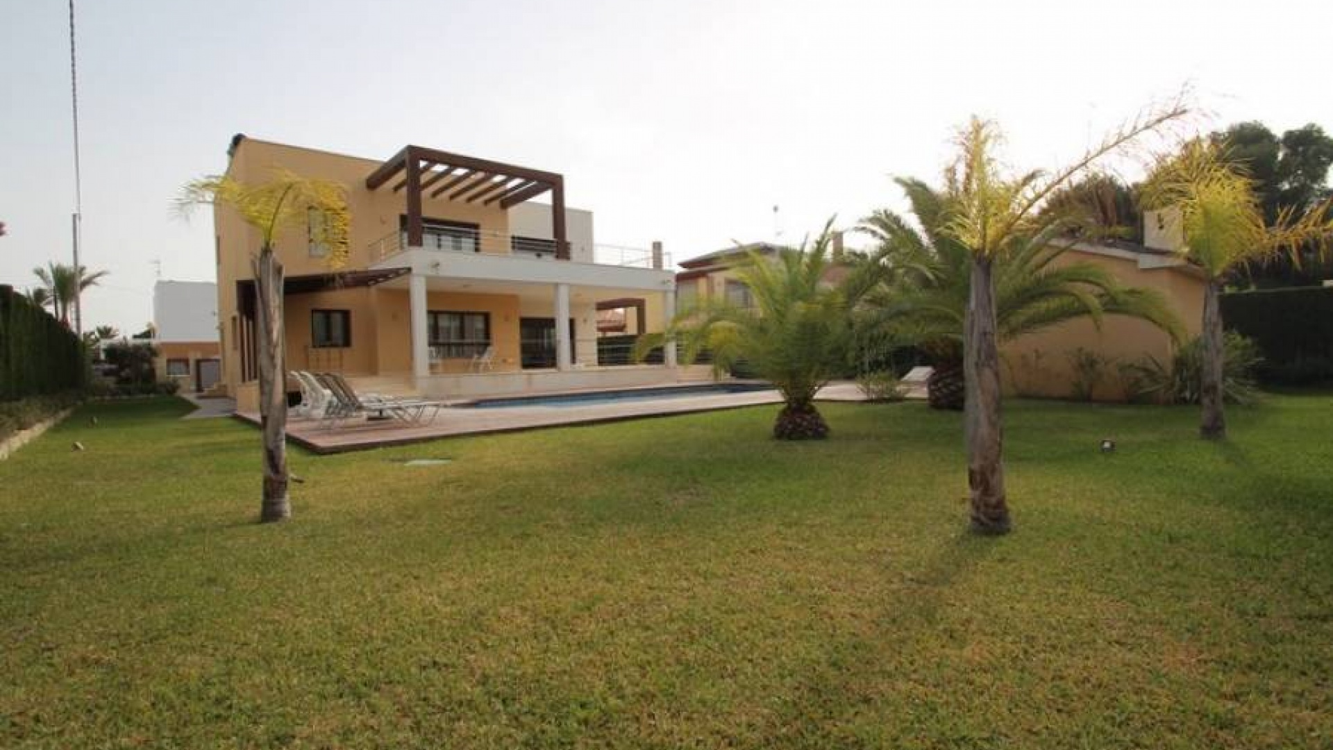 Cabo Roig, Villa de 1.095 mètres de terrain et 477 m2 de logements construits avec 5 chambres, 5 salles de bains, 2 toilettes, salon, cuisine et cellier.~Salle de jeux, salle des machines et sauna et 4 terrasses.~Piscine privée 10x5, barbecue.~Toutes les maisons sont domotizadas, climatisation, meublées à 300 mètres de la plage~