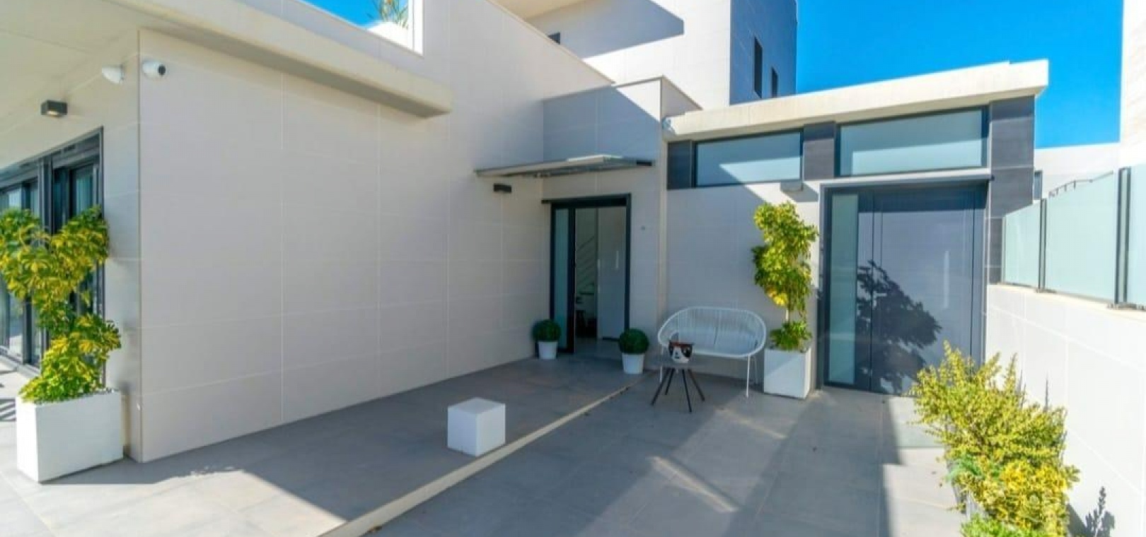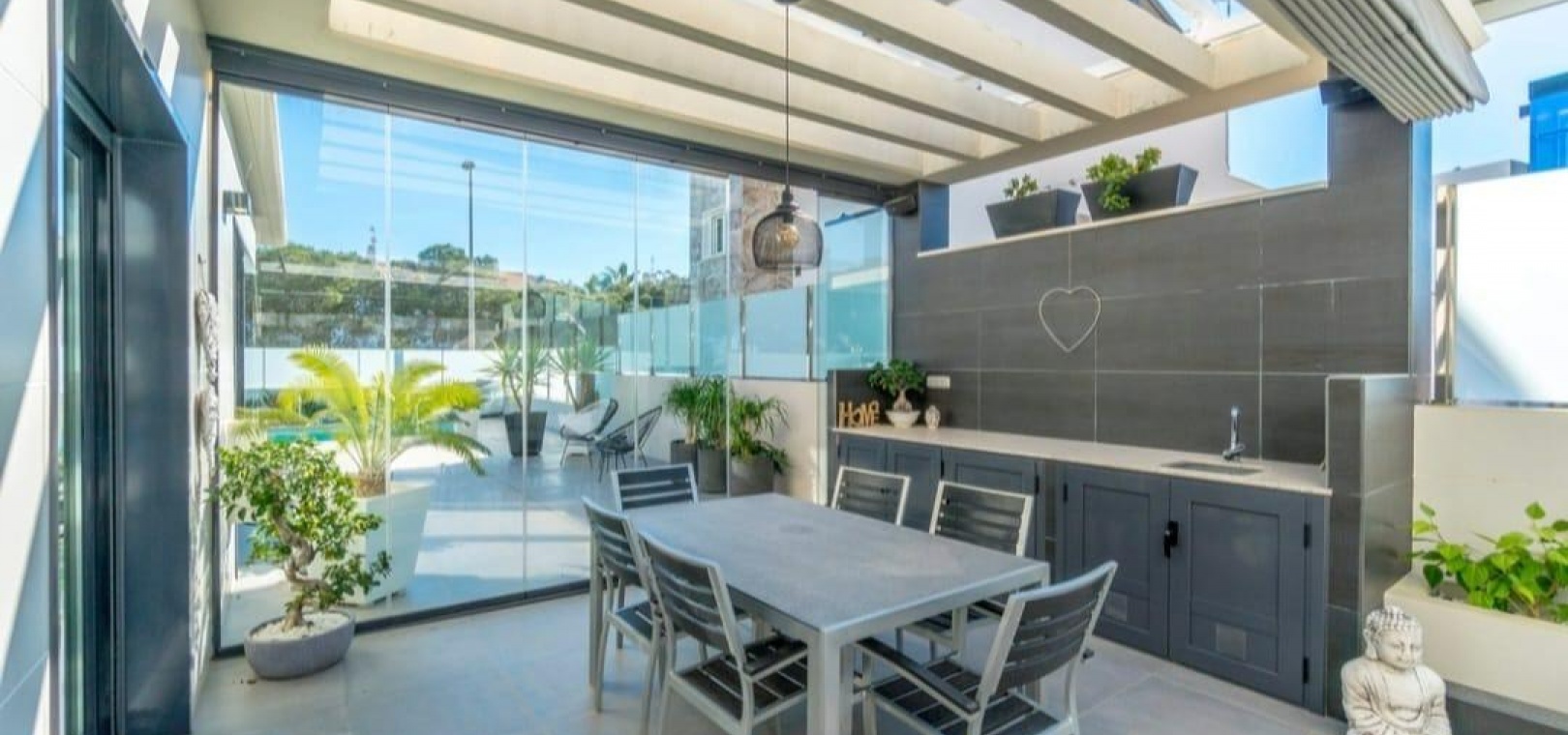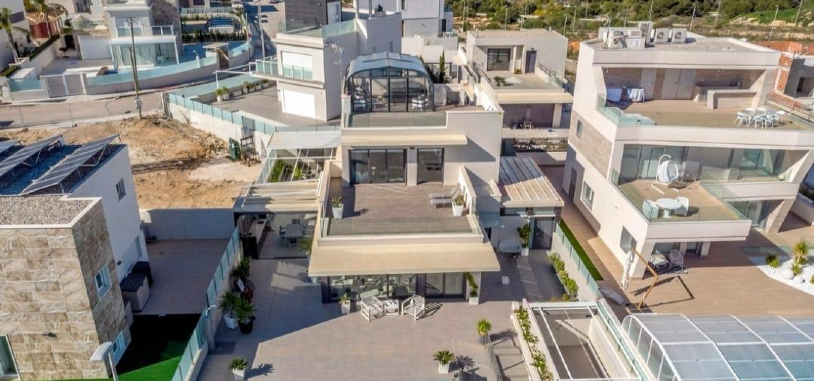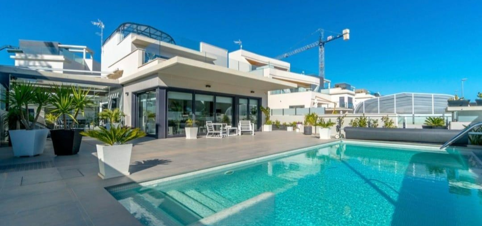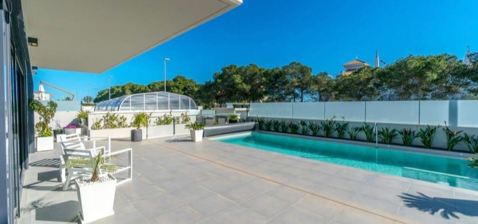 Campoamor, Villa de luxe moderne avec un terrain de 479 m2 et une maison de 234 m2 avec 3 chambres (dont 2 au rez-de-chaussée), 3 salles de bains, grand salon, cuisine avec îlot, grande terrasse, piscine privée, solarium avec zone vitrée et jacuzzi avec vue sur la mer, espace barbecue, vendu meublé, avec place de parking sur le terrain et à distance de marche de la plage d'Aguamarina.~