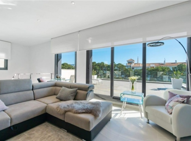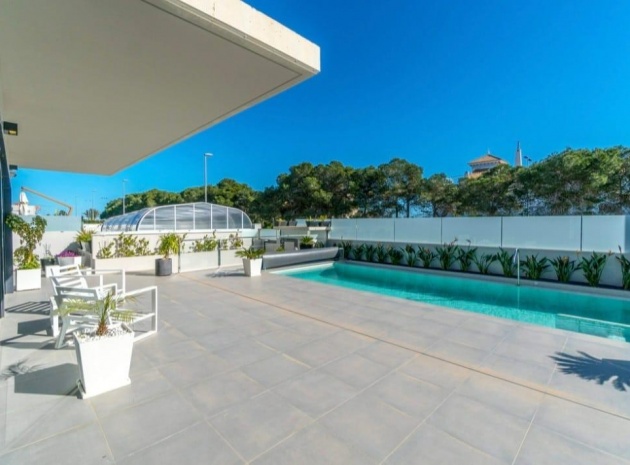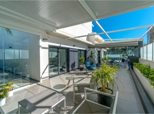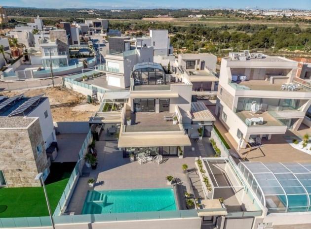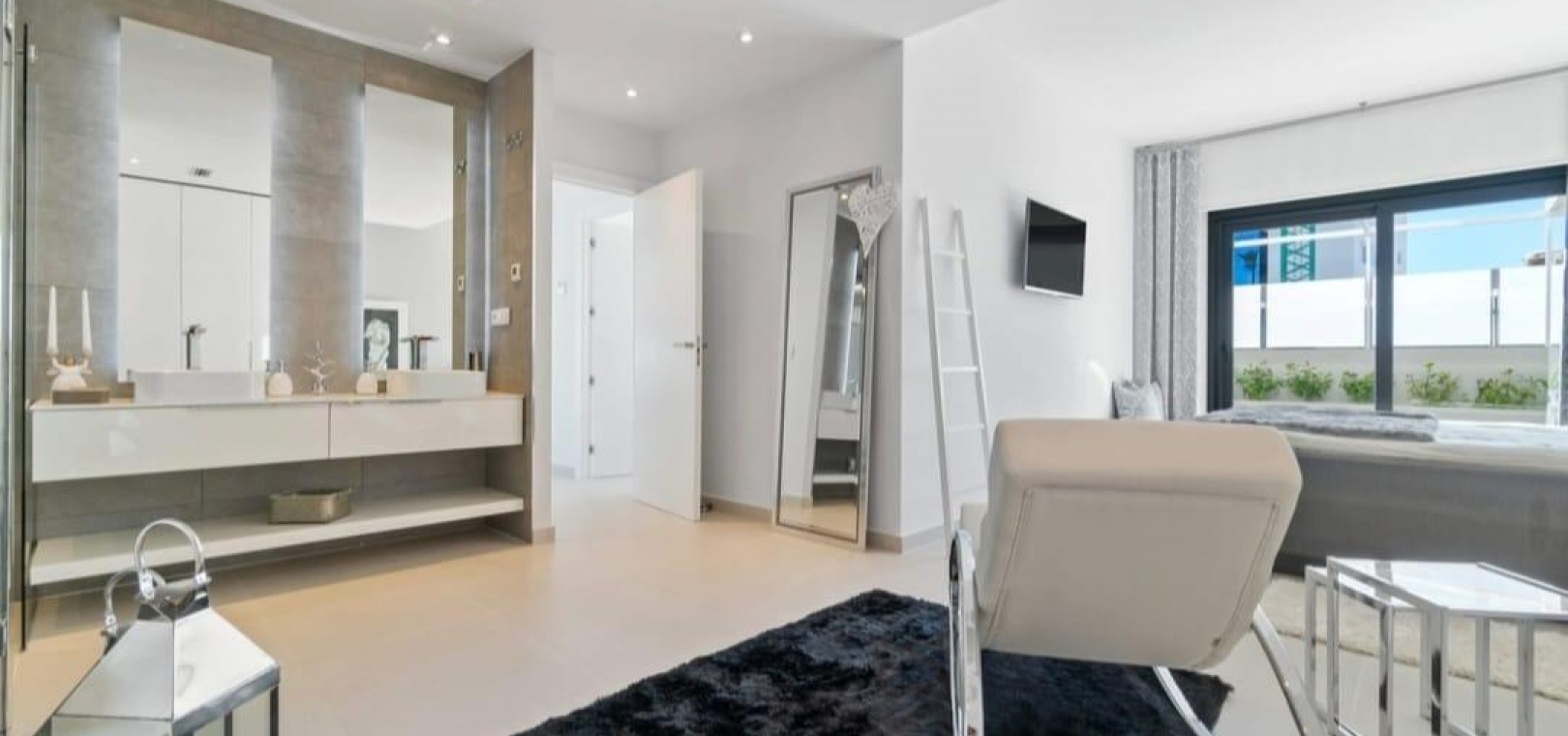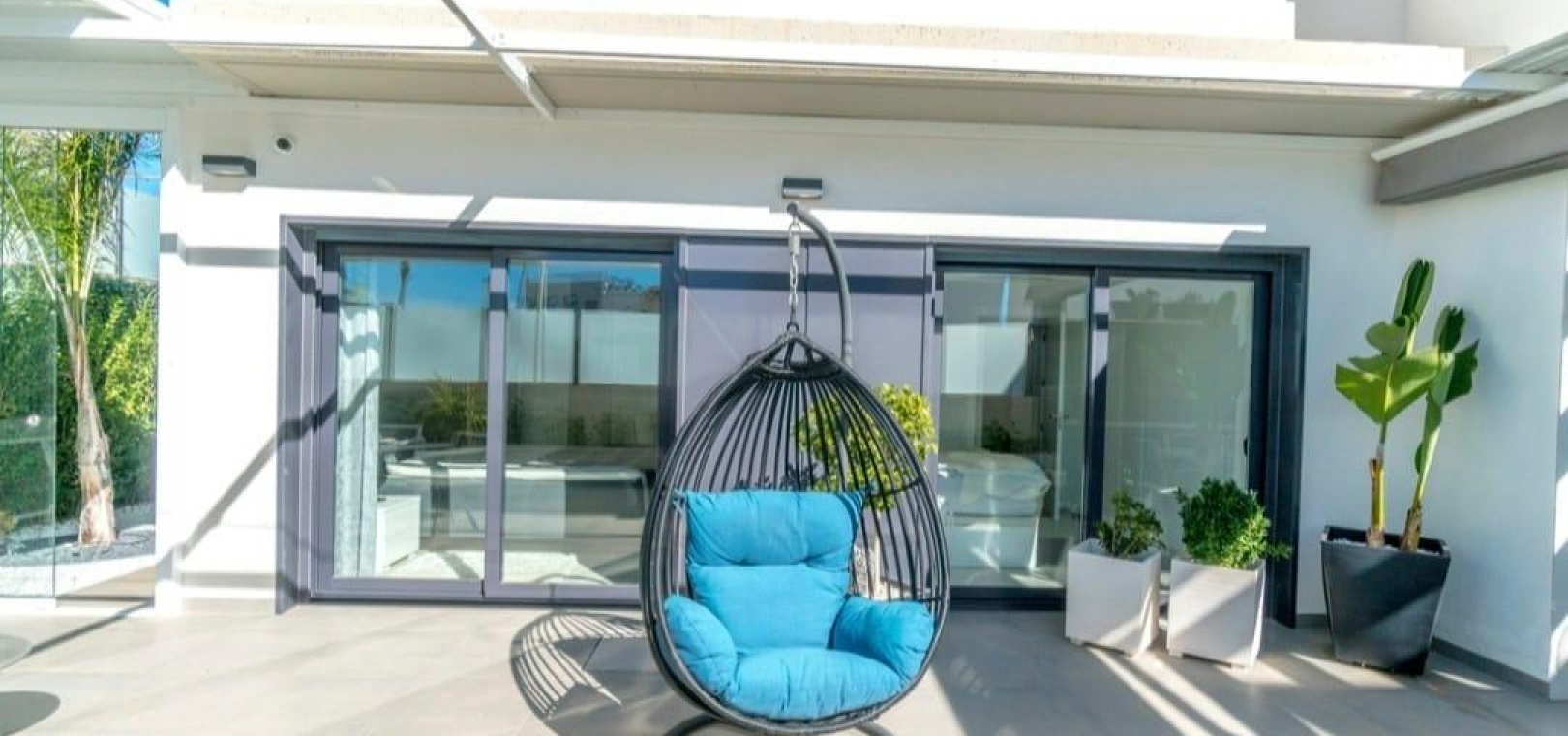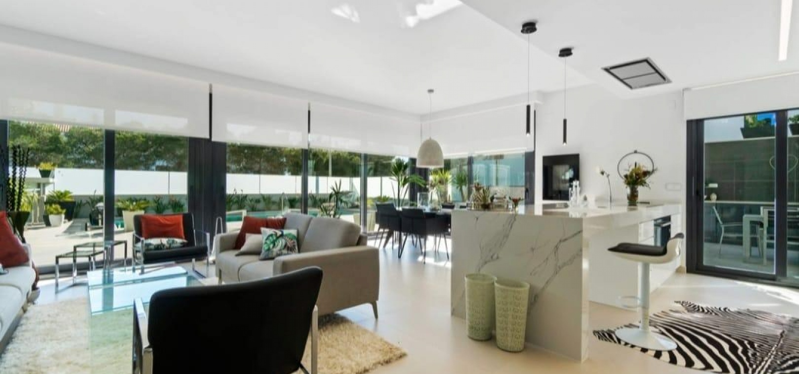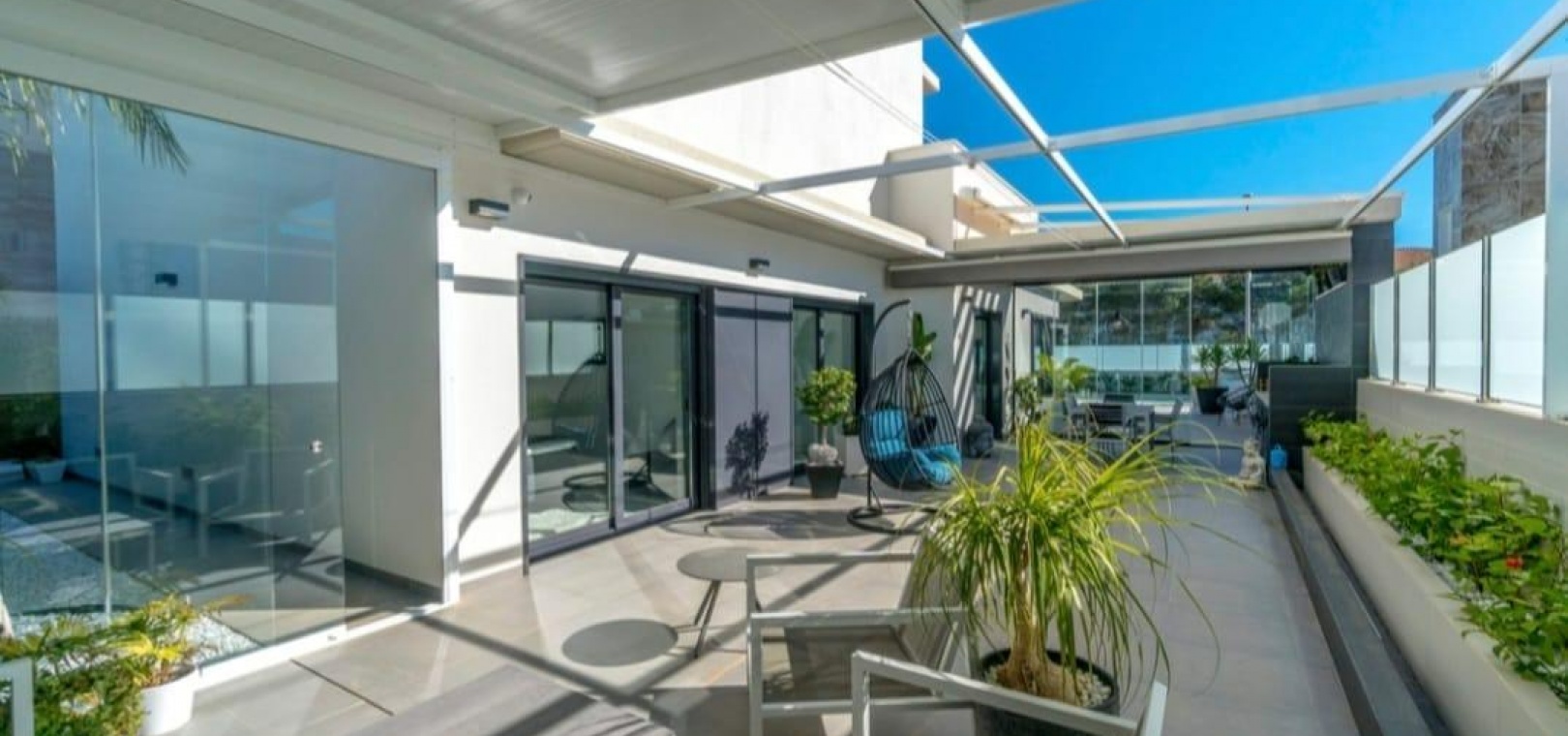 Campoamor, Villa de luxe moderne avec un terrain de 479 m2 et une maison de 234 m2 avec 3 chambres (dont 2 au rez-de-chaussée), 3 salles de bains, grand salon, cuisine avec îlot, grande terrasse, piscine privée, solarium avec zone vitrée et jacuzzi avec vue sur la mer, espace barbecue, vendu meublé, avec place de parking sur le terrain et à distance de marche de la plage d'Aguamarina.~