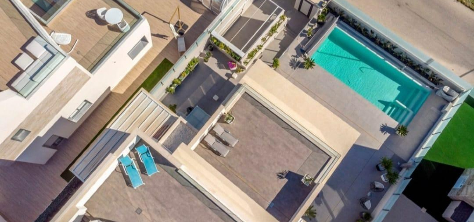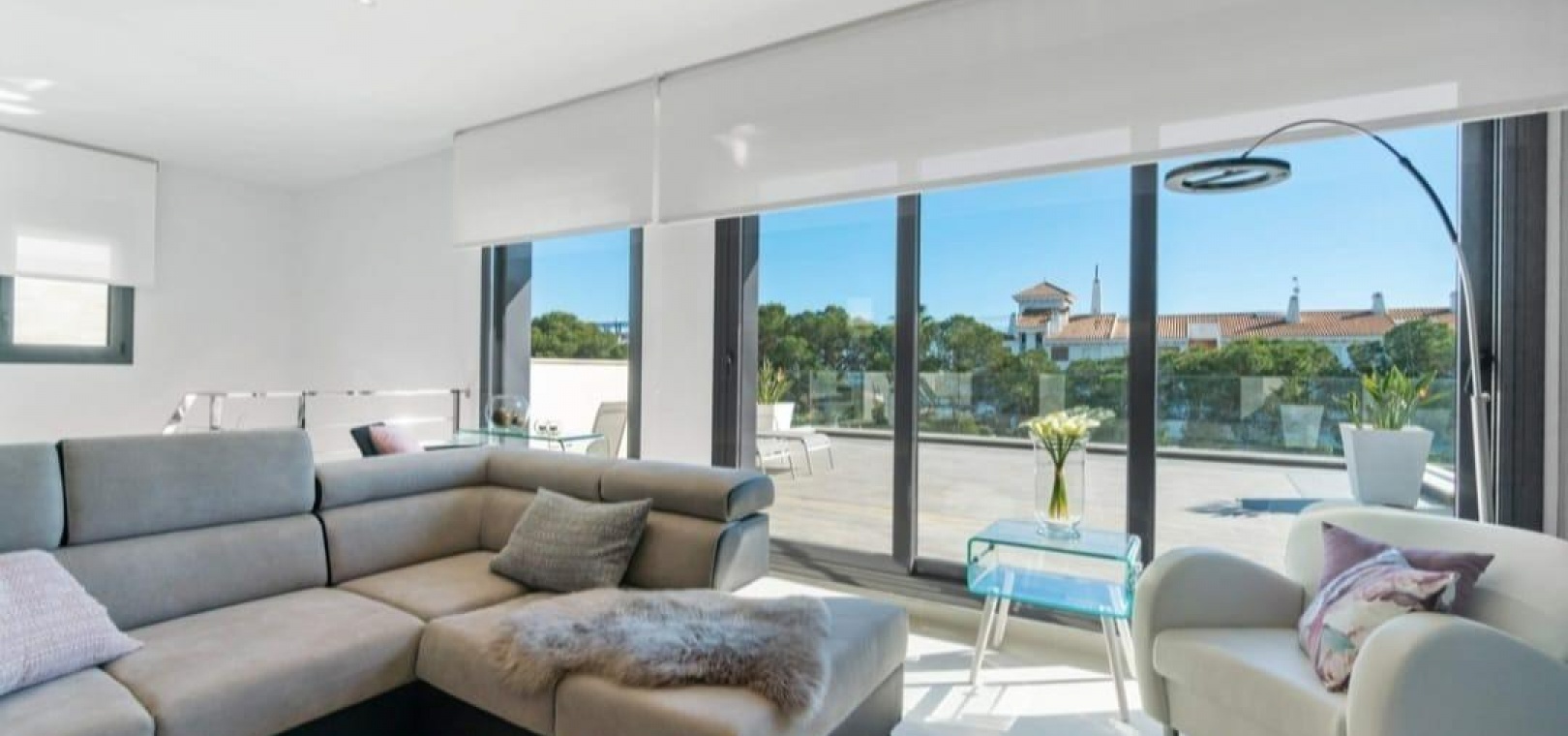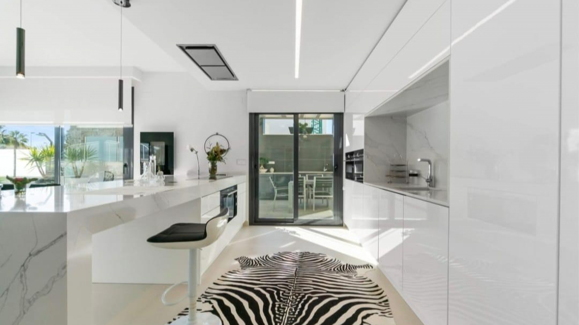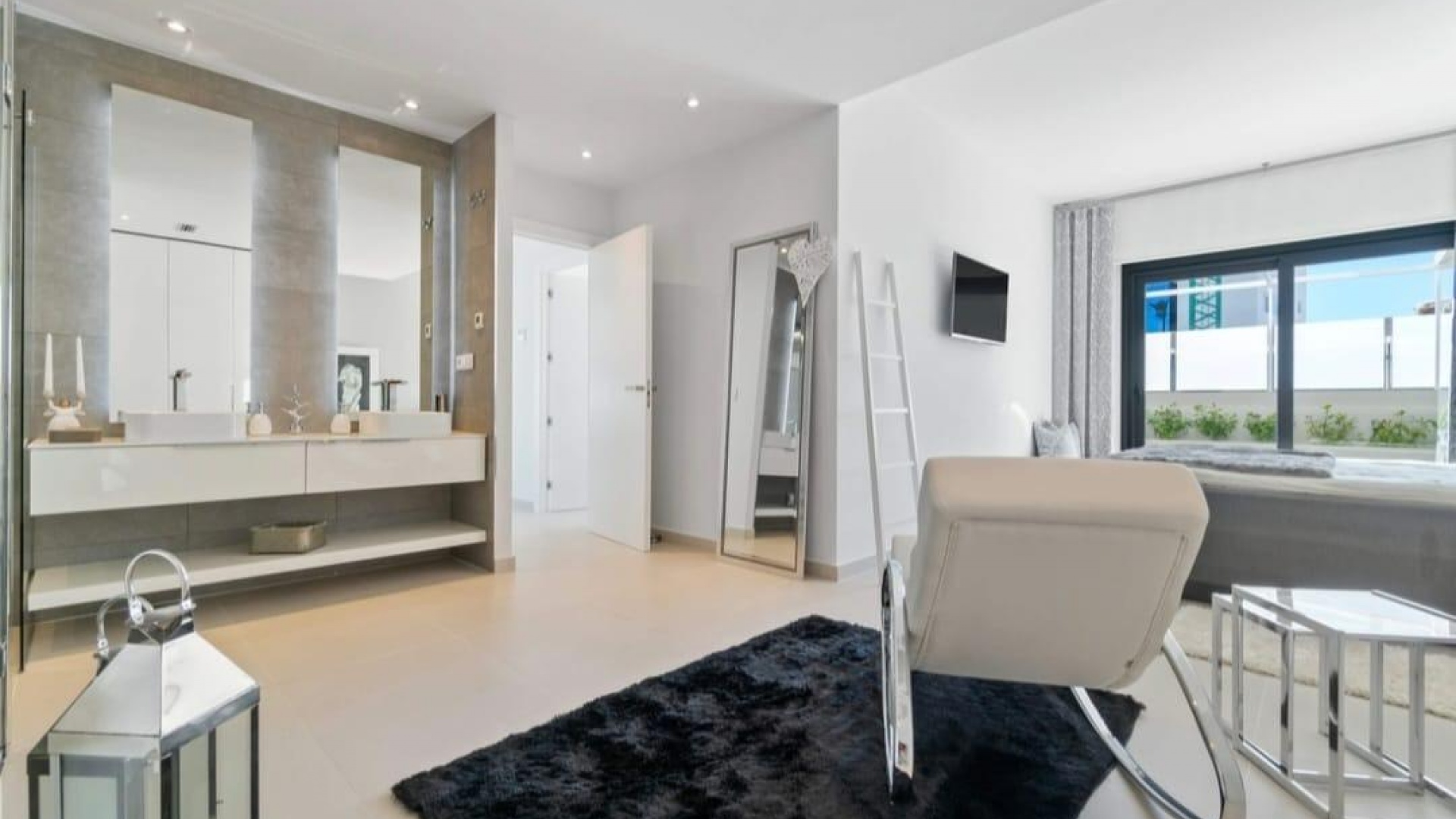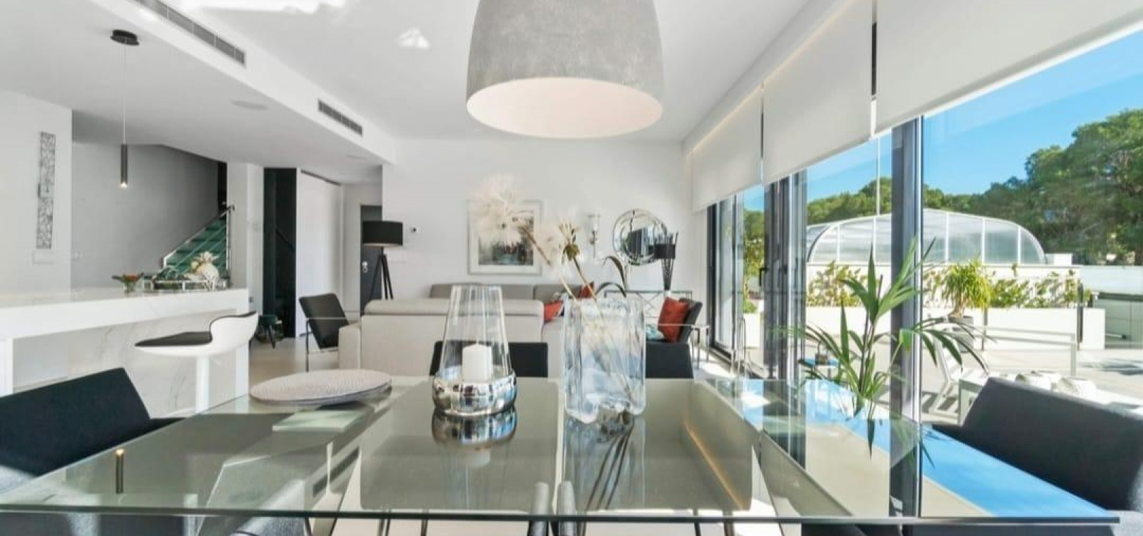 Campoamor, Villa de luxe moderne avec un terrain de 479 m2 et une maison de 234 m2 avec 3 chambres (dont 2 au rez-de-chaussée), 3 salles de bains, grand salon, cuisine avec îlot, grande terrasse, piscine privée, solarium avec zone vitrée et jacuzzi avec vue sur la mer, espace barbecue, vendu meublé, avec place de parking sur le terrain et à distance de marche de la plage d'Aguamarina.~