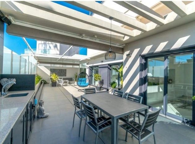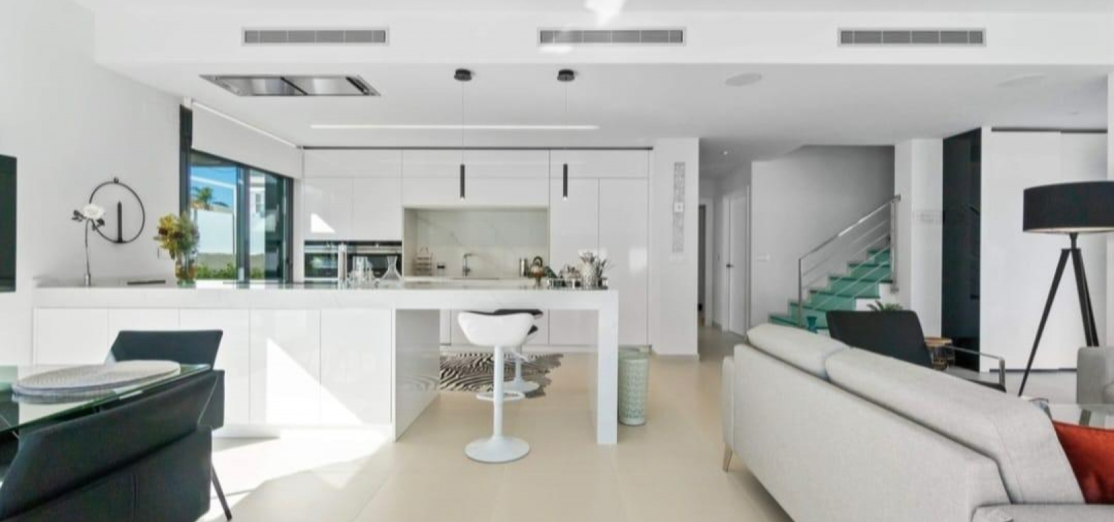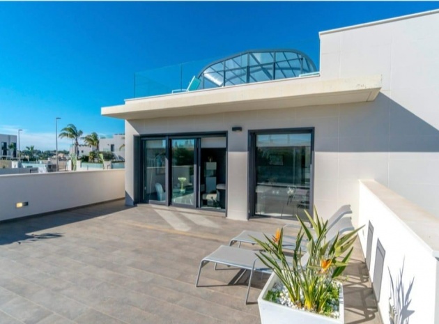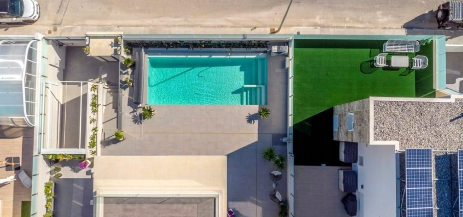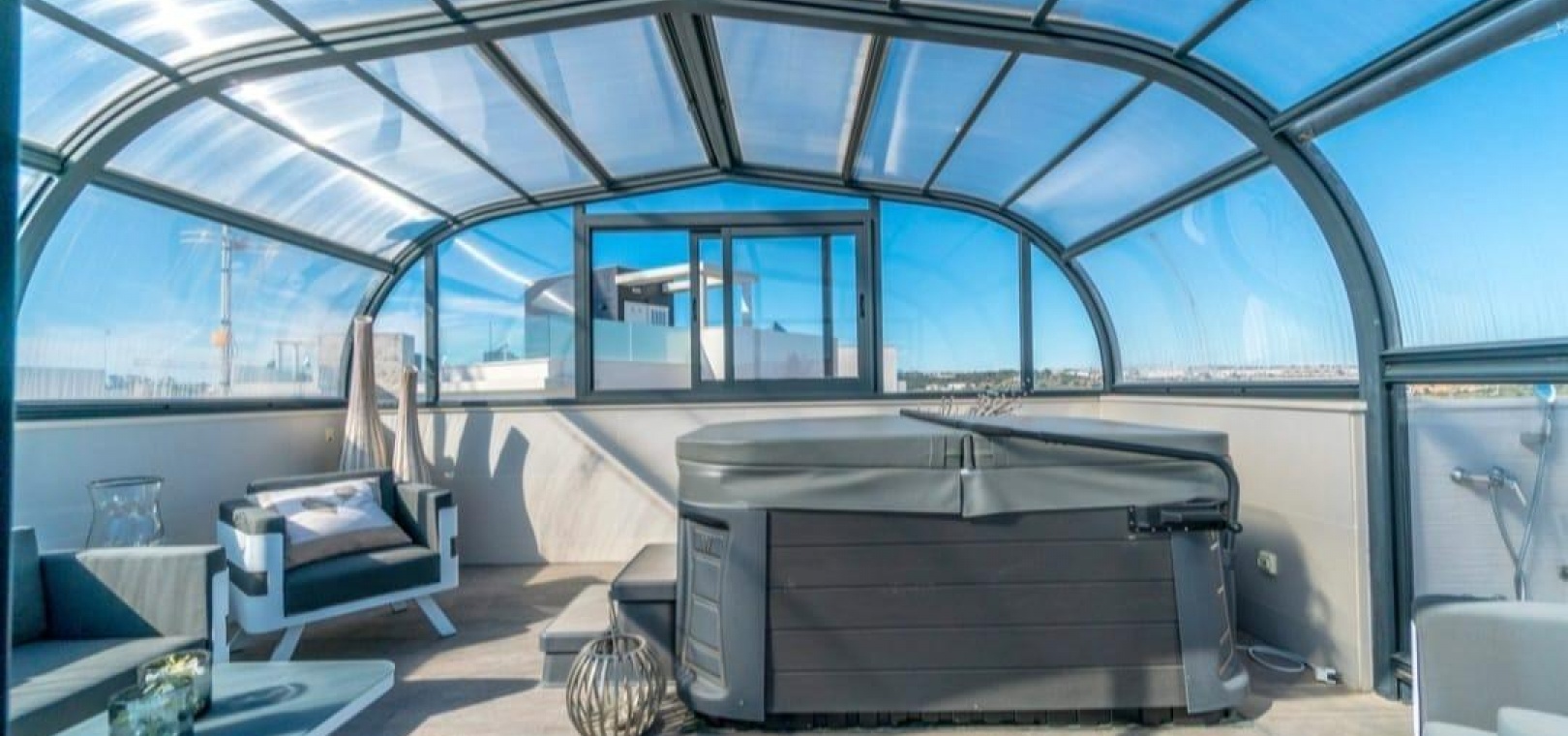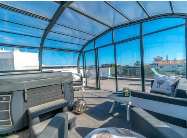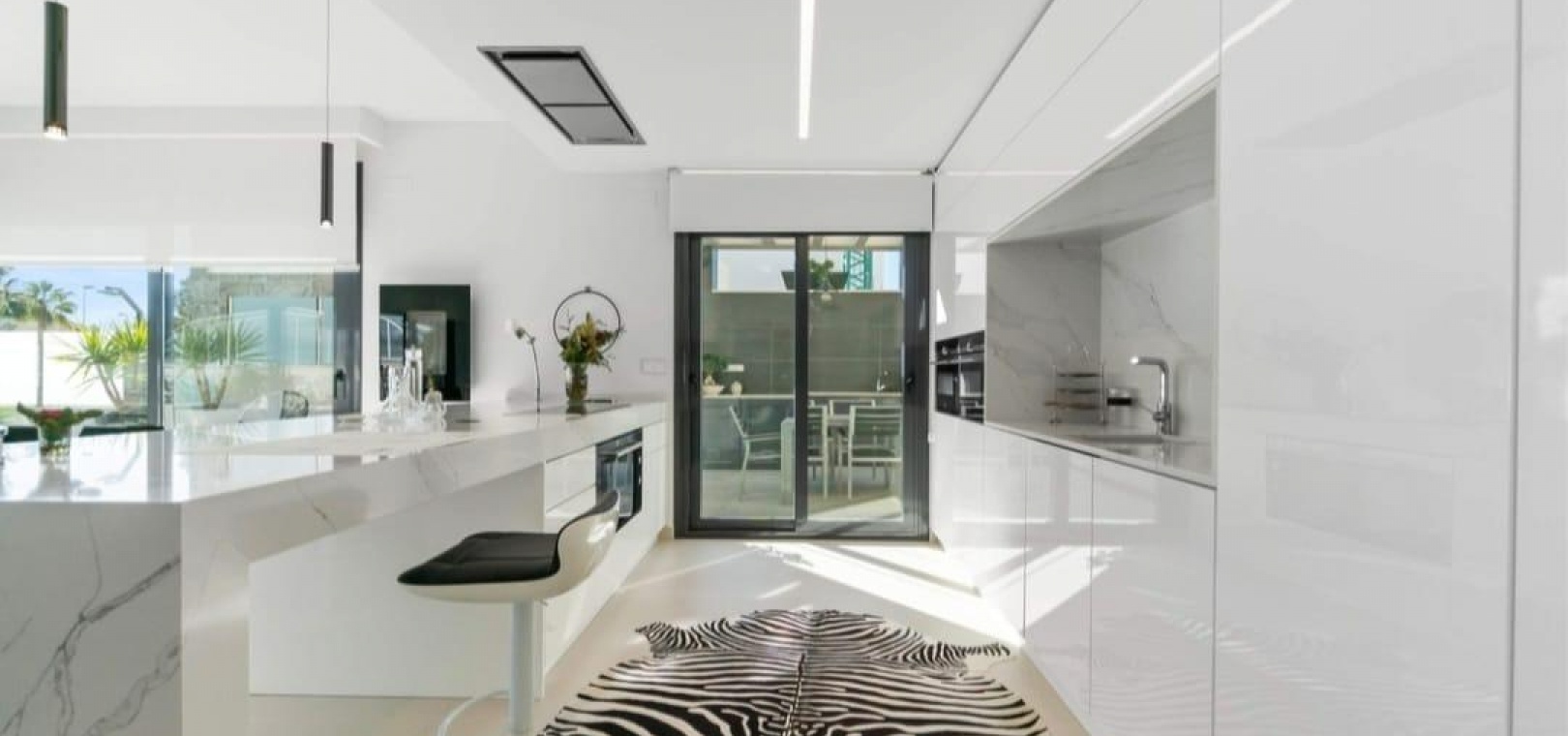 Campoamor, Villa de luxe moderne avec un terrain de 479 m2 et une maison de 234 m2 avec 3 chambres (dont 2 au rez-de-chaussée), 3 salles de bains, grand salon, cuisine avec îlot, grande terrasse, piscine privée, solarium avec zone vitrée et jacuzzi avec vue sur la mer, espace barbecue, vendu meublé, avec place de parking sur le terrain et à distance de marche de la plage d'Aguamarina.~