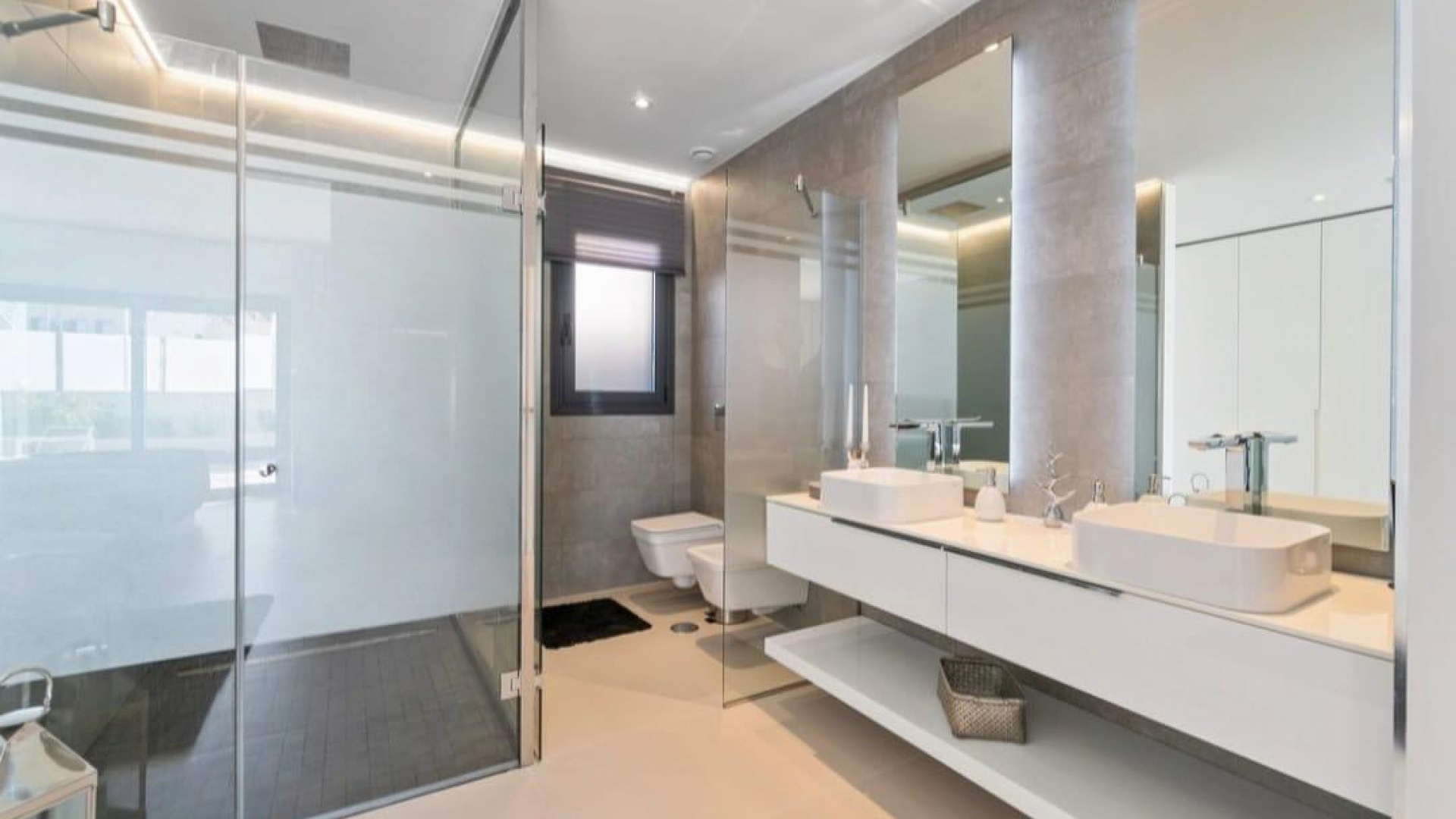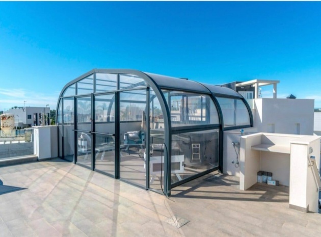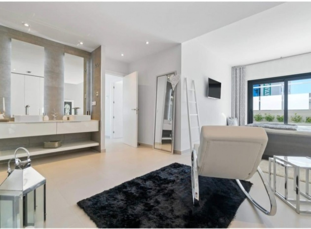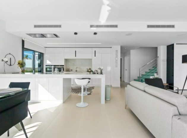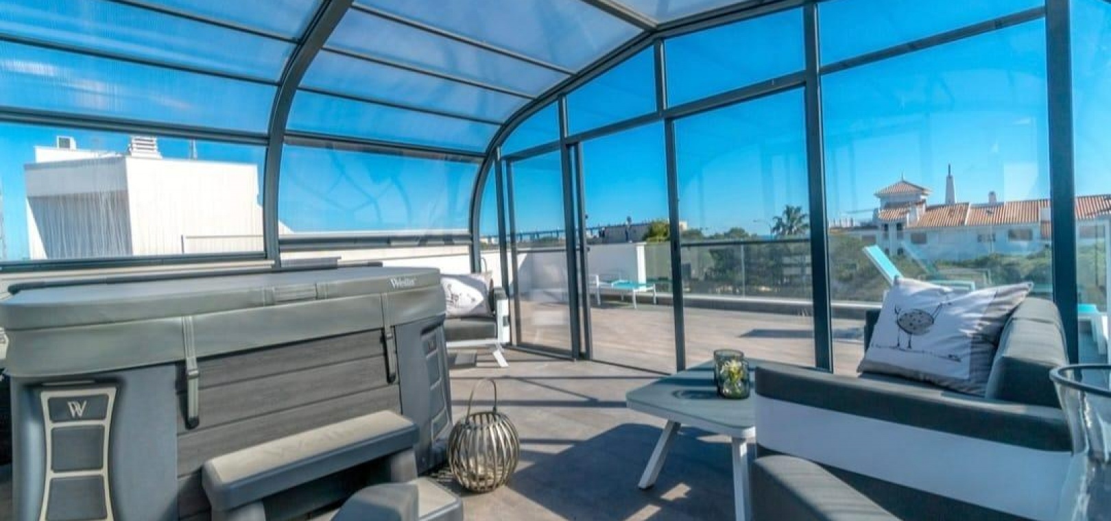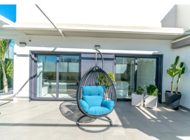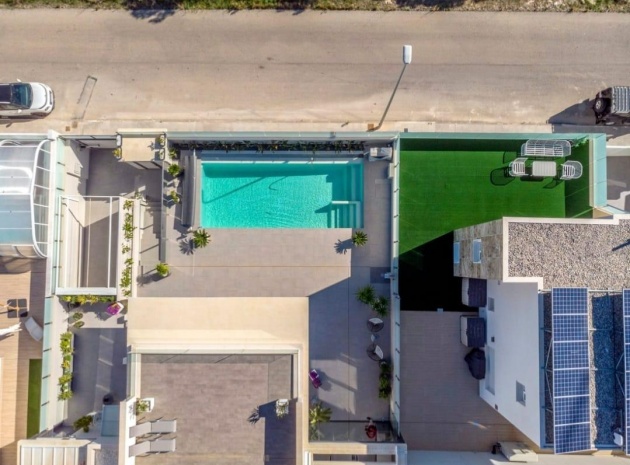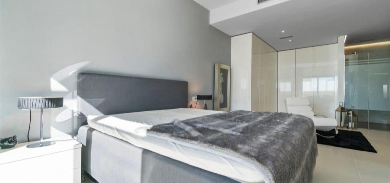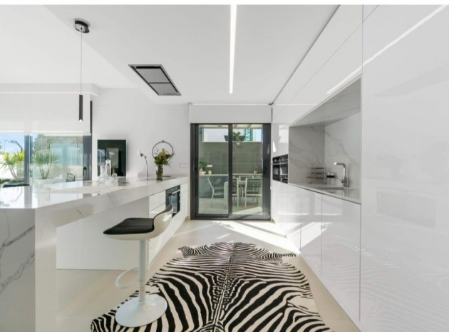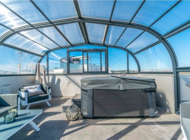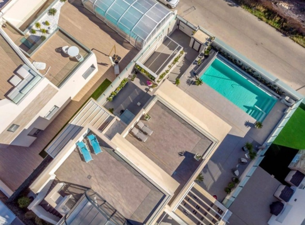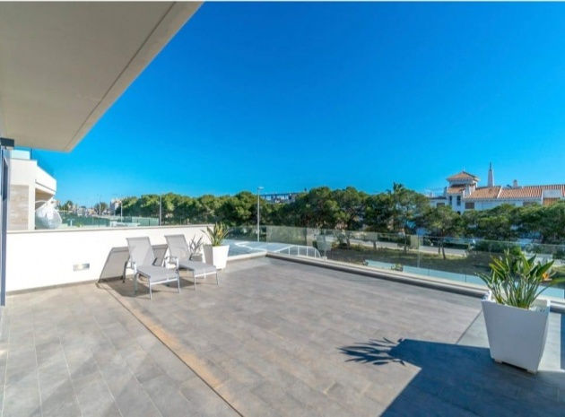 Campoamor, Villa de luxe moderne avec un terrain de 479 m2 et une maison de 234 m2 avec 3 chambres (dont 2 au rez-de-chaussée), 3 salles de bains, grand salon, cuisine avec îlot, grande terrasse, piscine privée, solarium avec zone vitrée et jacuzzi avec vue sur la mer, espace barbecue, vendu meublé, avec place de parking sur le terrain et à distance de marche de la plage d'Aguamarina.~