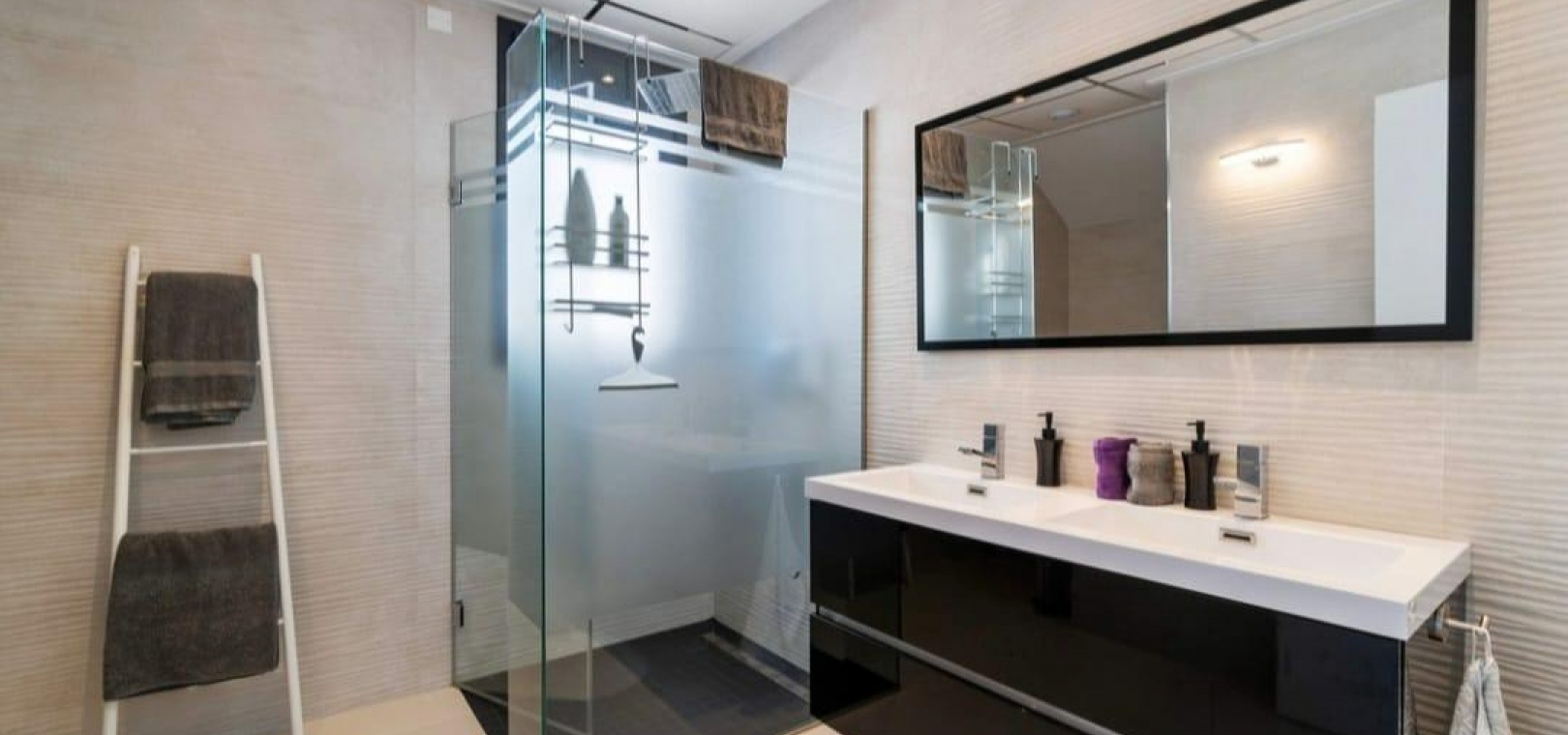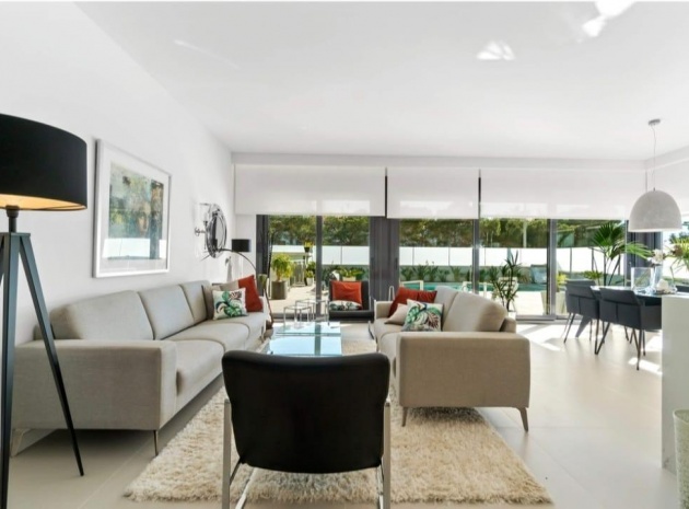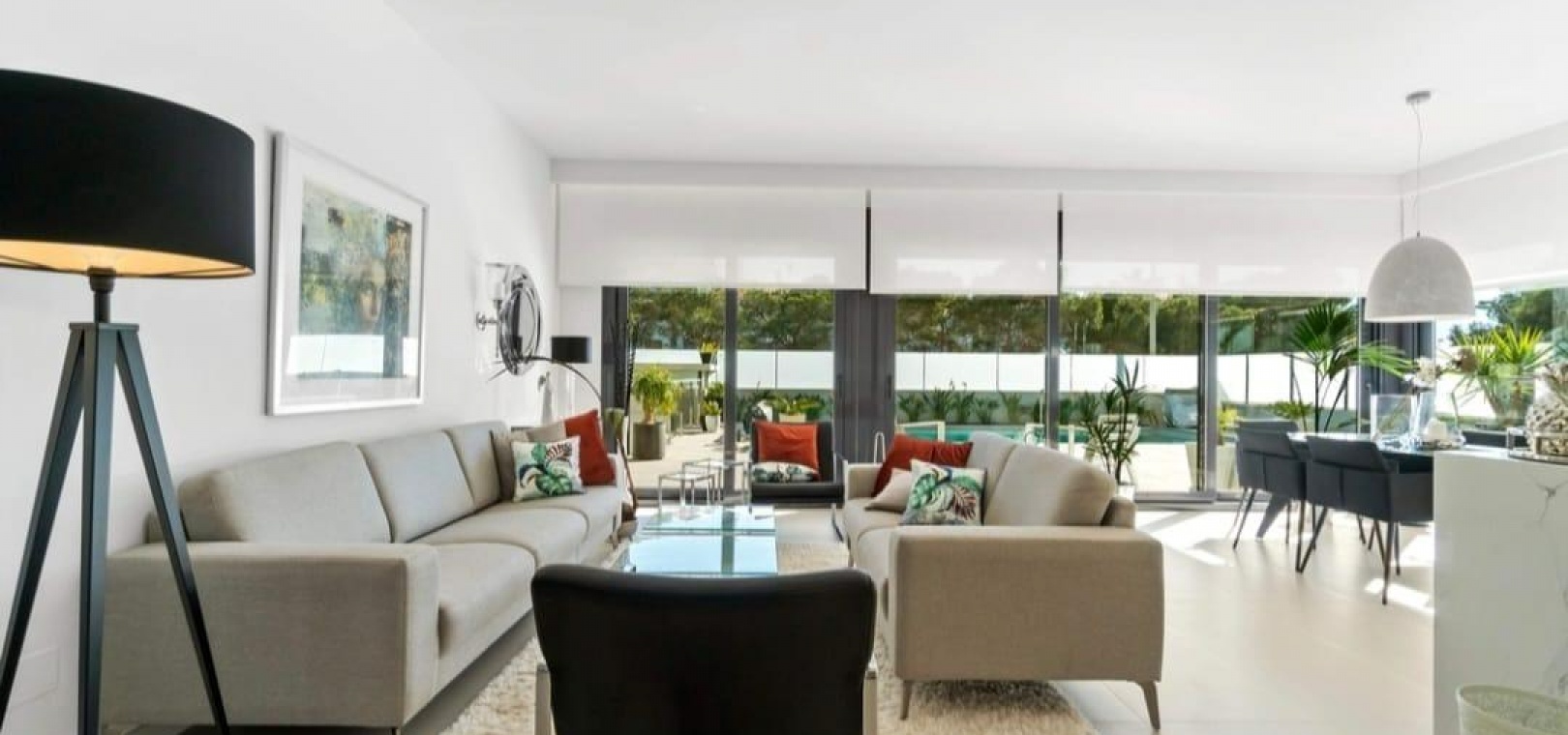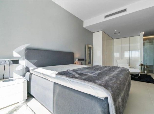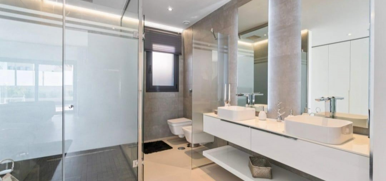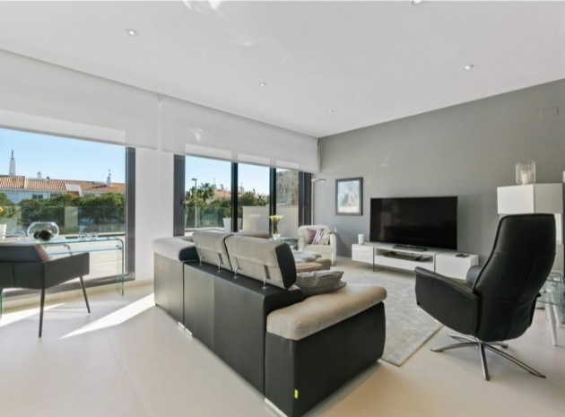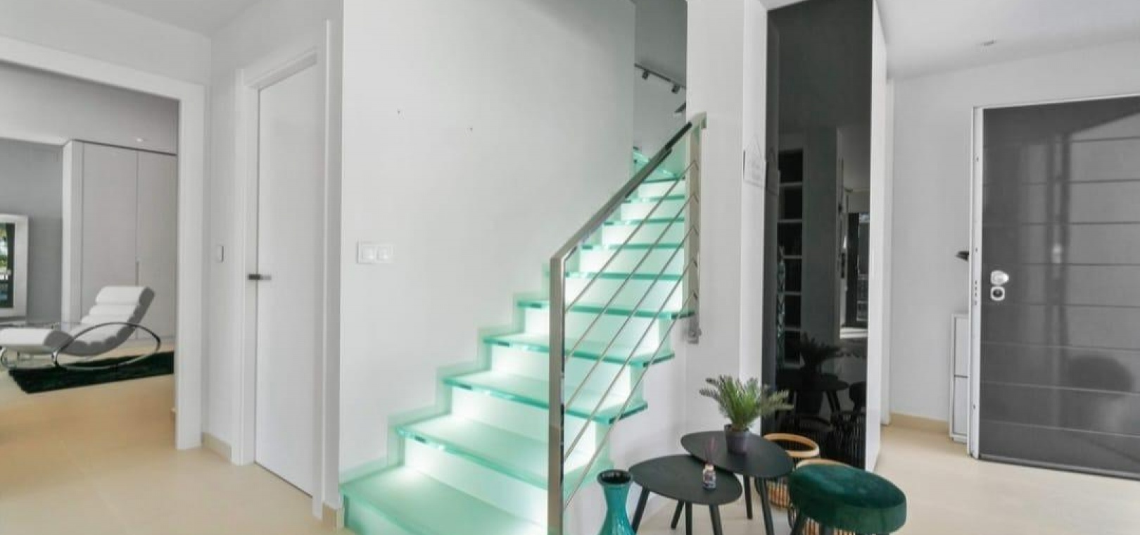 Campoamor, Villa de luxe moderne avec un terrain de 479 m2 et une maison de 234 m2 avec 3 chambres (dont 2 au rez-de-chaussée), 3 salles de bains, grand salon, cuisine avec îlot, grande terrasse, piscine privée, solarium avec zone vitrée et jacuzzi avec vue sur la mer, espace barbecue, vendu meublé, avec place de parking sur le terrain et à distance de marche de la plage d'Aguamarina.~