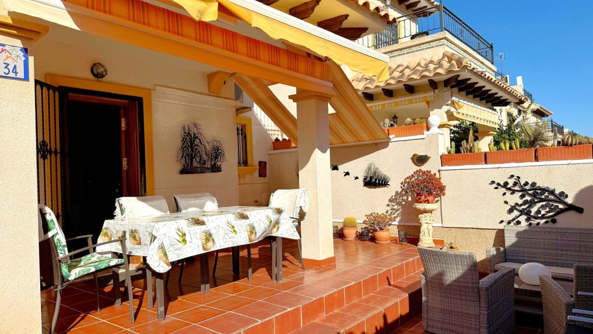 Une maison quadruple de 2 chambres et 1,5 salle de bain orientée plein sud avec un solarium privé sur le toit située à Pinada Golf II, Villamartin, Costa Blanca.