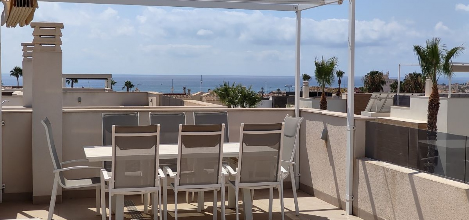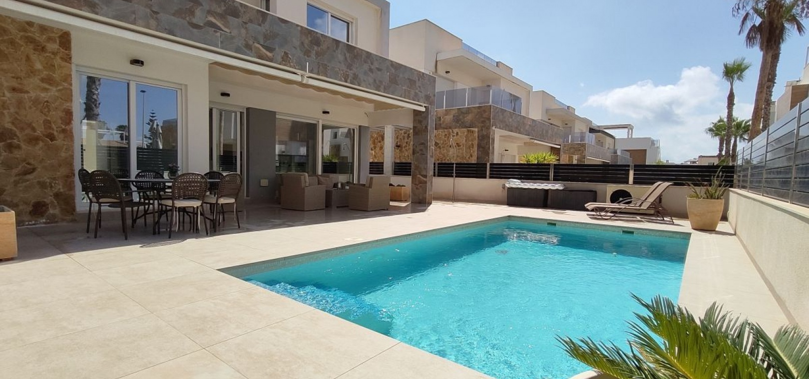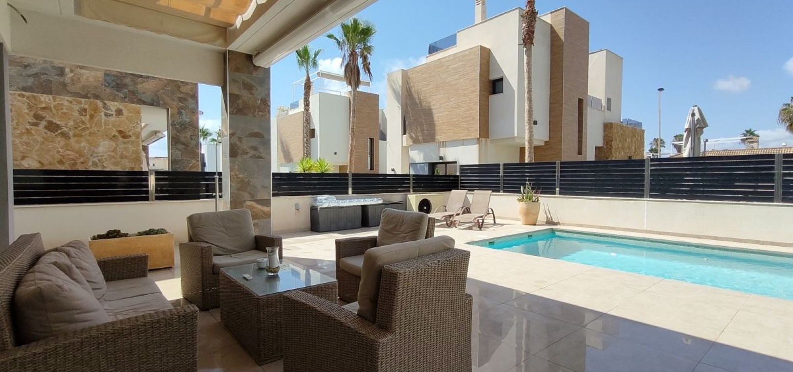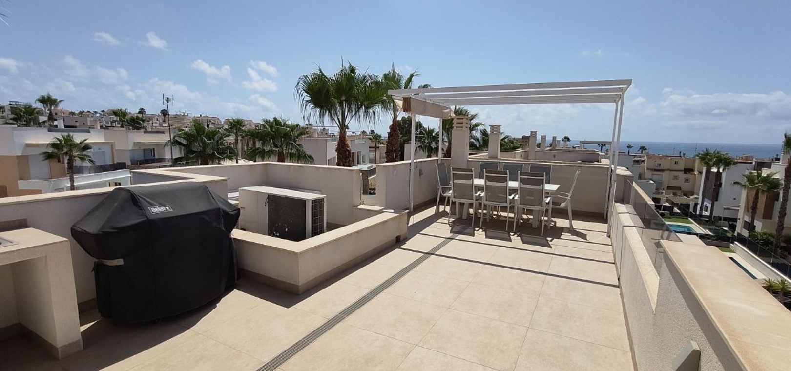 Villa exclusive orientée plein sud près de la plage de La Mata - Emplacement privilégié et vue imprenable sur la mer Découvrez cette magnifique villa de luxe, construite en 2018, dans l'un des quartiers les plus recherchés du sud de la Costa Blanca. Idéalement située à seulement 5 minutes à pied de la plage de La Mata, cette superbe maison offre un emplacement côtier privilégié, une vue imprenable sur la mer et du soleil toute la journée grâce à son orientation parfaite vers le sud. Située dans le prestigieux complexe El Amanecer I Villas, cette propriété est entourée de plages immaculées, de magnifiques paysages côtiers, de restaurants gastronomiques, de charmants cafés et de toutes les commodités essentielles, garantissant un style de vie méditerranéen détendu et dynamique. Cette villa spacieuse comprend 3 chambres élégamment conçues avec placards intégrés et 3 salles de bains modernes. Le salon décloisonné et lumineux se connecte parfaitement à une élégante cuisine entièrement équipée, tandis que de grandes fenêtres inondent l'espace de lumière naturelle, renforçant l'atmosphère chaleureuse et accueillante de la maison. Montez sur la terrasse couverte, où vous pourrez vous détendre tout en surplombant votre piscine privée chauffée, entourée d'un jardin luxuriant et magnifiquement paysager - votre propre coin de paradis. Le niveau supérieur offre un accès à une grande terrasse depuis les deux chambres (toutes deux avec salle de bains privative), menant au vaste solarium sur le toit. De là, profitez d'une vue panoramique imprenable sur la mer, complétée par un espace barbecue et un espace repas extérieur, idéal pour se détendre ou se divertir tout en profitant de la brise méditerranéenne. Conçue pour un maximum de confort et de luxe, cette villa est équipée d'appareils électroménagers de haute technologie, de la climatisation canalisée (chaud et froid), du chauffage au sol, de volets et d'auvents électriques, d'une piscine chauffée et d'un système d'alarme ultramoderne. Elle dispose également d'un parking privé couvert dans une communauté fermée sécurisée avec accès à deux rues.