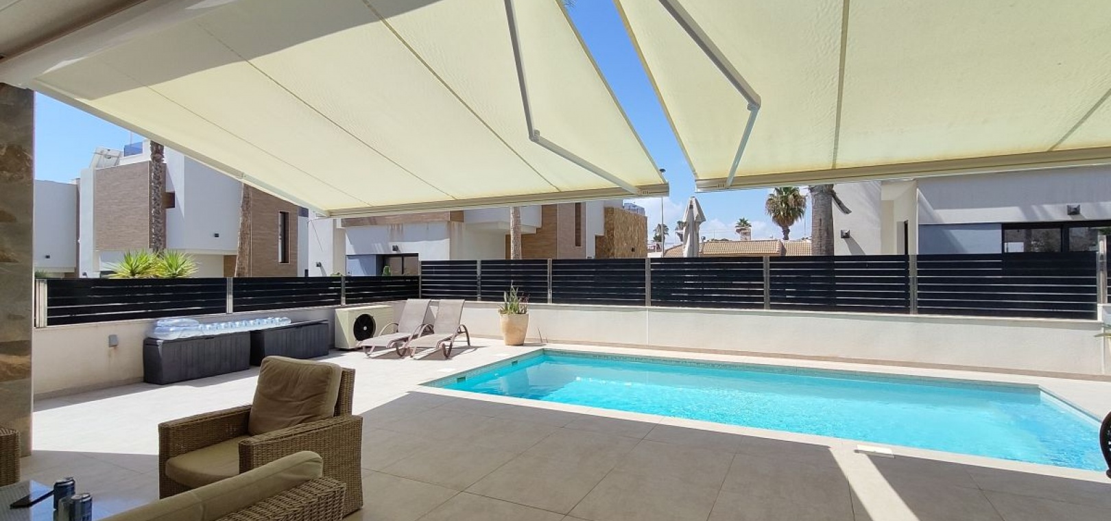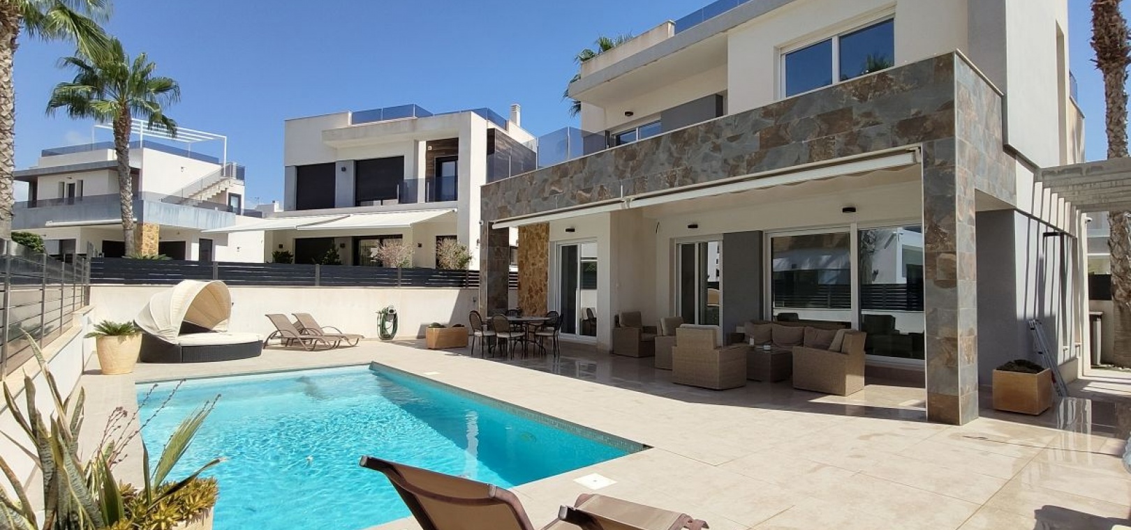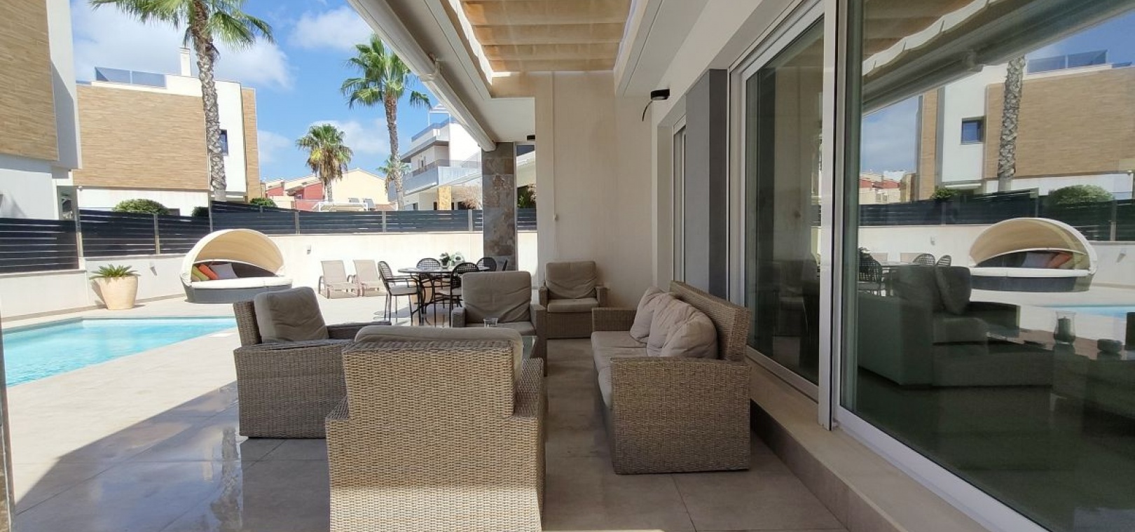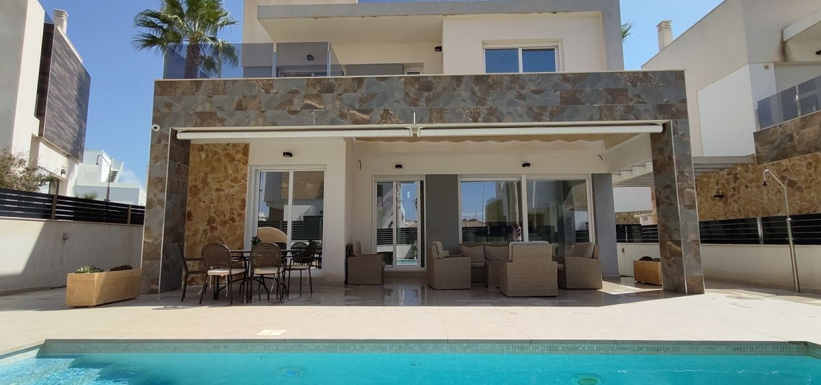 Villa exclusive orientée plein sud près de la plage de La Mata - Emplacement privilégié et vue imprenable sur la mer Découvrez cette magnifique villa de luxe, construite en 2018, dans l'un des quartiers les plus recherchés du sud de la Costa Blanca. Idéalement située à seulement 5 minutes à pied de la plage de La Mata, cette superbe maison offre un emplacement côtier privilégié, une vue imprenable sur la mer et du soleil toute la journée grâce à son orientation parfaite vers le sud. Située dans le prestigieux complexe El Amanecer I Villas, cette propriété est entourée de plages immaculées, de magnifiques paysages côtiers, de restaurants gastronomiques, de charmants cafés et de toutes les commodités essentielles, garantissant un style de vie méditerranéen détendu et dynamique. Cette villa spacieuse comprend 3 chambres élégamment conçues avec placards intégrés et 3 salles de bains modernes. Le salon décloisonné et lumineux se connecte parfaitement à une élégante cuisine entièrement équipée, tandis que de grandes fenêtres inondent l'espace de lumière naturelle, renforçant l'atmosphère chaleureuse et accueillante de la maison. Montez sur la terrasse couverte, où vous pourrez vous détendre tout en surplombant votre piscine privée chauffée, entourée d'un jardin luxuriant et magnifiquement paysager - votre propre coin de paradis. Le niveau supérieur offre un accès à une grande terrasse depuis les deux chambres (toutes deux avec salle de bains privative), menant au vaste solarium sur le toit. De là, profitez d'une vue panoramique imprenable sur la mer, complétée par un espace barbecue et un espace repas extérieur, idéal pour se détendre ou se divertir tout en profitant de la brise méditerranéenne. Conçue pour un maximum de confort et de luxe, cette villa est équipée d'appareils électroménagers de haute technologie, de la climatisation canalisée (chaud et froid), du chauffage au sol, de volets et d'auvents électriques, d'une piscine chauffée et d'un système d'alarme ultramoderne. Elle dispose également d'un parking privé couvert dans une communauté fermée sécurisée avec accès à deux rues.