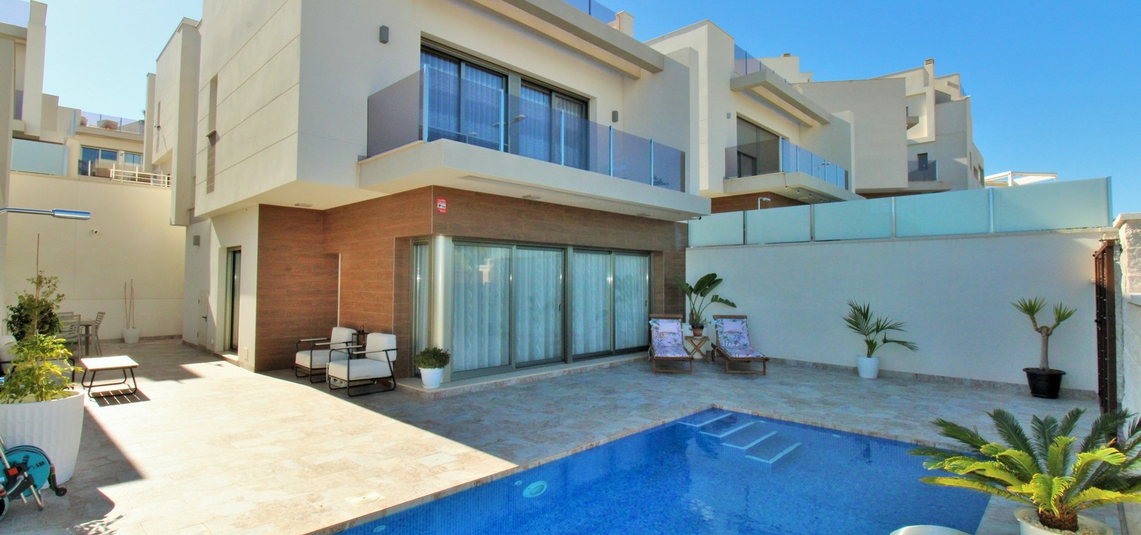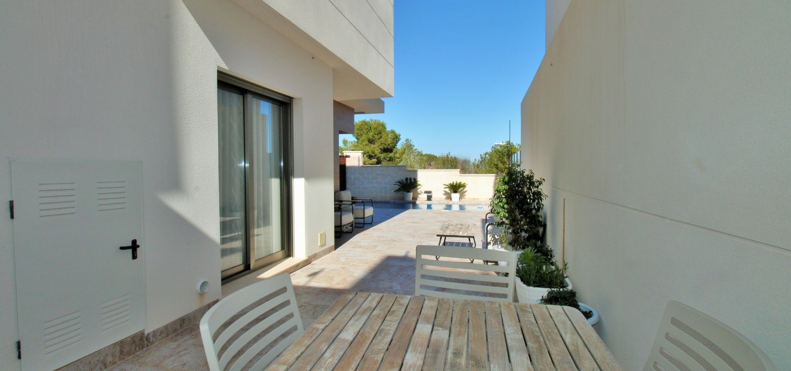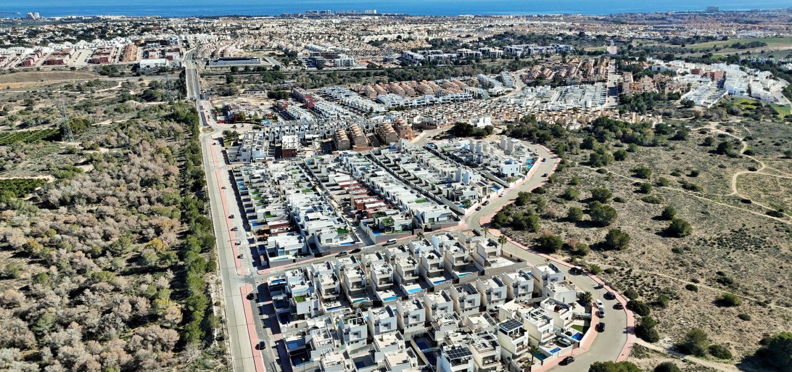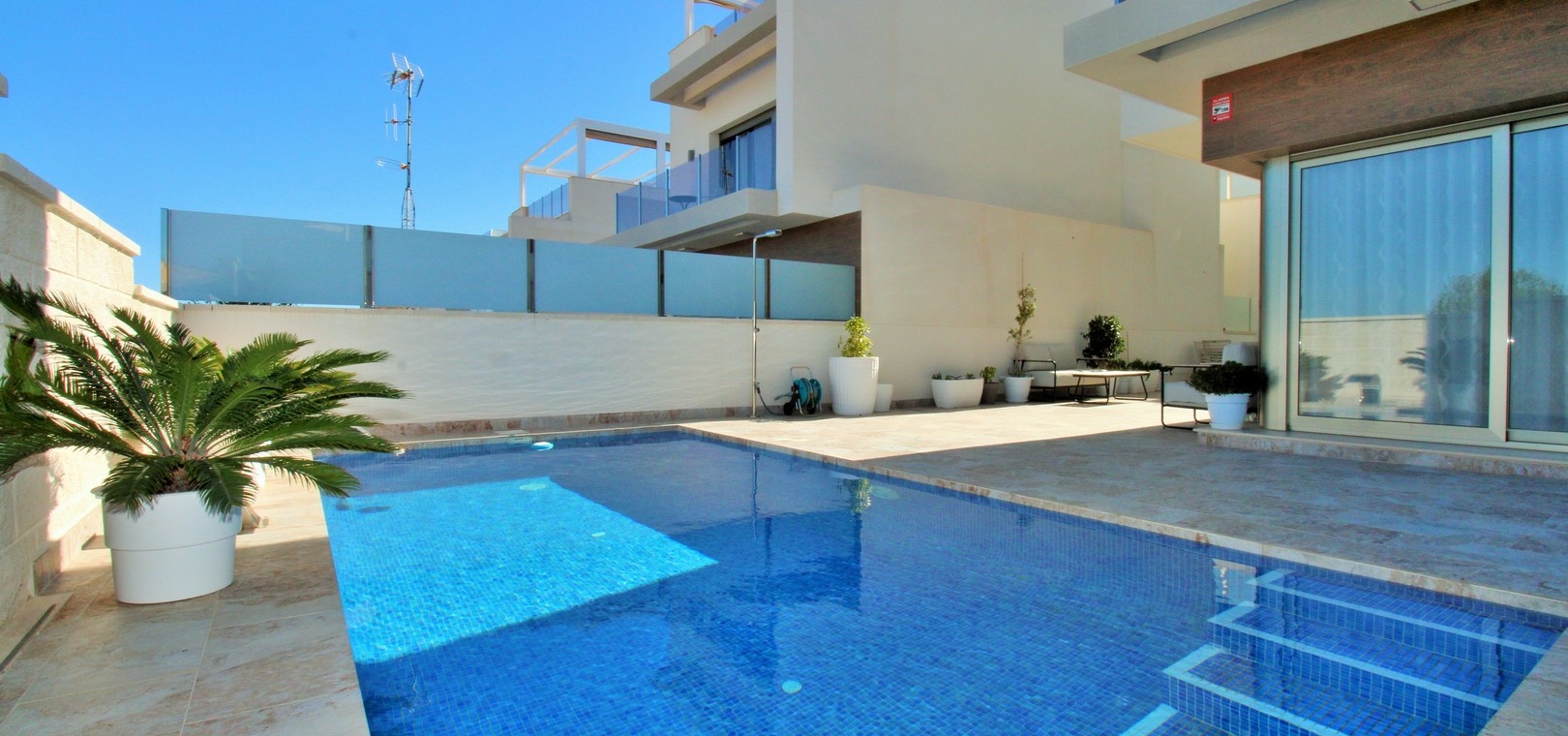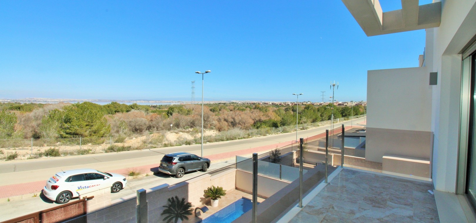 Cette luxueuse et moderne villa individuelle de 3 chambres et 3 salles de bains est située dans le quartier Pau 26 de Villamartin. Achevée en 2023, cette belle villa offre une piscine privée, un parking hors route avec une grande terrasse en L, un balcon avant et un immense solarium sur le toit offrant une vue sur la mer et les lacs salés de Torrevieja. Le rez-de-chaussée comprend un salon-salle à manger lumineux et aéré avec une cuisine moderne sur mesure avec des appareils intégrés (four, micro-ondes, lave-vaisselle, réfrigérateur-congélateur...), une chambre en bas avec placards intégrés (actuellement utilisée comme bureau/2ème salon) et une salle de bain en bas avec douche à l'italienne. De grandes portes coulissantes du salon vous mènent directement à la piscine. A l'étage, il y a 2 chambres doubles avec placards intégrés, toutes deux offrant des salles de bains privatives avec douches à l'italienne, ainsi qu'un accès au balcon avant. Depuis le palier, vous pouvez accéder à l'immense solarium sur le toit, offrant une vue imprenable sur les lacs salés de Torrevieja, la mer et les environs. La propriété est vendue avec des meubles de haute qualité, des appareils électroménagers et bénéficie d'autres extras, notamment le chauffage au sol dans toutes les salles de bains, la climatisation canalisée dans tout l'appartement, des stores électriques, un éclairage LED et un panneau solaire pour l'eau chaude. Situé à seulement 1 km d'un supermarché ALDI et du centre commercial Via Park III, offrant une gamme de bars, restaurants et autres services, dont une pharmacie. La place Villamartin et le parcours de golf se trouvent à quelques minutes en voiture, ainsi que les plages Pavillon bleu d'Orihuela Costa et le célèbre centre commercial Zenia Boulevard.