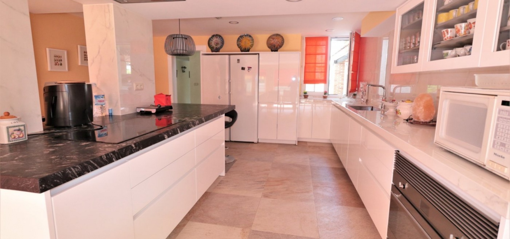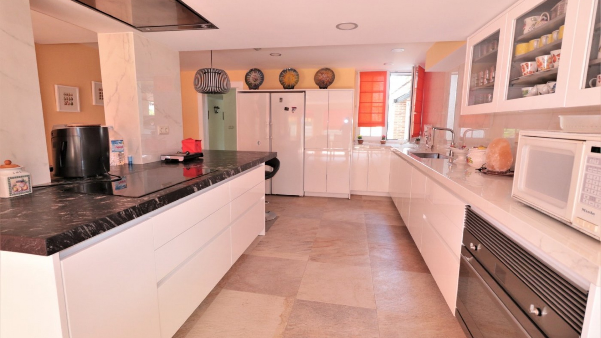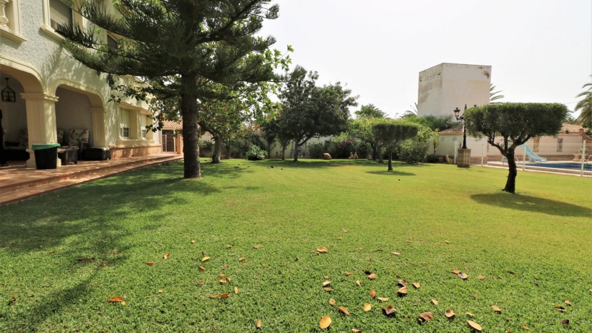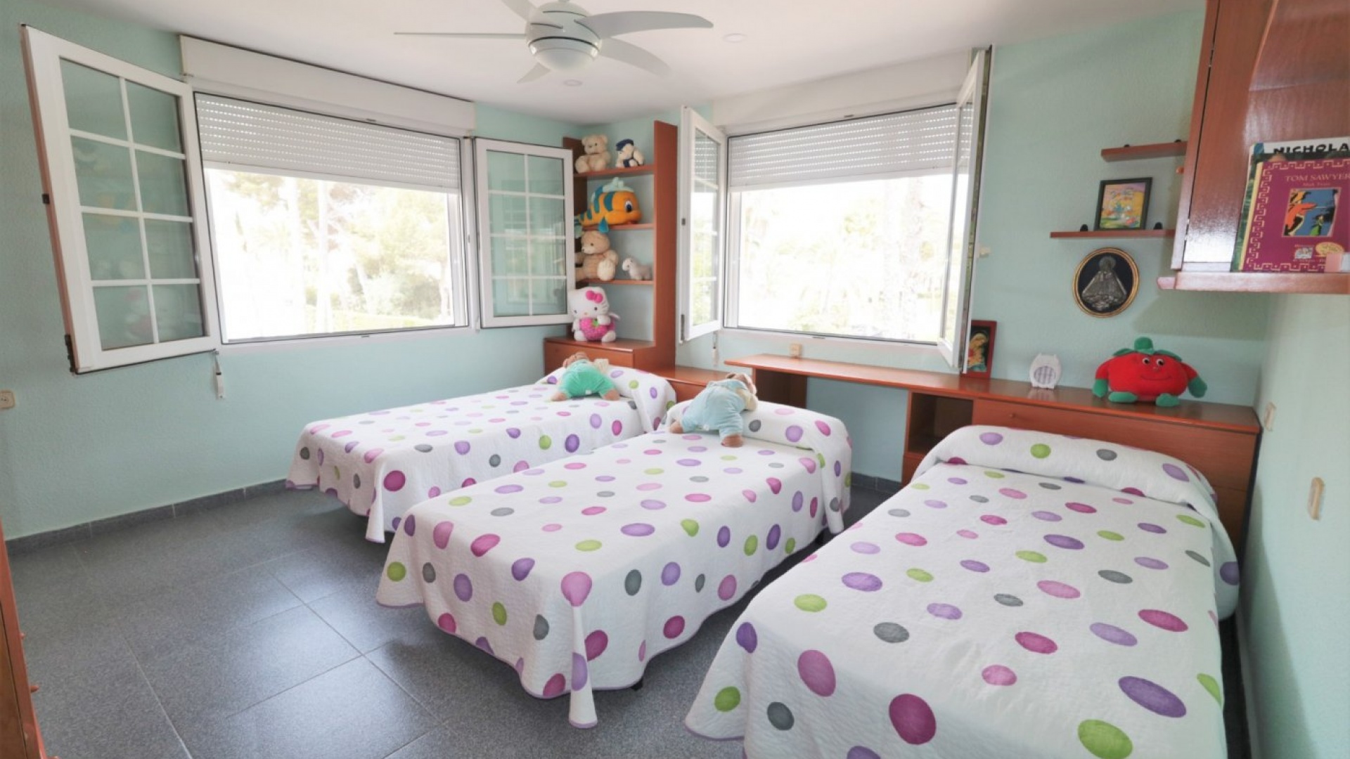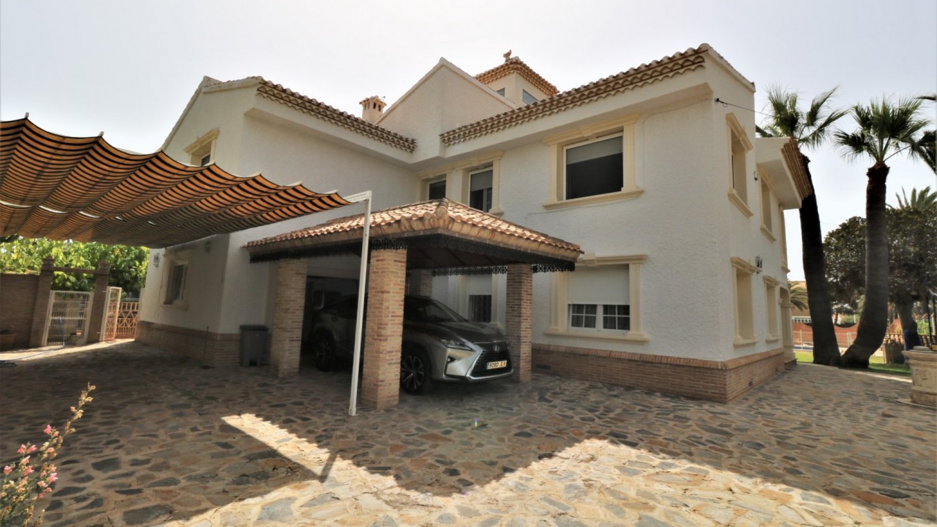Villa à Orihuela Costa, zone Cabo Roig, 543 m2 de surface, 1550 m2 de terrain, 8 chambres doubles, 3 salles de bains, propriété en bon état, cuisine équipée, exposition sud. ~ Extras : climatisation, placards, balcon, barbecue, pompe à eau chaude et froide, chauffage, cheminée, galerie, jardin, lumineux, meubles, piscine privée, terrasse, débarras, bus, centres commerciaux, côte, golf, parcs, supermarchés, urbanisation, vue sur la mer, vue dégagée, garage inclus ~