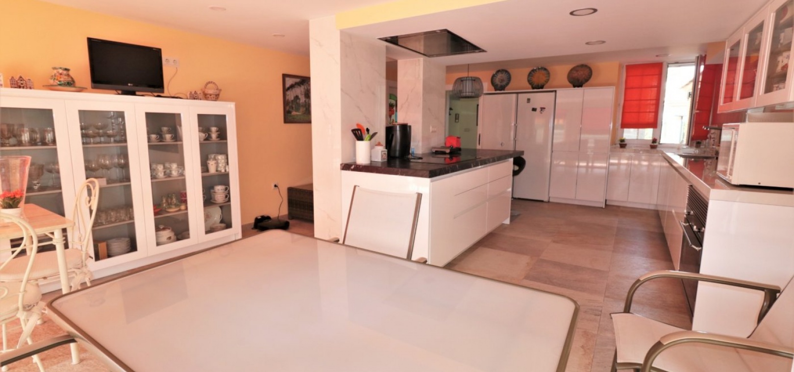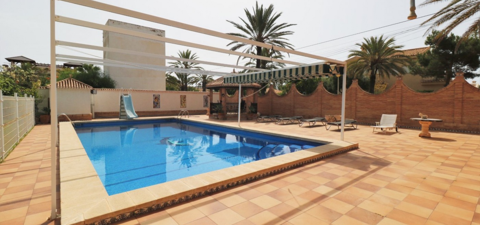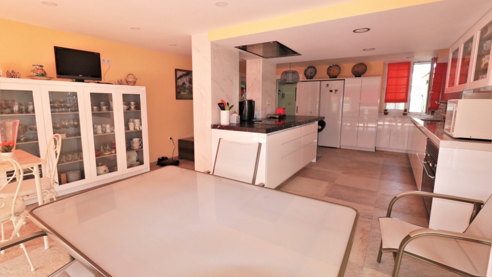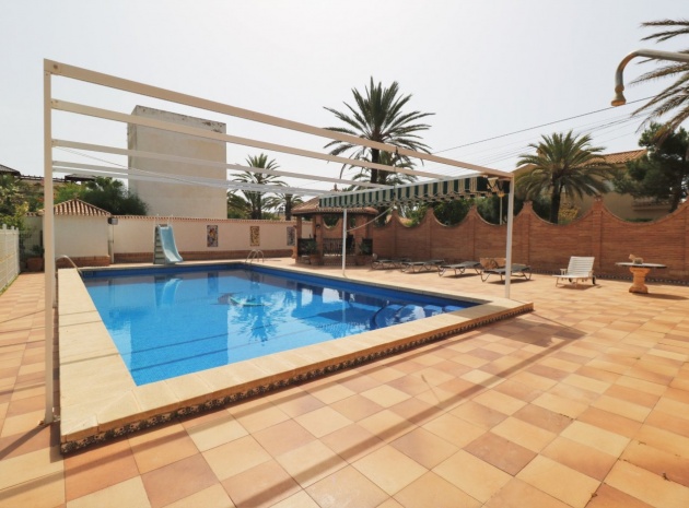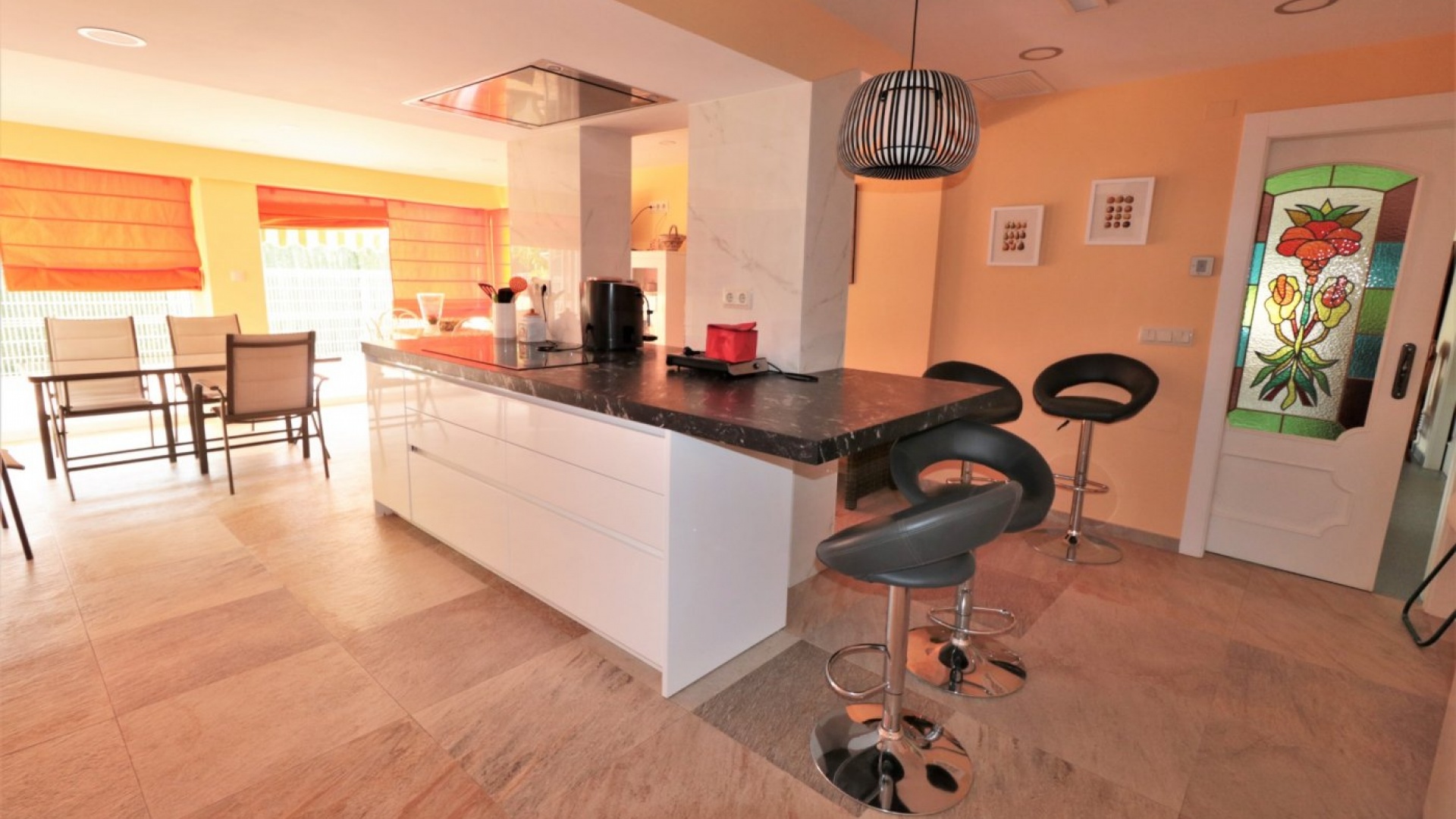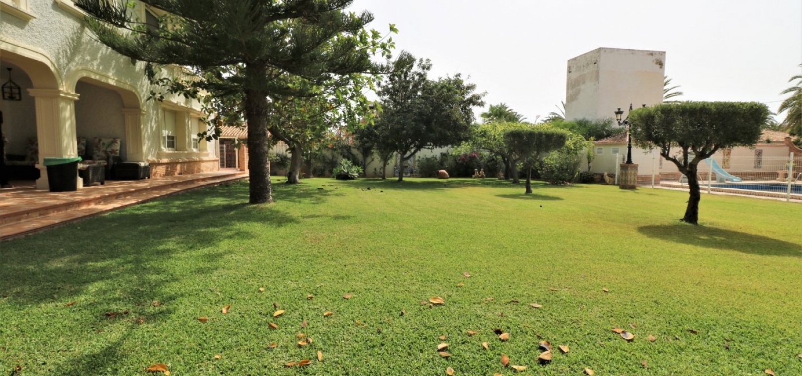 Villa à Orihuela Costa, zone Cabo Roig, 543 m2 de surface, 1550 m2 de terrain, 8 chambres doubles, 3 salles de bains, propriété en bon état, cuisine équipée, exposition sud. ~ Extras : climatisation, placards, balcon, barbecue, pompe à eau chaude et froide, chauffage, cheminée, galerie, jardin, lumineux, meubles, piscine privée, terrasse, débarras, bus, centres commerciaux, côte, golf, parcs, supermarchés, urbanisation, vue sur la mer, vue dégagée, garage inclus ~