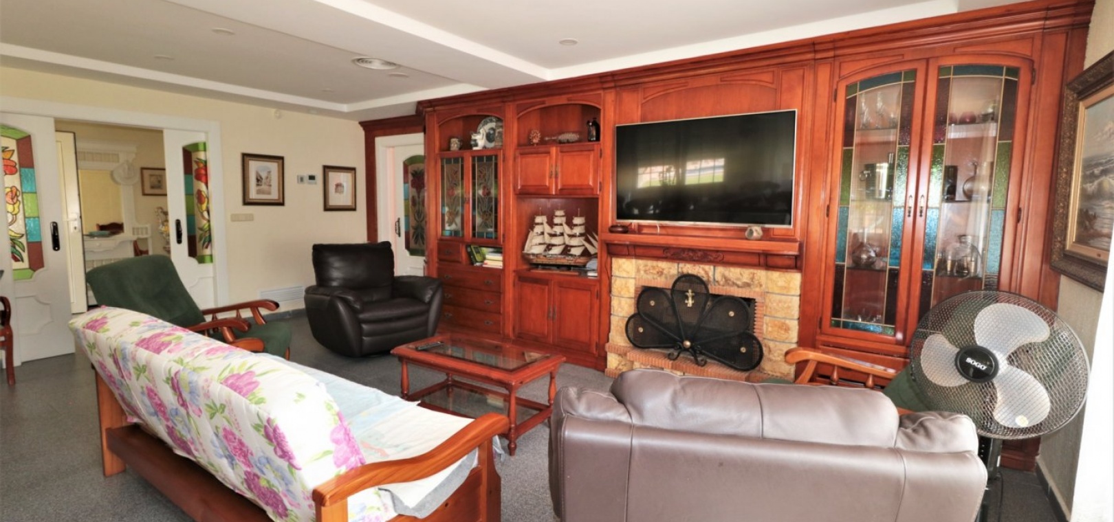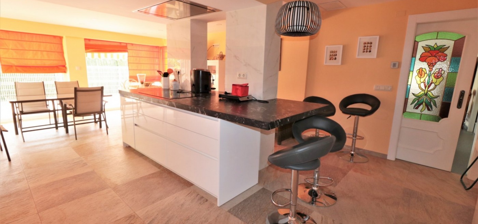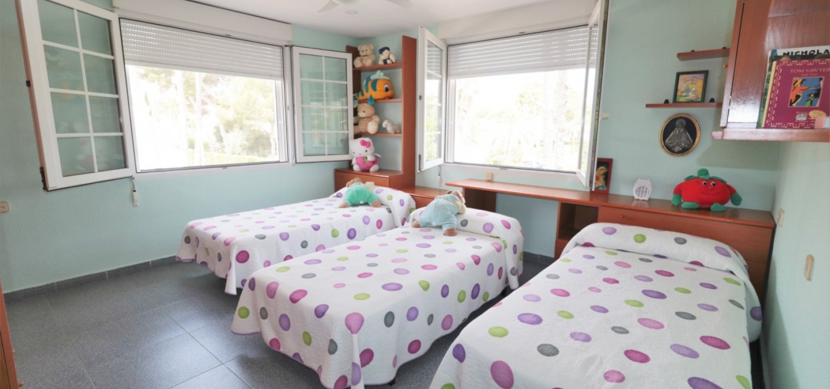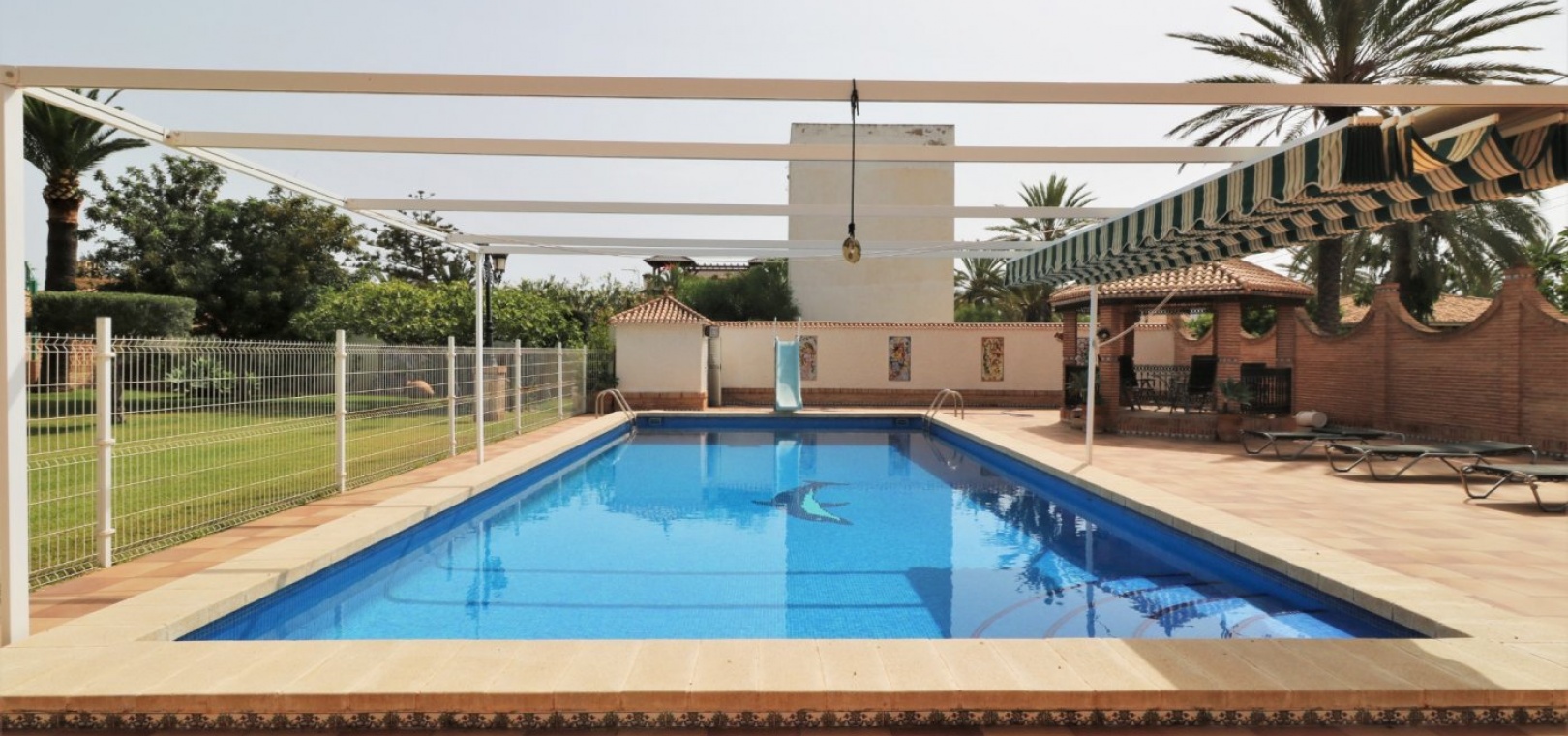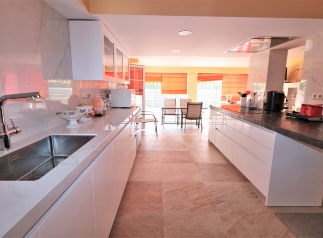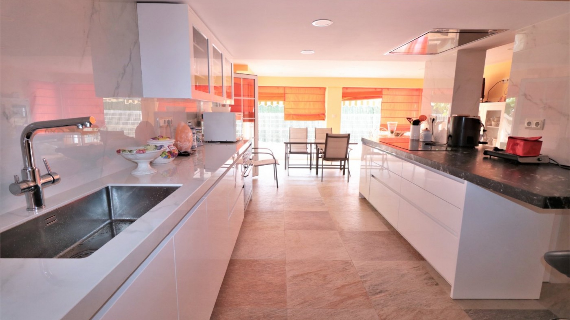 Villa à Orihuela Costa, zone Cabo Roig, 543 m2 de surface, 1550 m2 de terrain, 8 chambres doubles, 3 salles de bains, propriété en bon état, cuisine équipée, exposition sud. ~ Extras : climatisation, placards, balcon, barbecue, pompe à eau chaude et froide, chauffage, cheminée, galerie, jardin, lumineux, meubles, piscine privée, terrasse, débarras, bus, centres commerciaux, côte, golf, parcs, supermarchés, urbanisation, vue sur la mer, vue dégagée, garage inclus ~