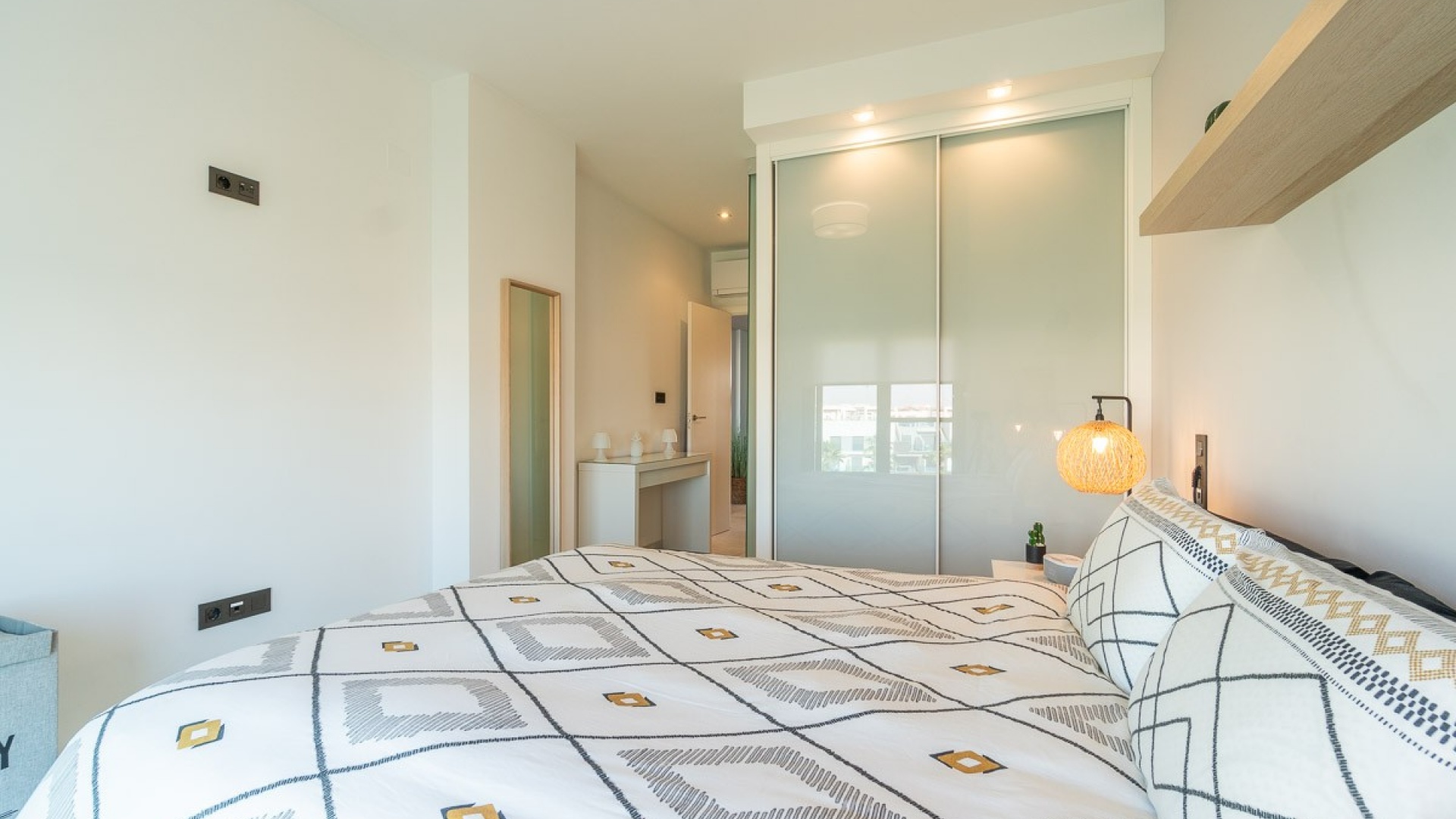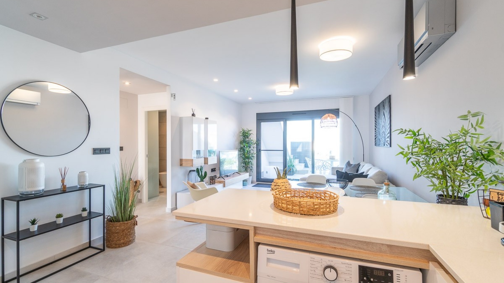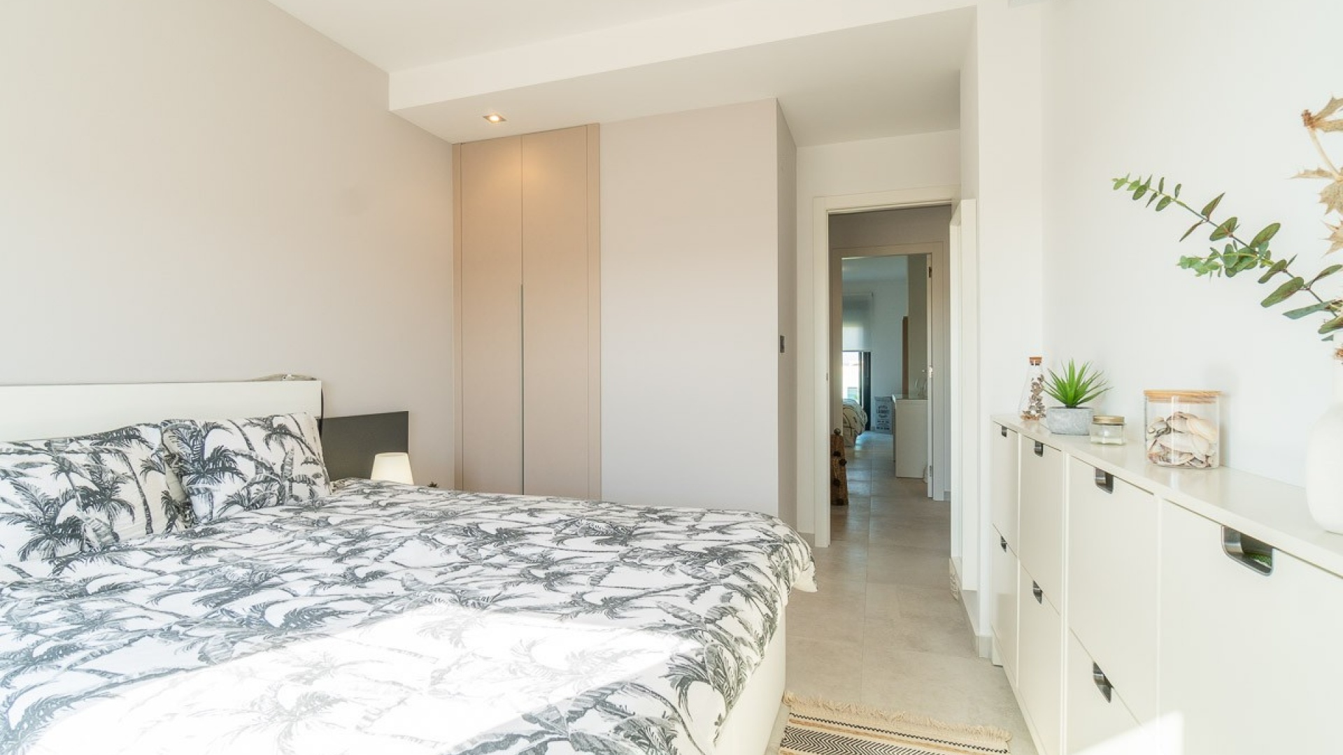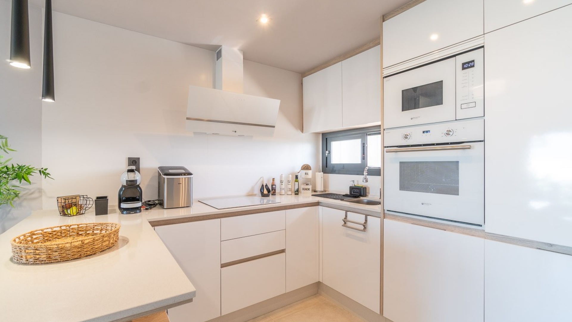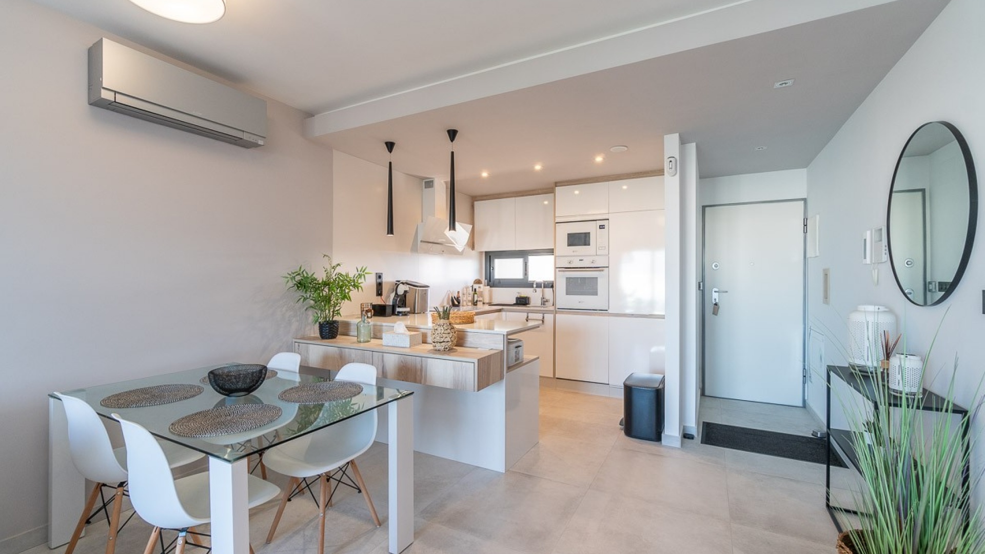 L'appartement est entièrement meublé dans un style contemporain, avec des meubles aux lignes épurées et des tons neutres qui apportent élégance et fonctionnalité. Depuis le salon, vous pouvez accéder à une terrasse privée, idéale pour profiter du climat méditerranéen et de la vue sur les espaces communs. De plus, la propriété dispose d'un solarium exclusif à l'étage supérieur, offrant un espace extérieur supplémentaire parfait pour se détendre, bronzer ou profiter de repas en plein air en toute intimité.