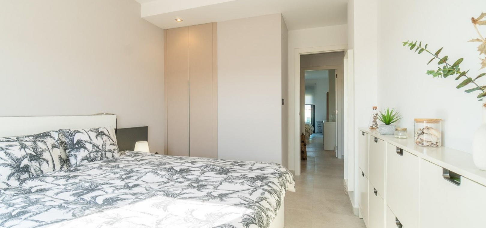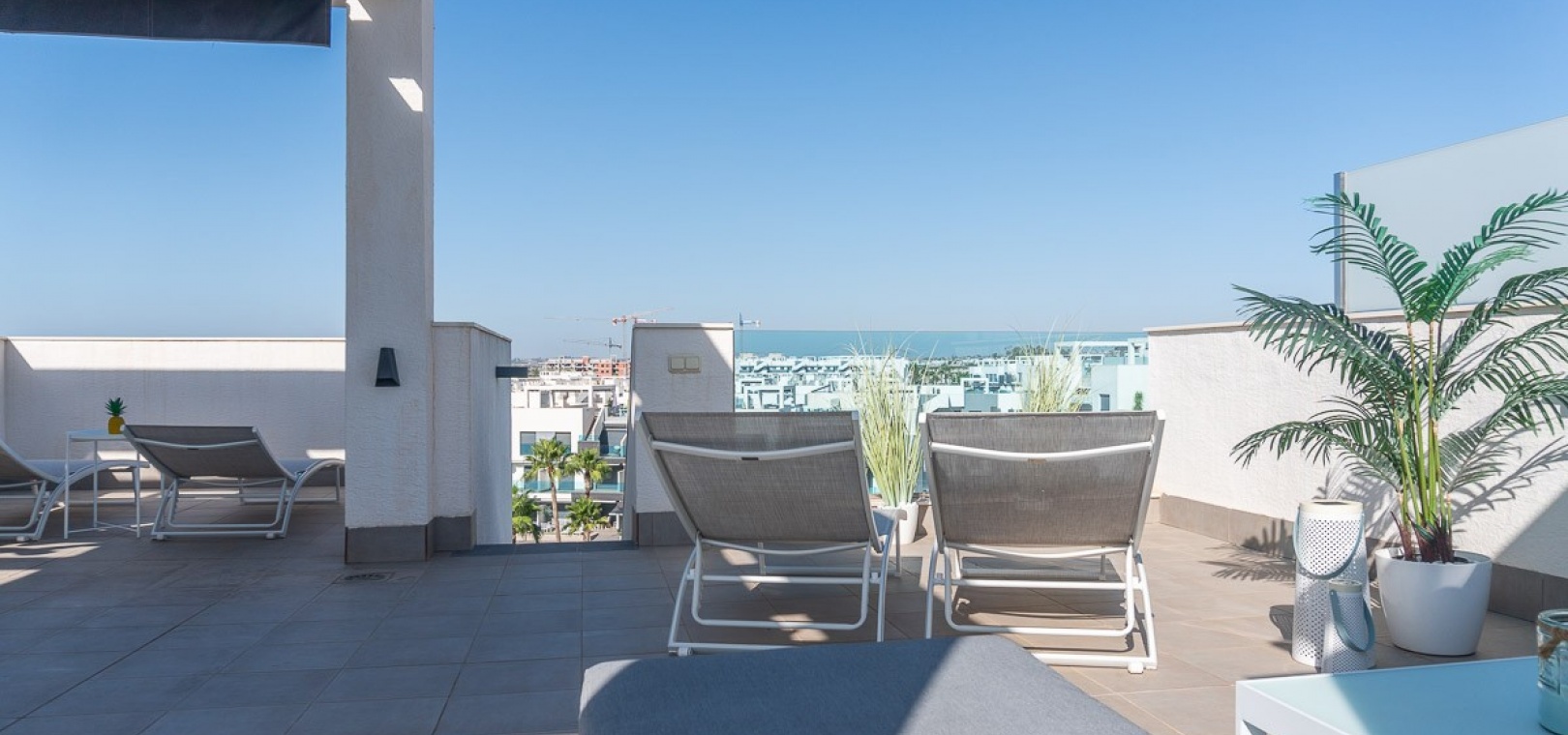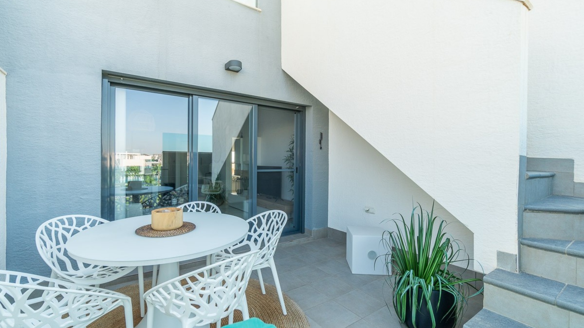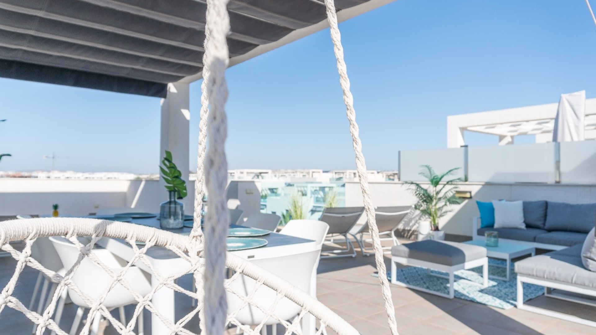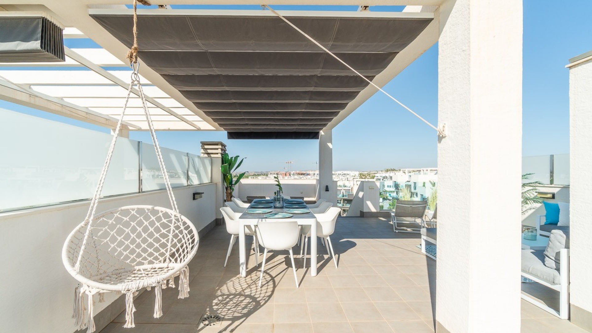 L'appartement est entièrement meublé dans un style contemporain, avec des meubles aux lignes épurées et des tons neutres qui apportent élégance et fonctionnalité. Depuis le salon, vous pouvez accéder à une terrasse privée, idéale pour profiter du climat méditerranéen et de la vue sur les espaces communs. De plus, la propriété dispose d'un solarium exclusif à l'étage supérieur, offrant un espace extérieur supplémentaire parfait pour se détendre, bronzer ou profiter de repas en plein air en toute intimité.