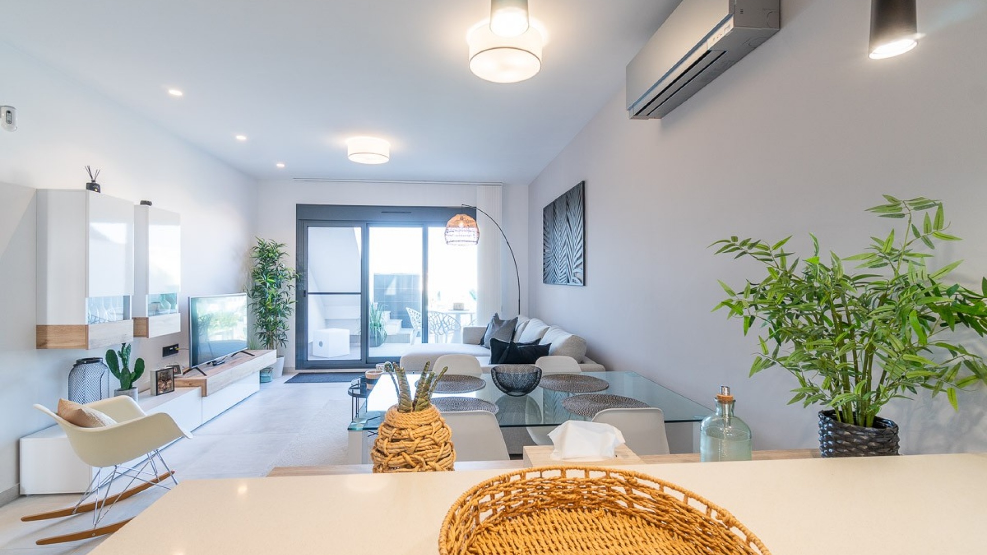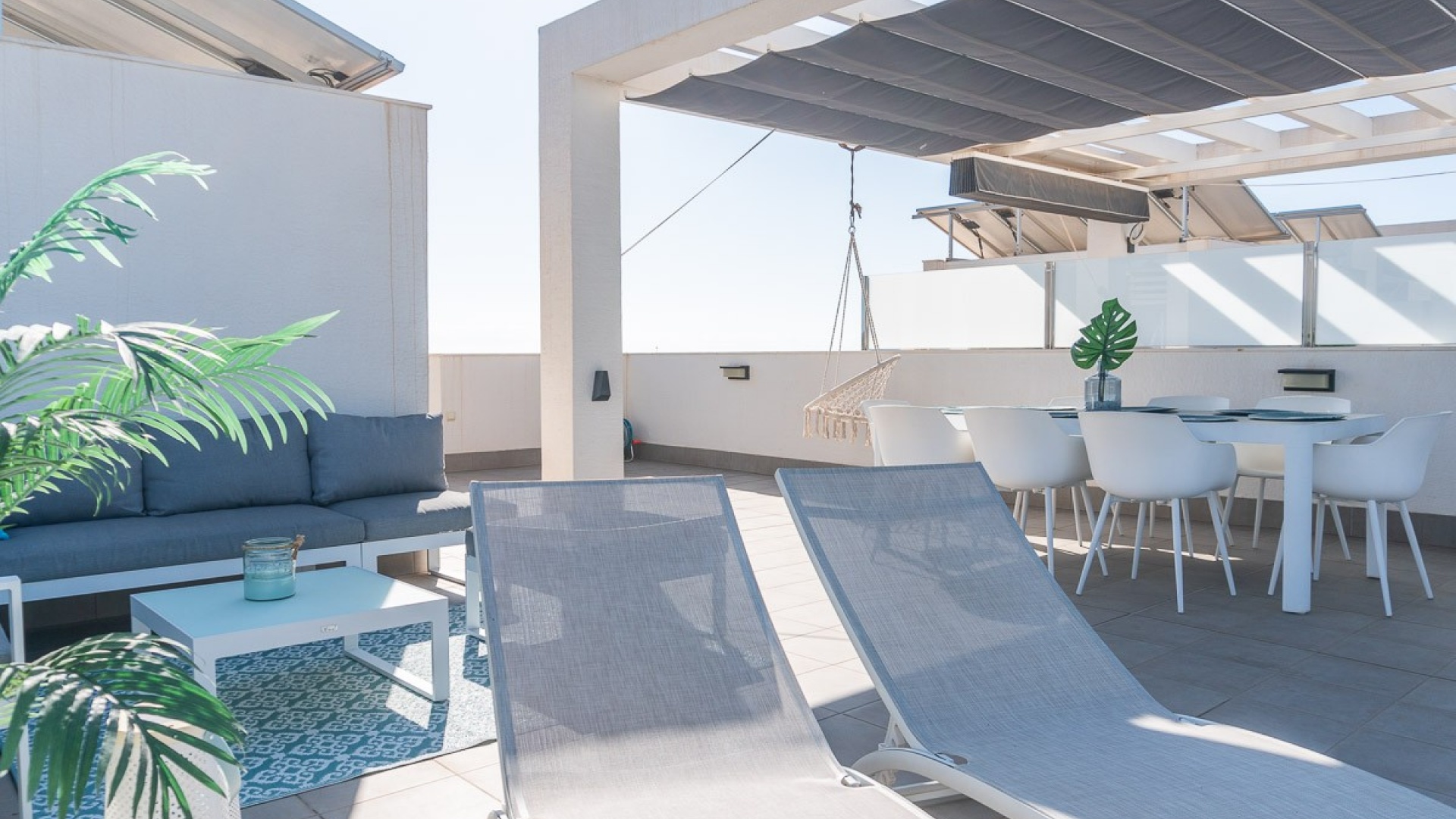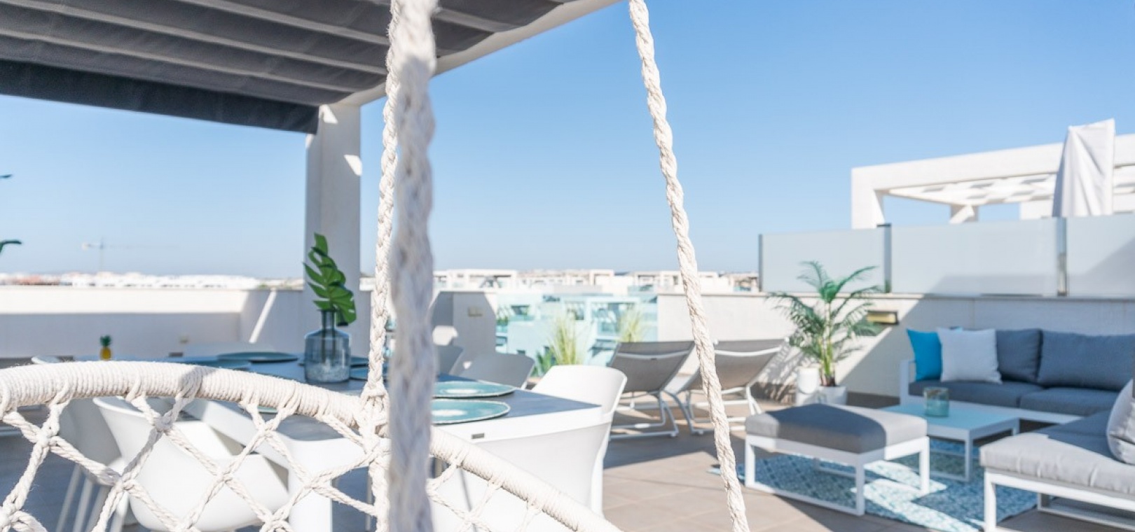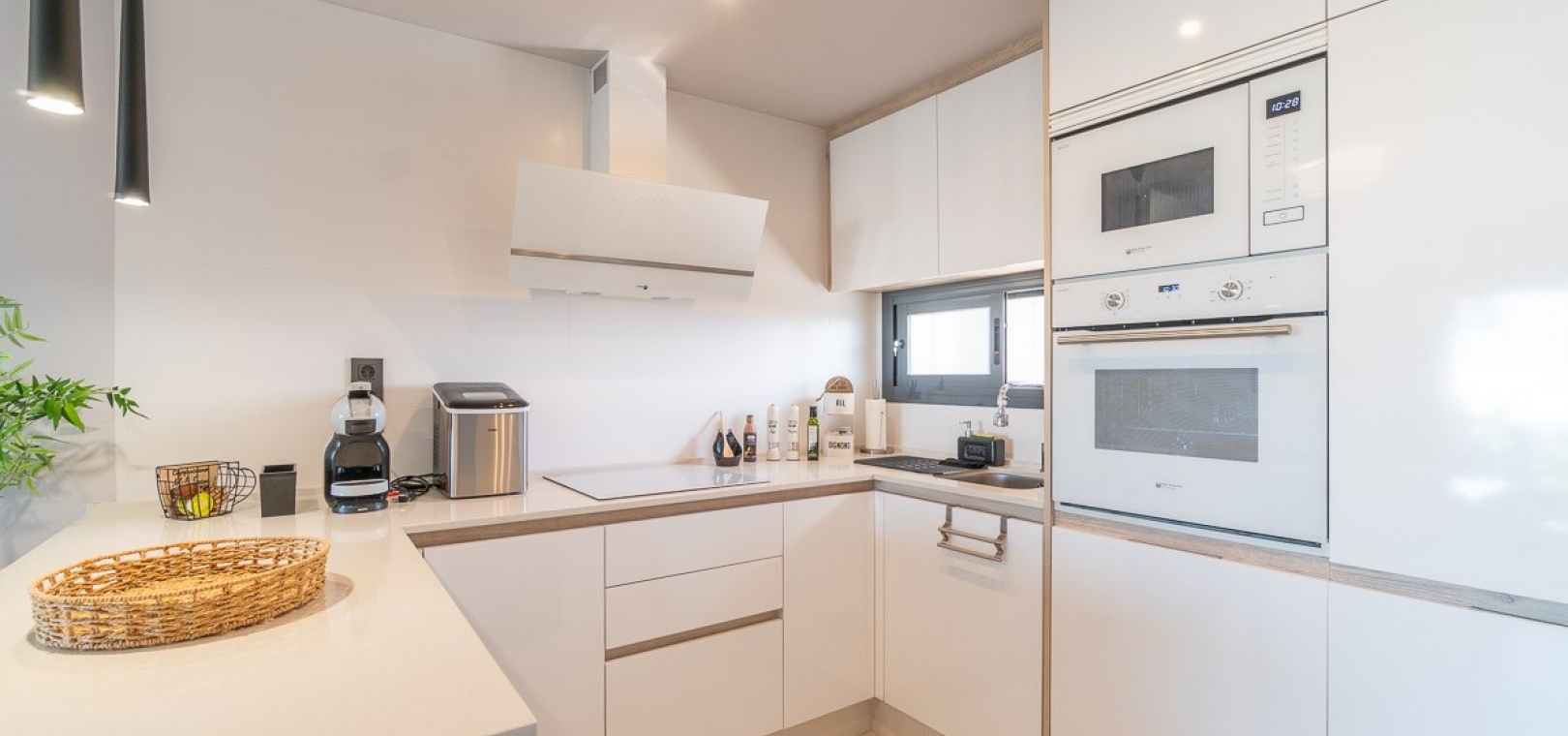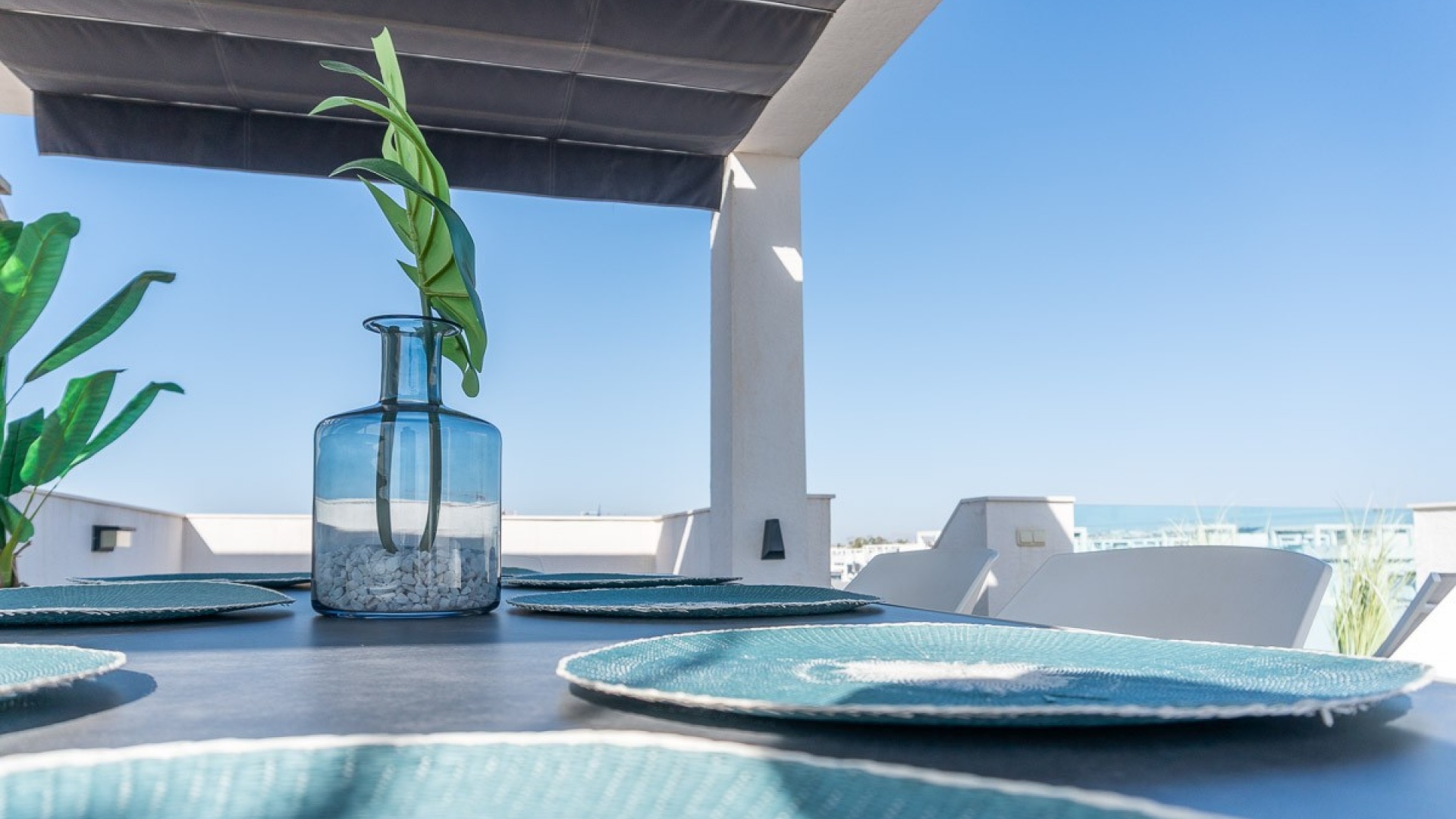 L'appartement est entièrement meublé dans un style contemporain, avec des meubles aux lignes épurées et des tons neutres qui apportent élégance et fonctionnalité. Depuis le salon, vous pouvez accéder à une terrasse privée, idéale pour profiter du climat méditerranéen et de la vue sur les espaces communs. De plus, la propriété dispose d'un solarium exclusif à l'étage supérieur, offrant un espace extérieur supplémentaire parfait pour se détendre, bronzer ou profiter de repas en plein air en toute intimité.