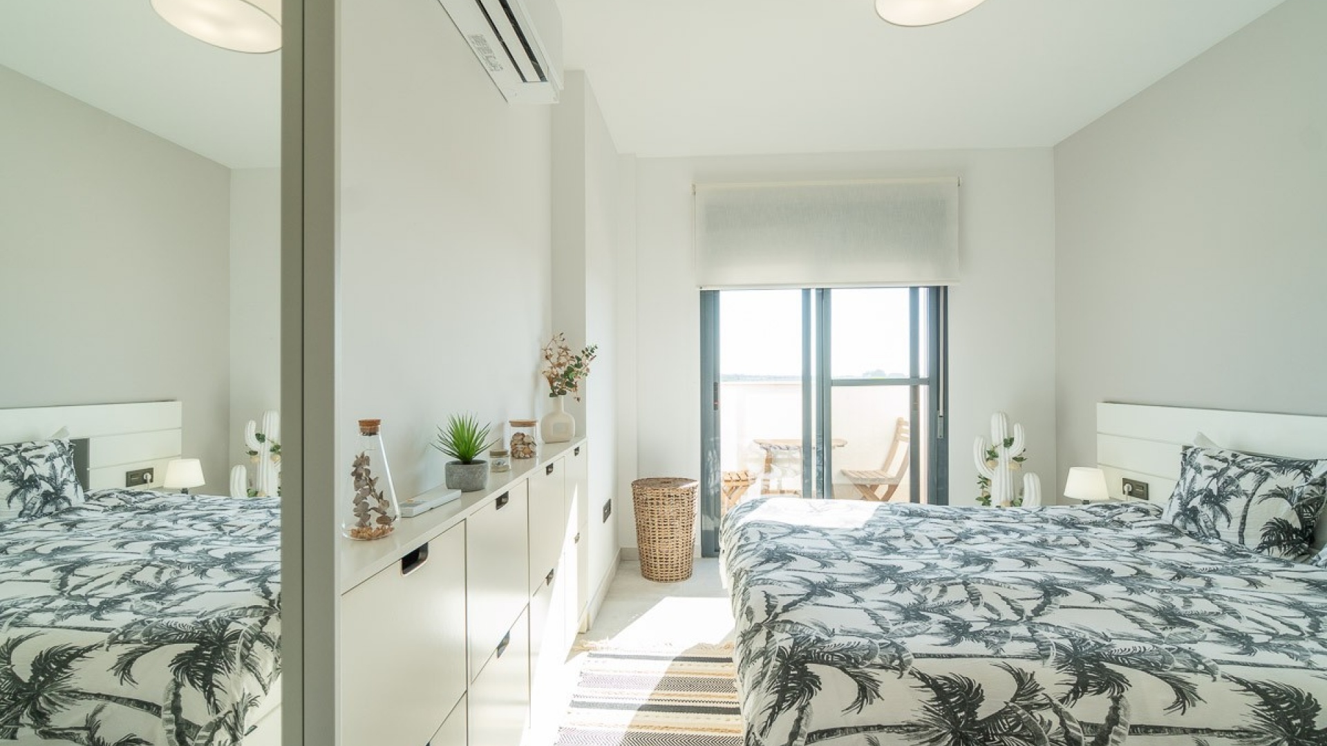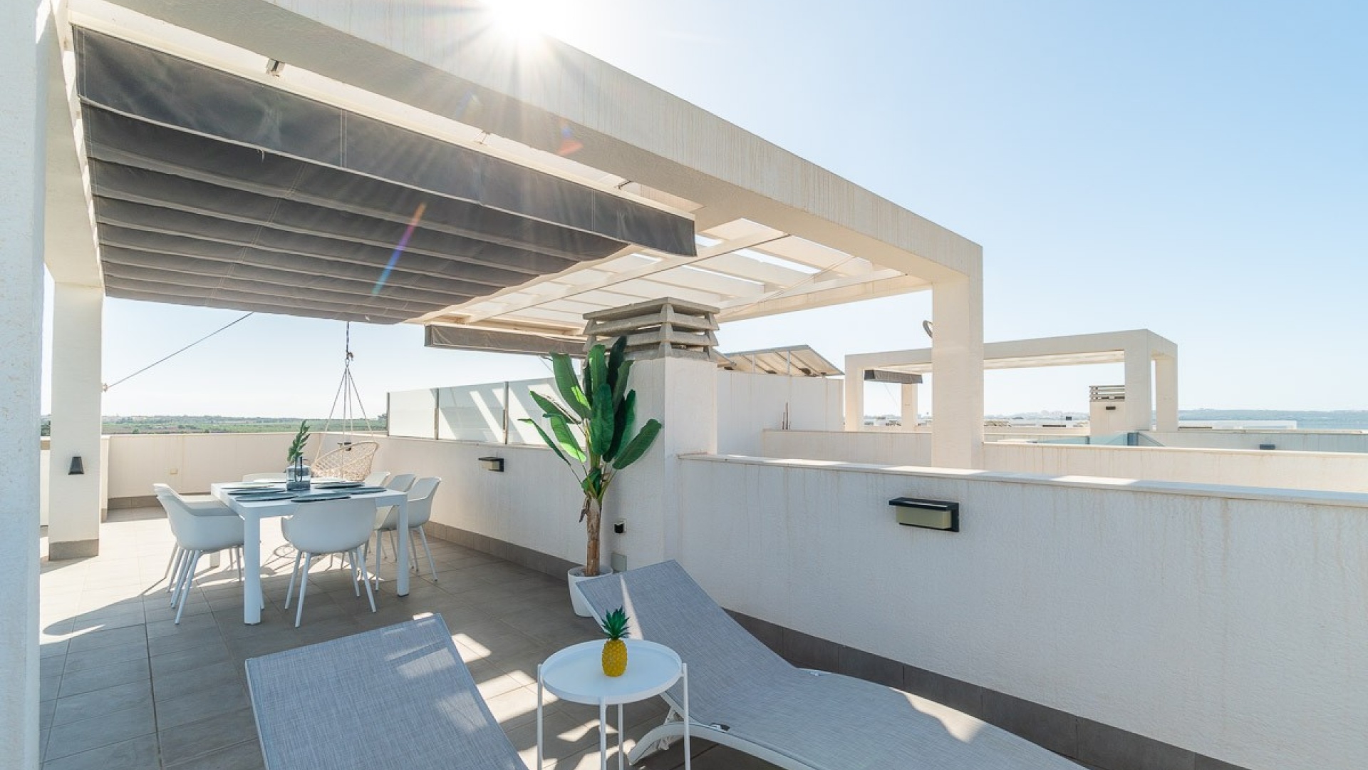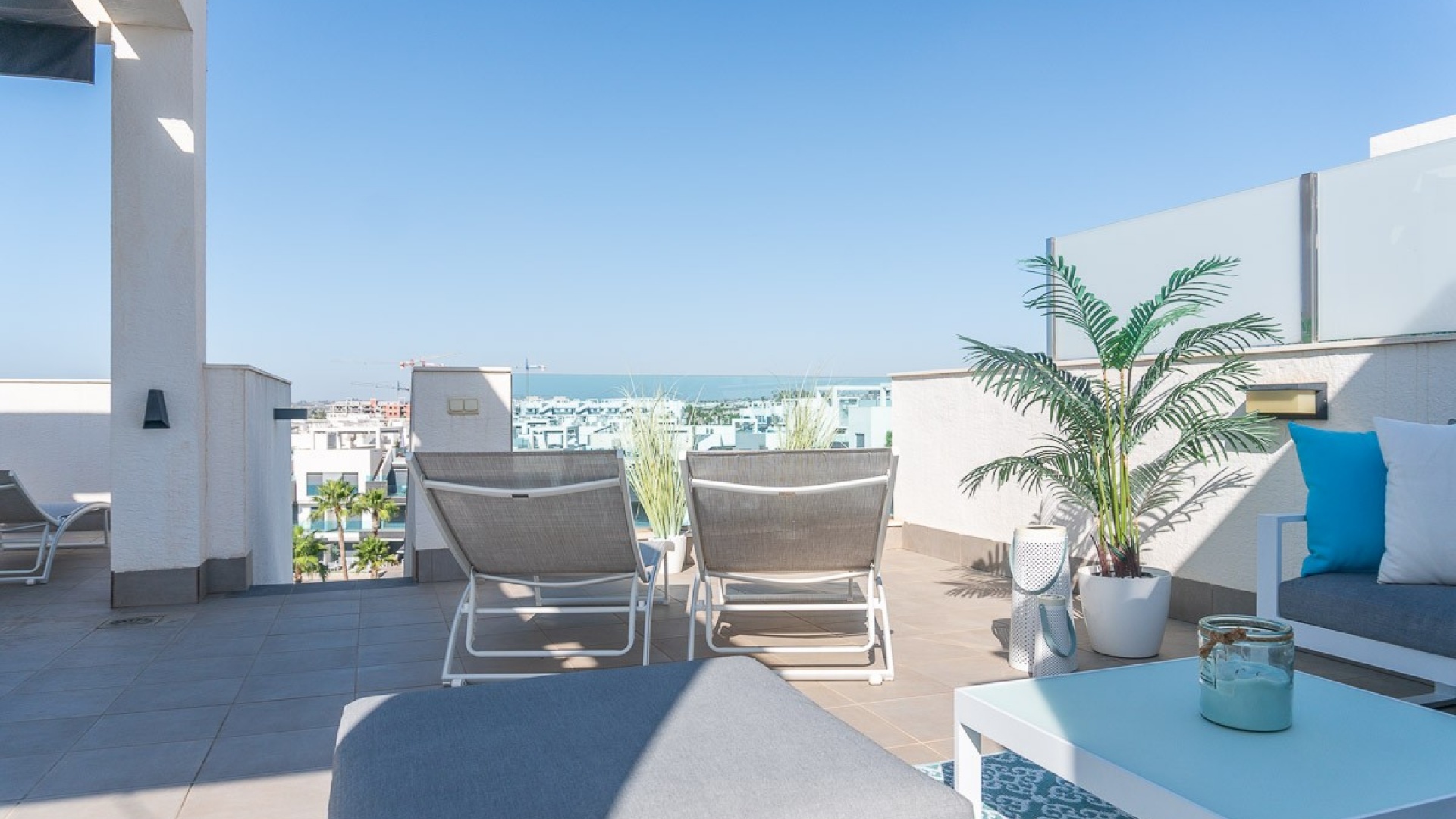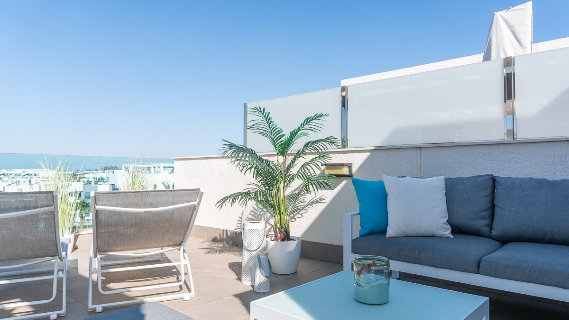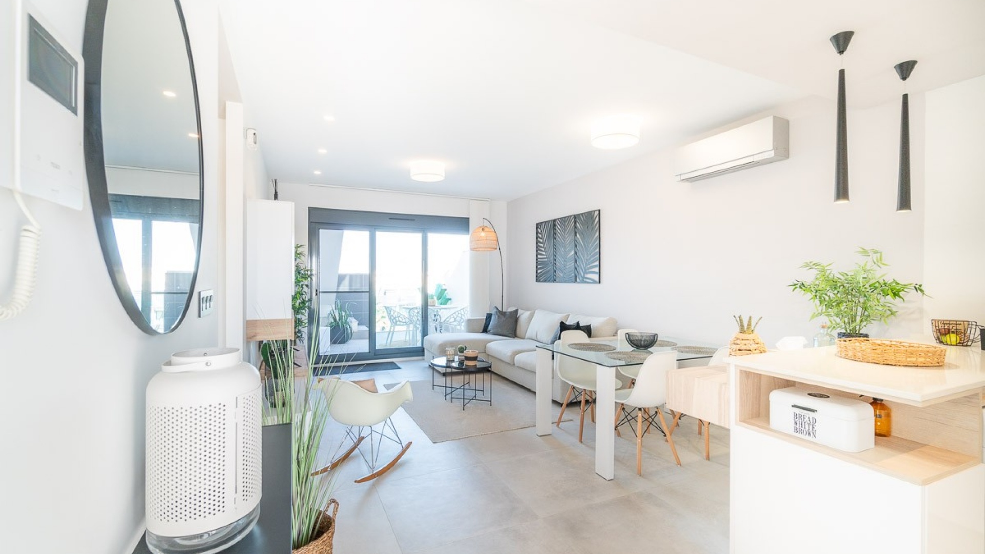 L'appartement est entièrement meublé dans un style contemporain, avec des meubles aux lignes épurées et des tons neutres qui apportent élégance et fonctionnalité. Depuis le salon, vous pouvez accéder à une terrasse privée, idéale pour profiter du climat méditerranéen et de la vue sur les espaces communs. De plus, la propriété dispose d'un solarium exclusif à l'étage supérieur, offrant un espace extérieur supplémentaire parfait pour se détendre, bronzer ou profiter de repas en plein air en toute intimité.