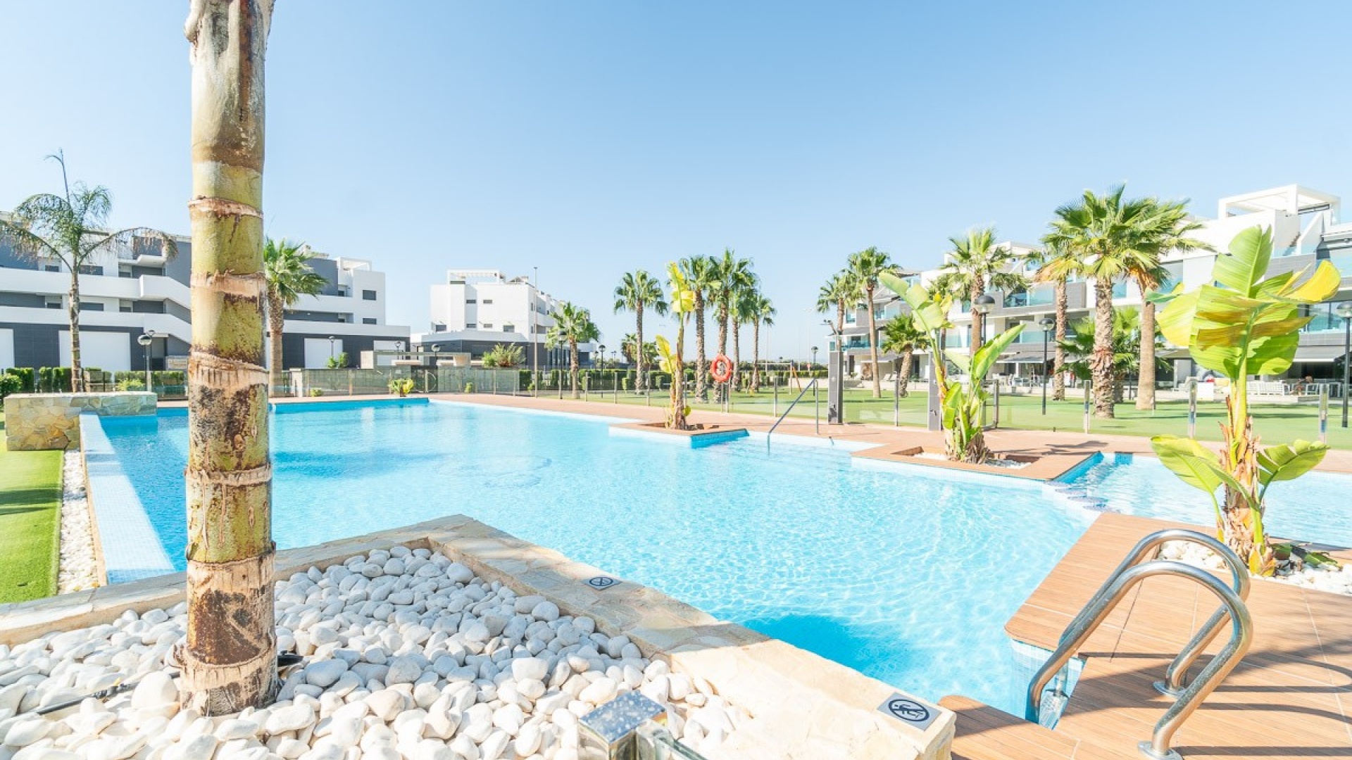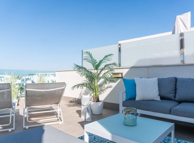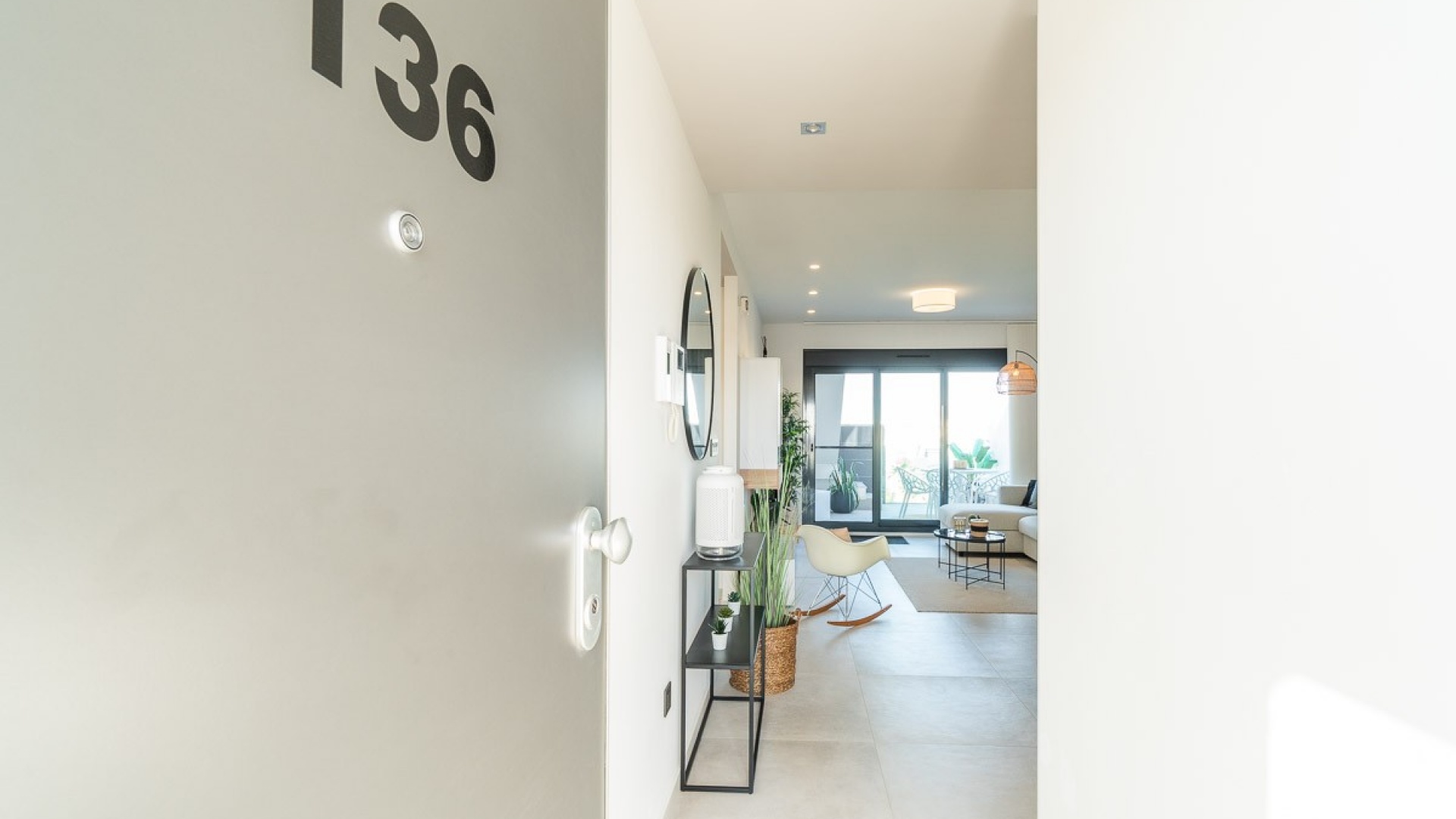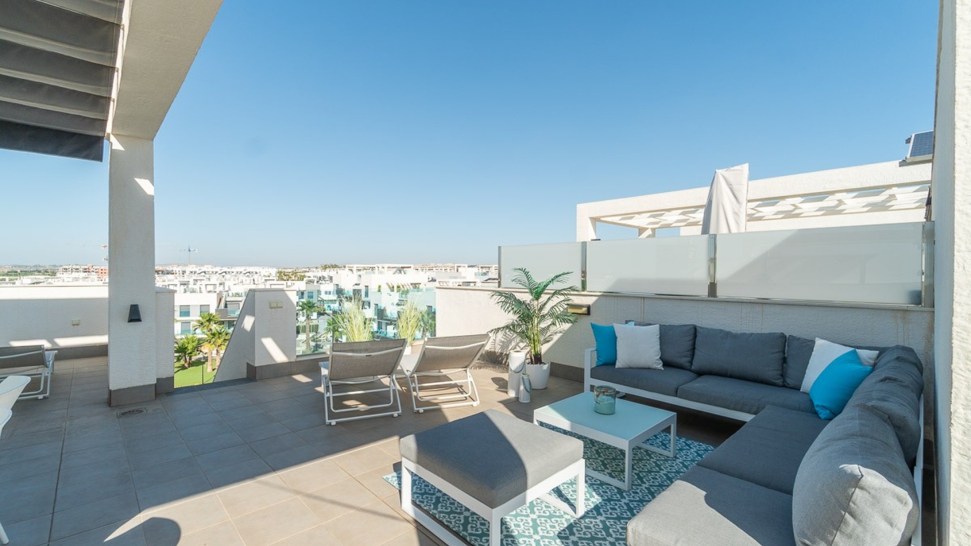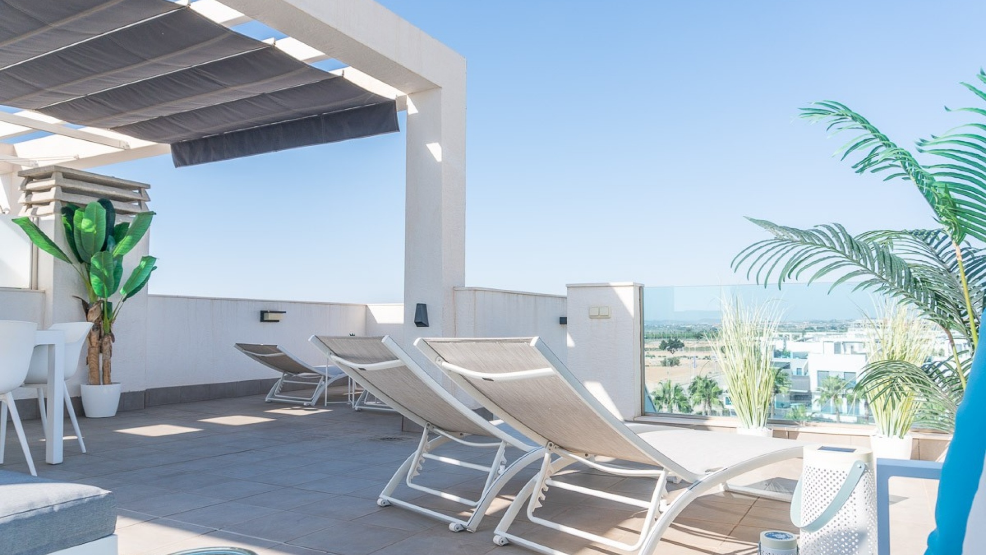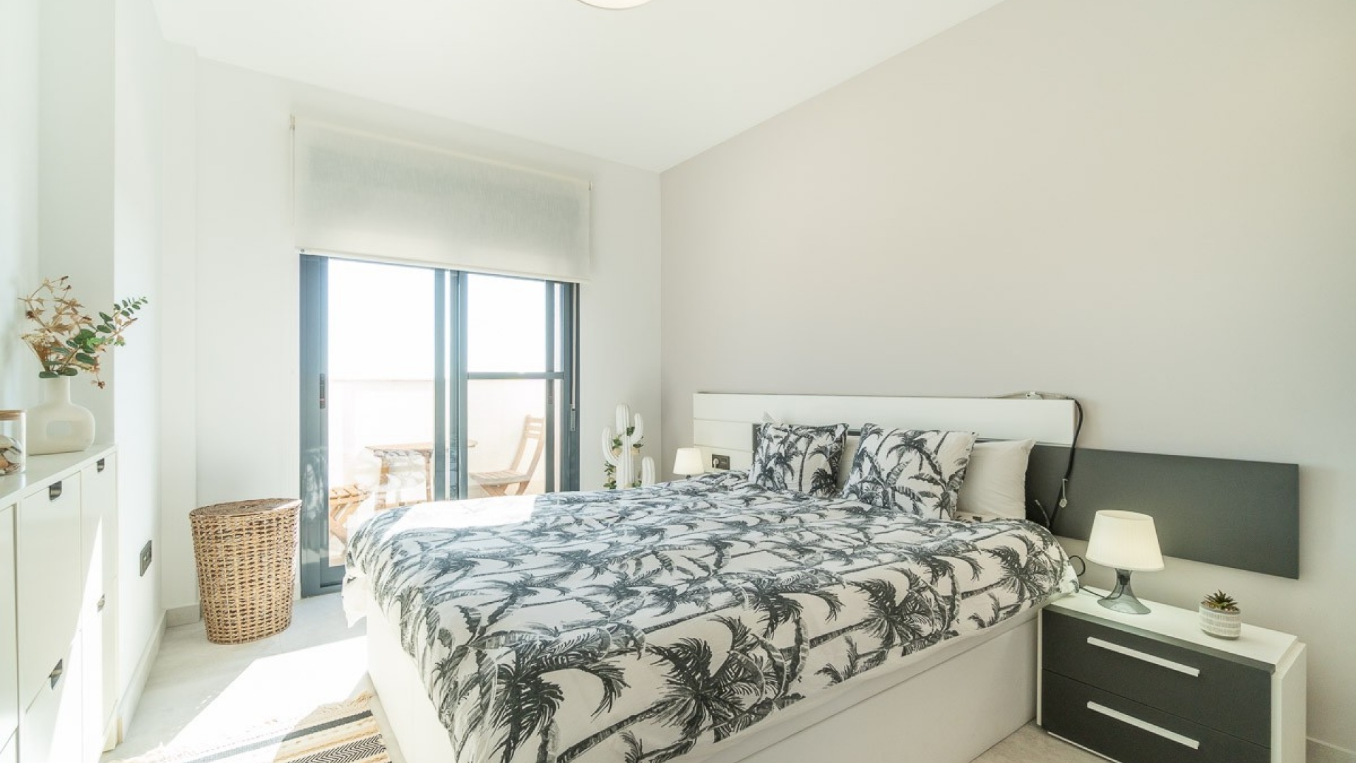 L'appartement est entièrement meublé dans un style contemporain, avec des meubles aux lignes épurées et des tons neutres qui apportent élégance et fonctionnalité. Depuis le salon, vous pouvez accéder à une terrasse privée, idéale pour profiter du climat méditerranéen et de la vue sur les espaces communs. De plus, la propriété dispose d'un solarium exclusif à l'étage supérieur, offrant un espace extérieur supplémentaire parfait pour se détendre, bronzer ou profiter de repas en plein air en toute intimité.