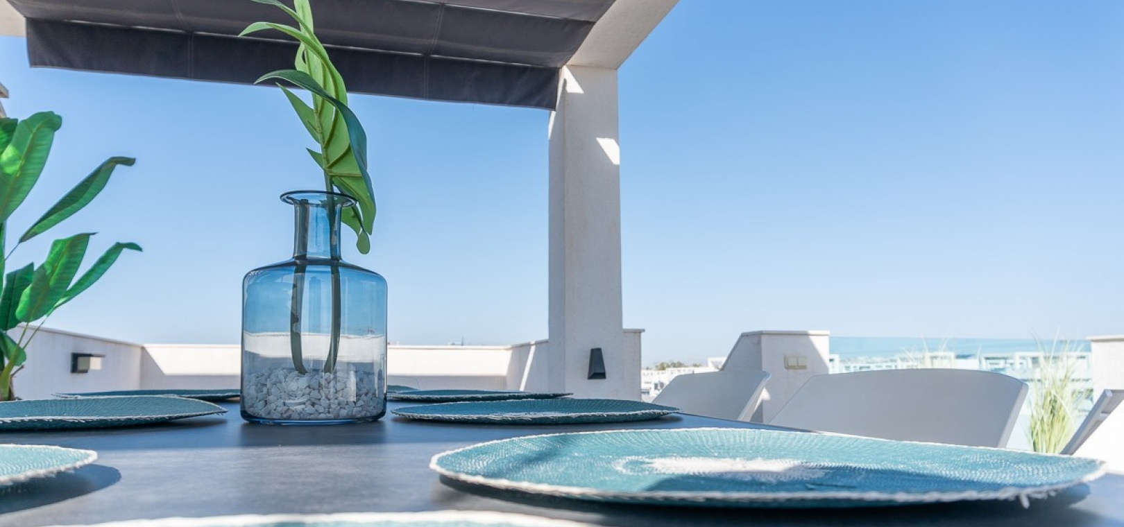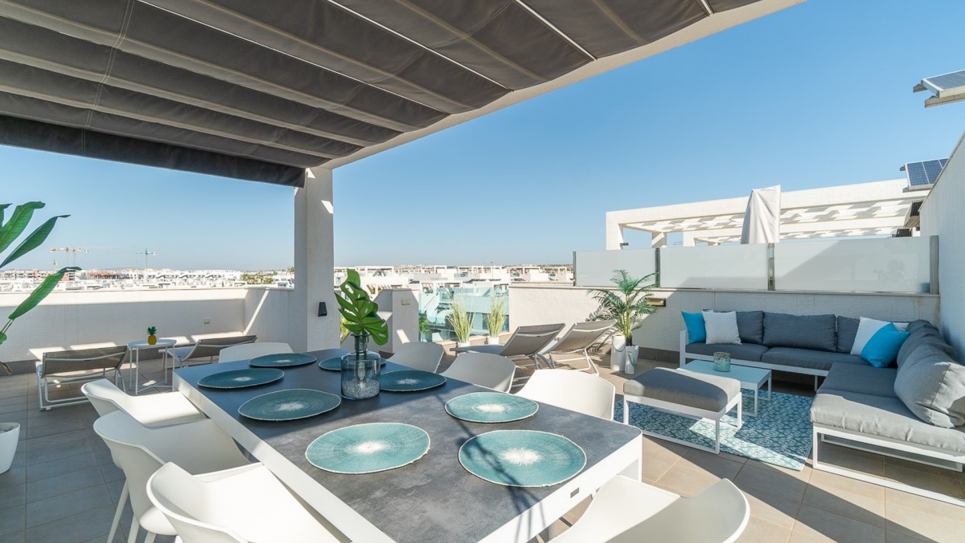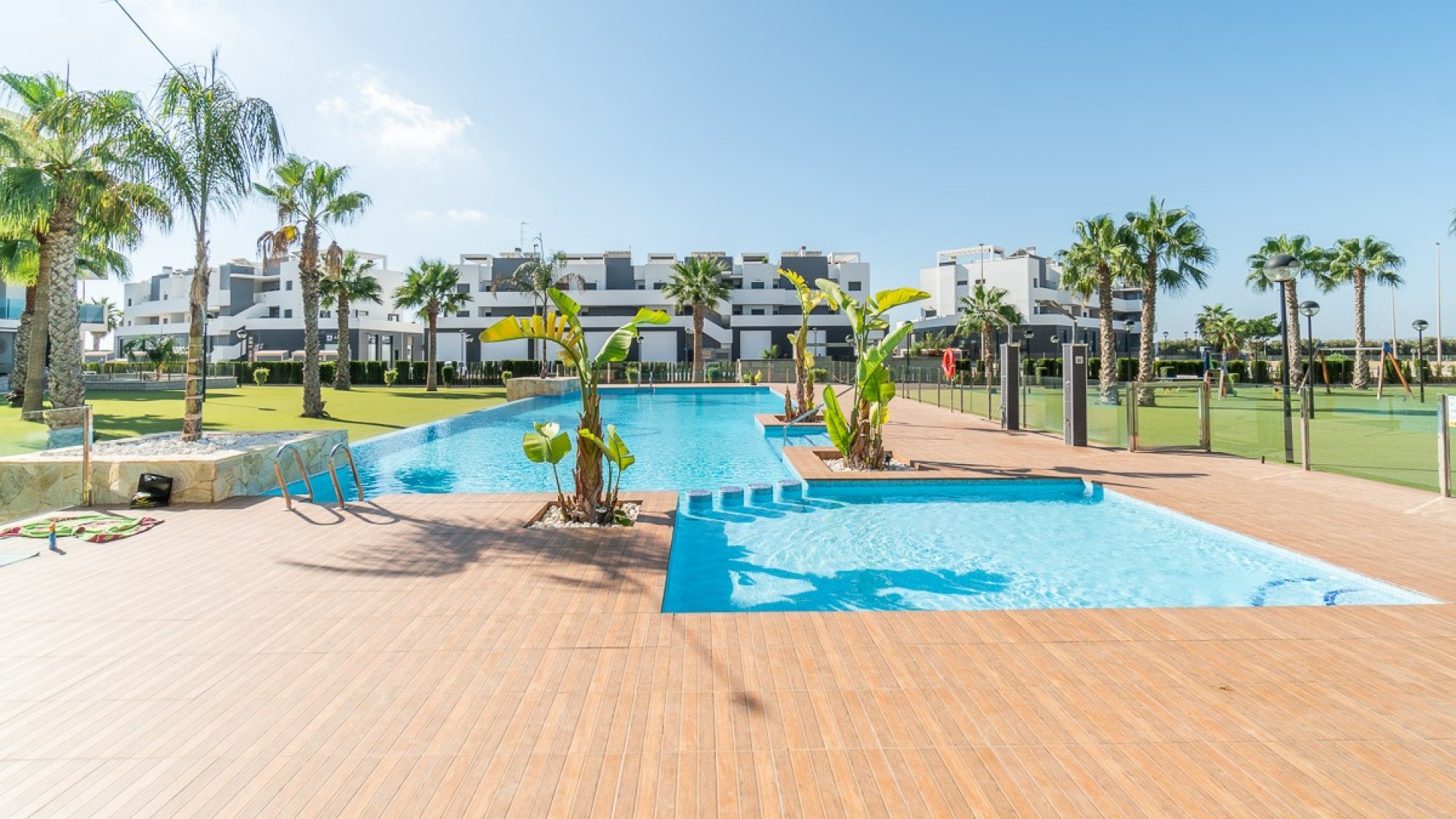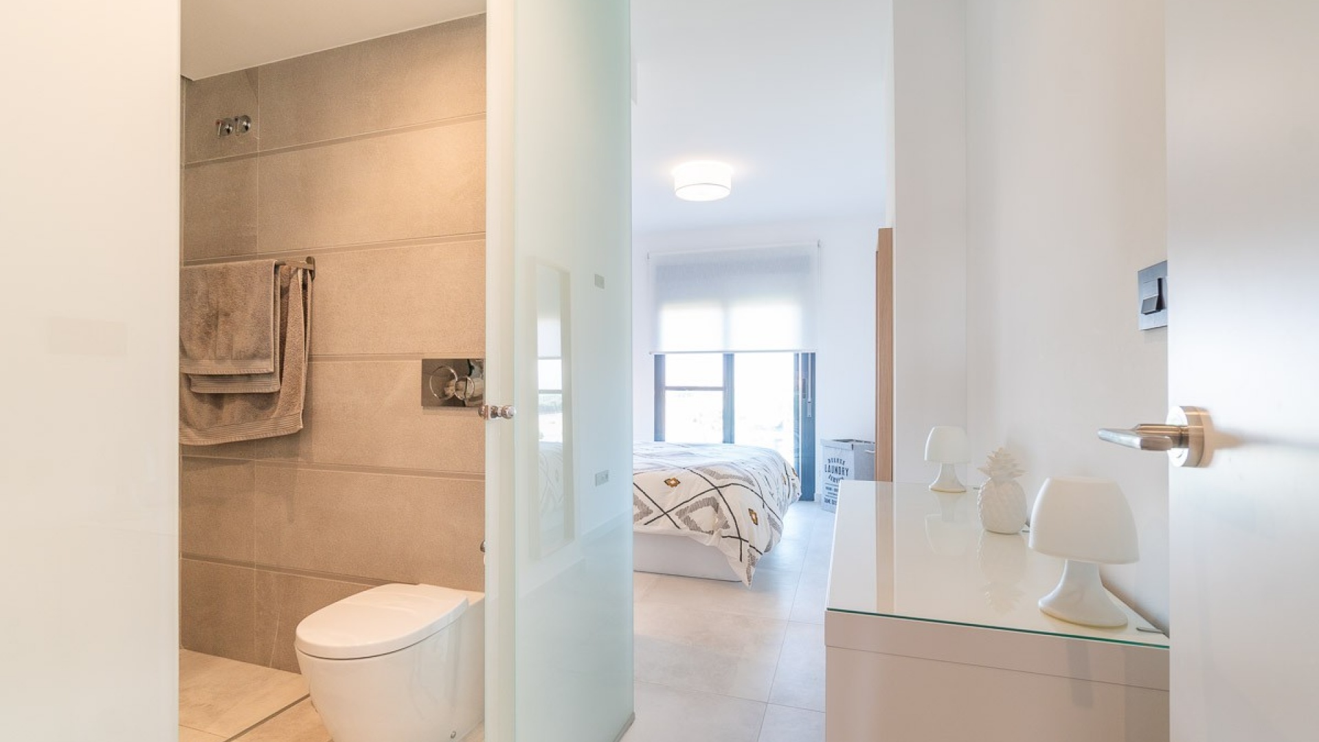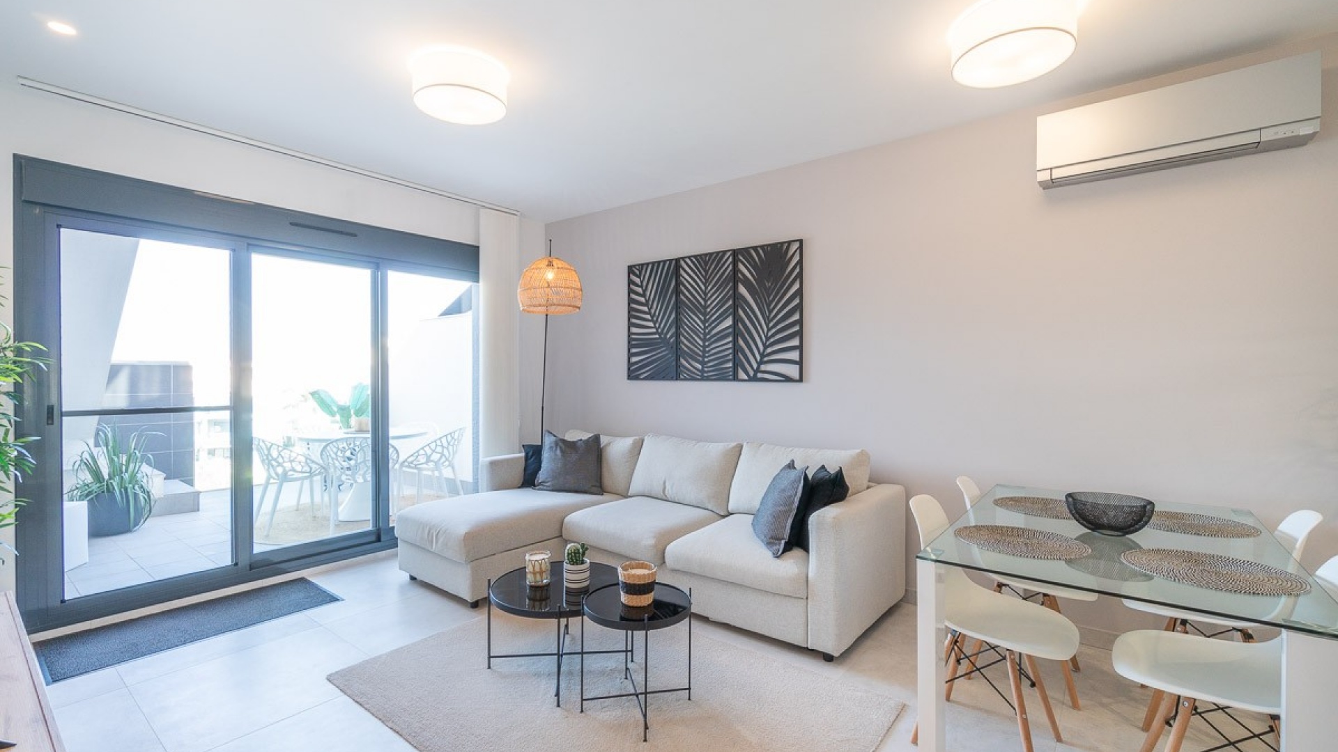 L'appartement est entièrement meublé dans un style contemporain, avec des meubles aux lignes épurées et des tons neutres qui apportent élégance et fonctionnalité. Depuis le salon, vous pouvez accéder à une terrasse privée, idéale pour profiter du climat méditerranéen et de la vue sur les espaces communs. De plus, la propriété dispose d'un solarium exclusif à l'étage supérieur, offrant un espace extérieur supplémentaire parfait pour se détendre, bronzer ou profiter de repas en plein air en toute intimité.