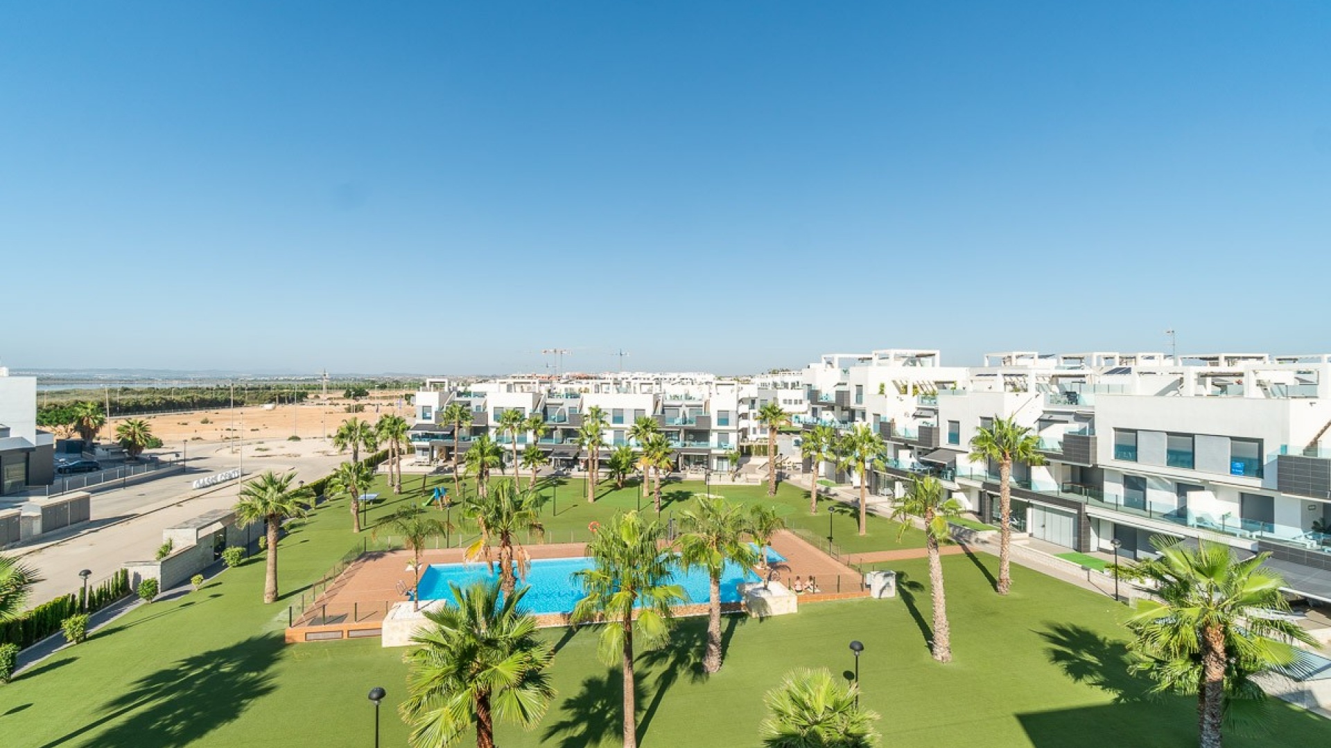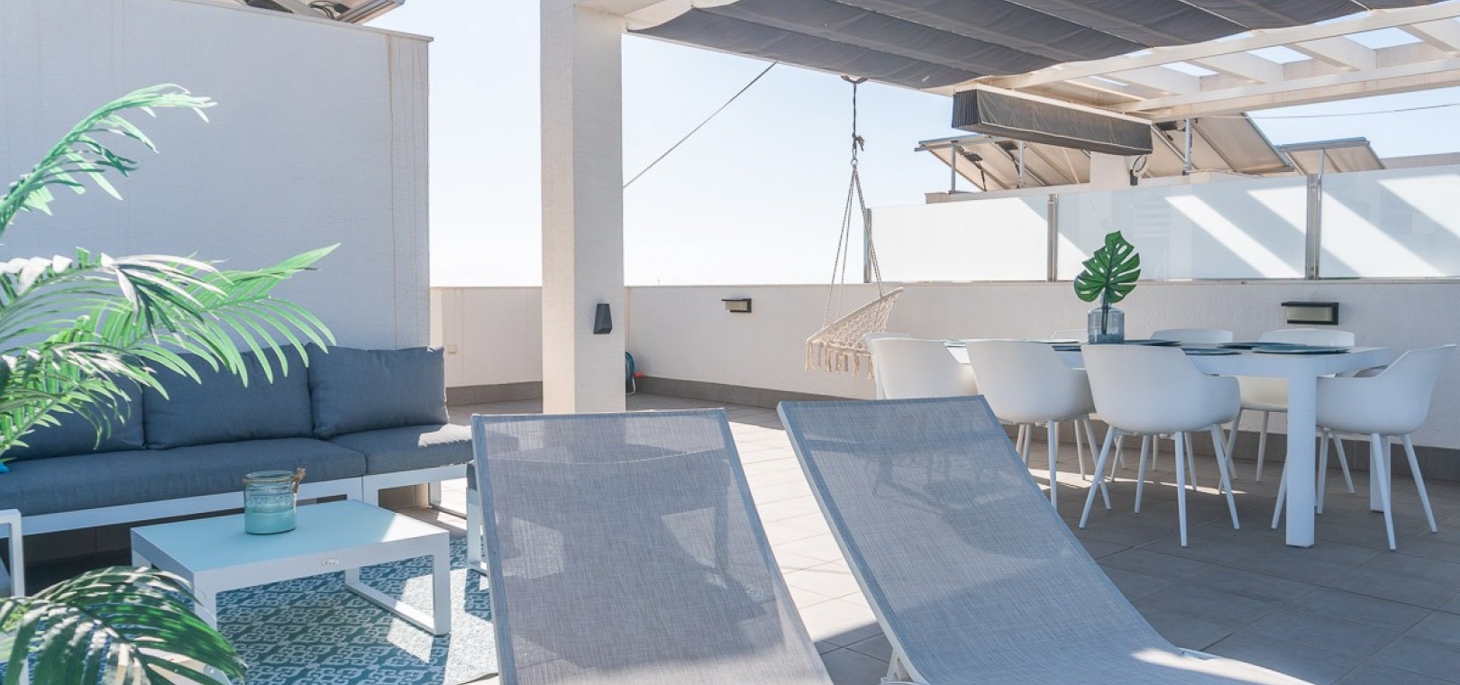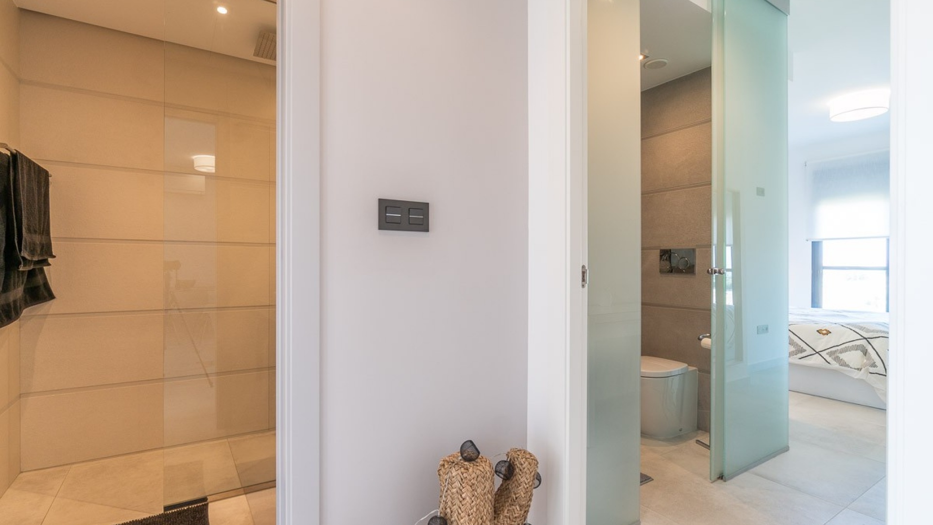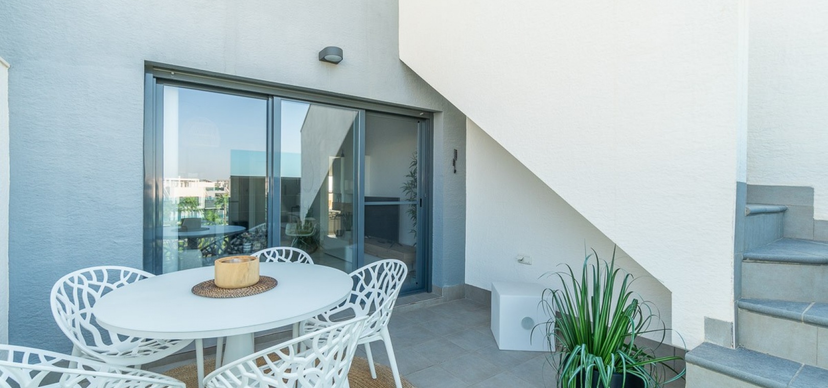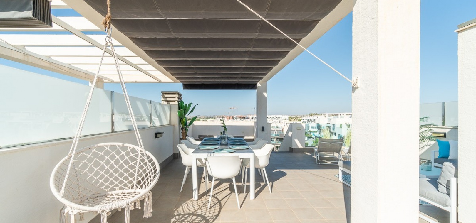 L'appartement est entièrement meublé dans un style contemporain, avec des meubles aux lignes épurées et des tons neutres qui apportent élégance et fonctionnalité. Depuis le salon, vous pouvez accéder à une terrasse privée, idéale pour profiter du climat méditerranéen et de la vue sur les espaces communs. De plus, la propriété dispose d'un solarium exclusif à l'étage supérieur, offrant un espace extérieur supplémentaire parfait pour se détendre, bronzer ou profiter de repas en plein air en toute intimité.