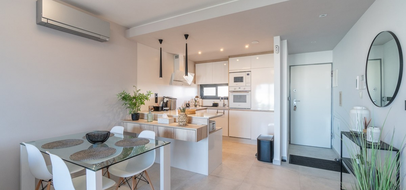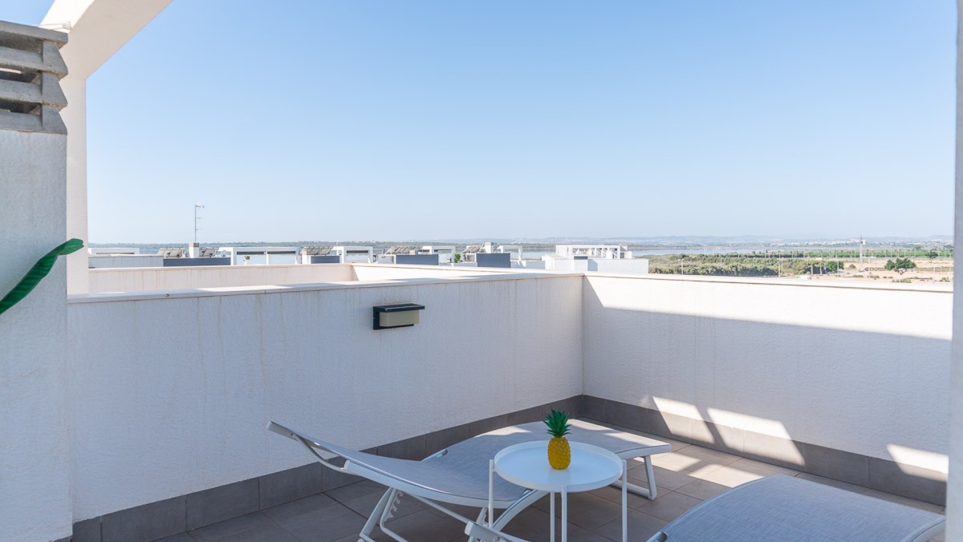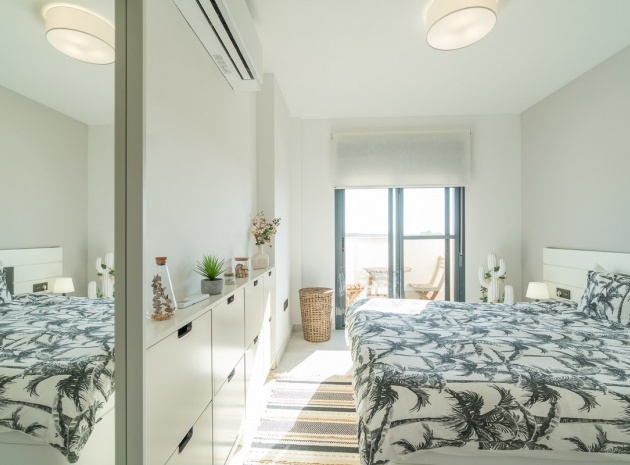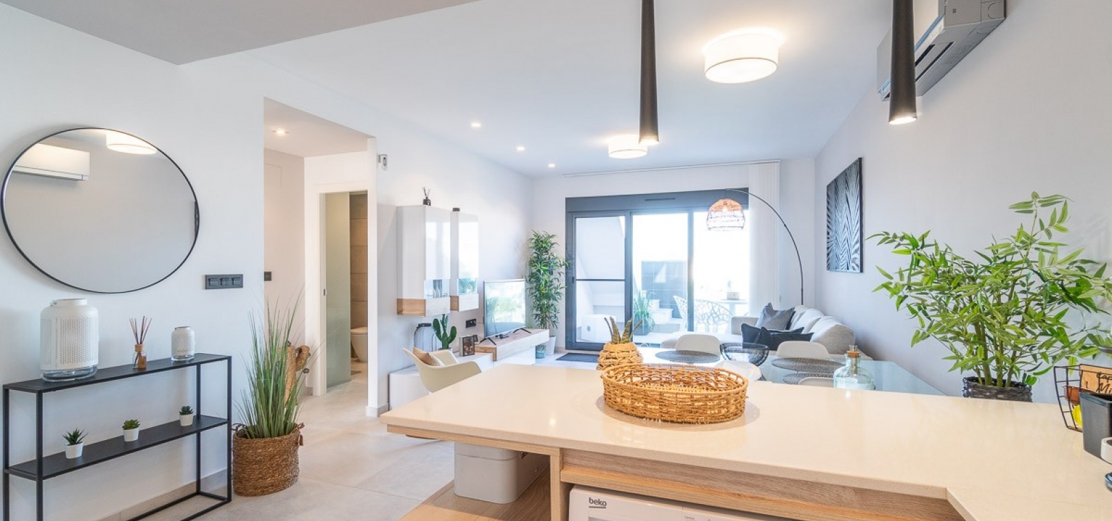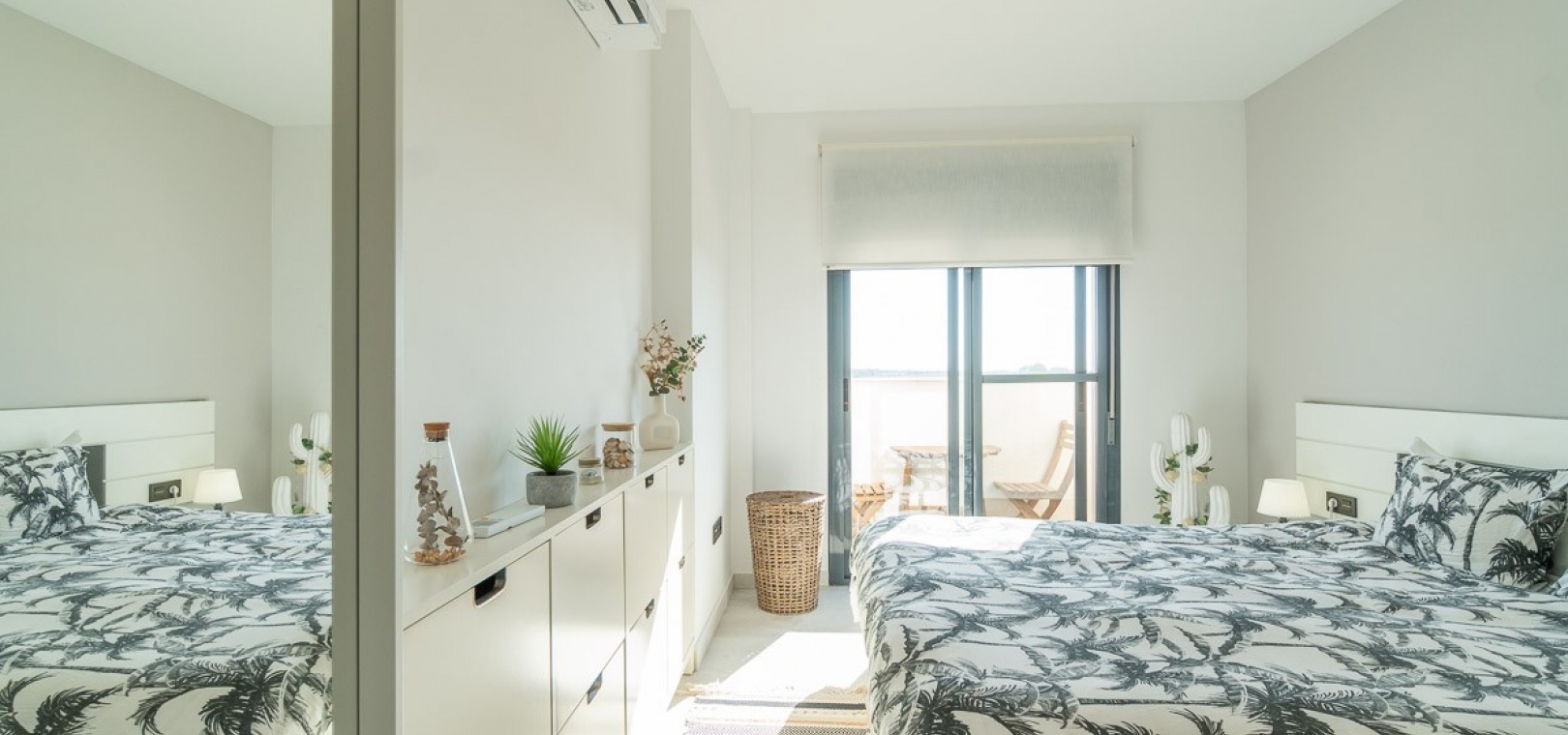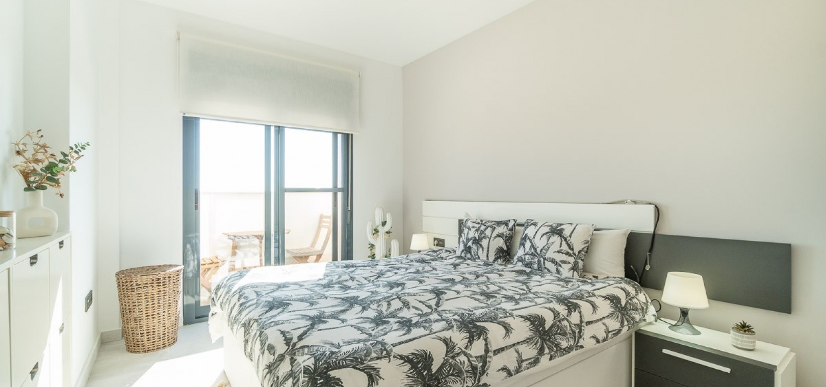 L'appartement est entièrement meublé dans un style contemporain, avec des meubles aux lignes épurées et des tons neutres qui apportent élégance et fonctionnalité. Depuis le salon, vous pouvez accéder à une terrasse privée, idéale pour profiter du climat méditerranéen et de la vue sur les espaces communs. De plus, la propriété dispose d'un solarium exclusif à l'étage supérieur, offrant un espace extérieur supplémentaire parfait pour se détendre, bronzer ou profiter de repas en plein air en toute intimité.