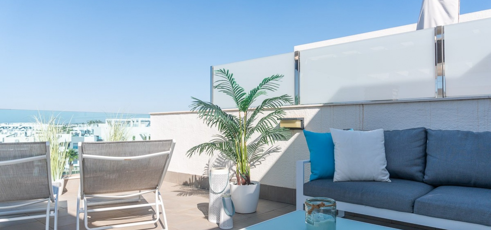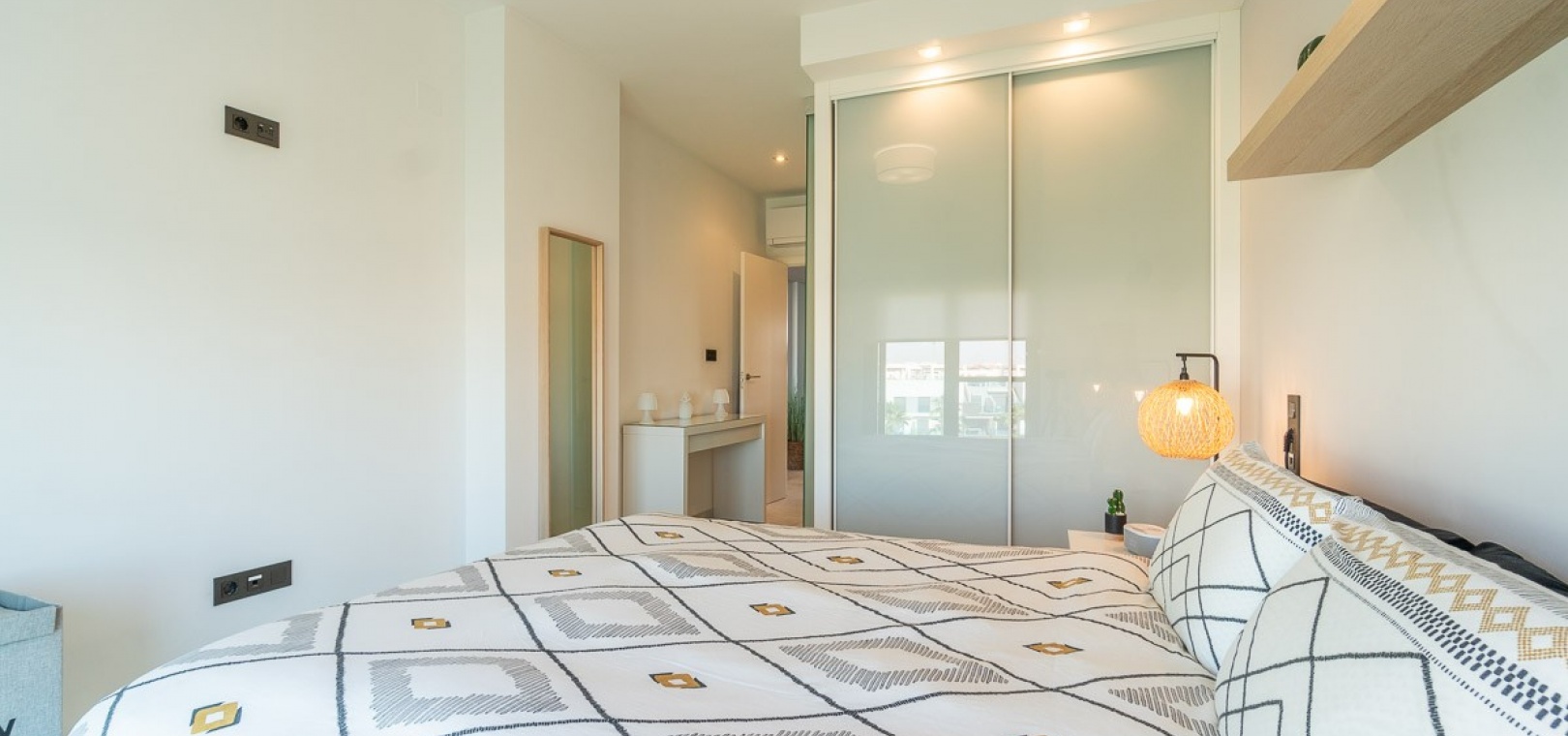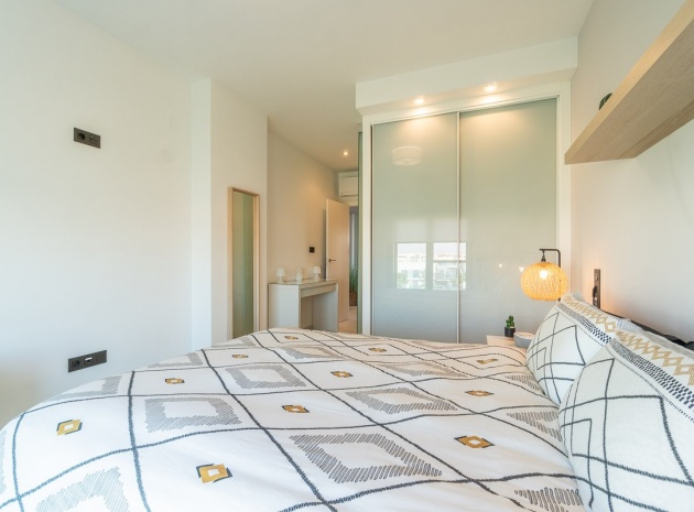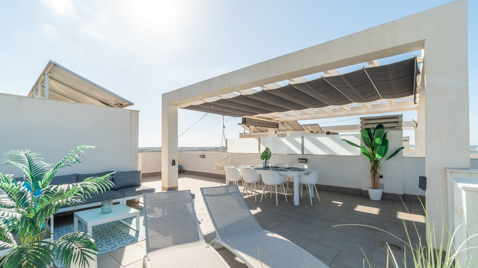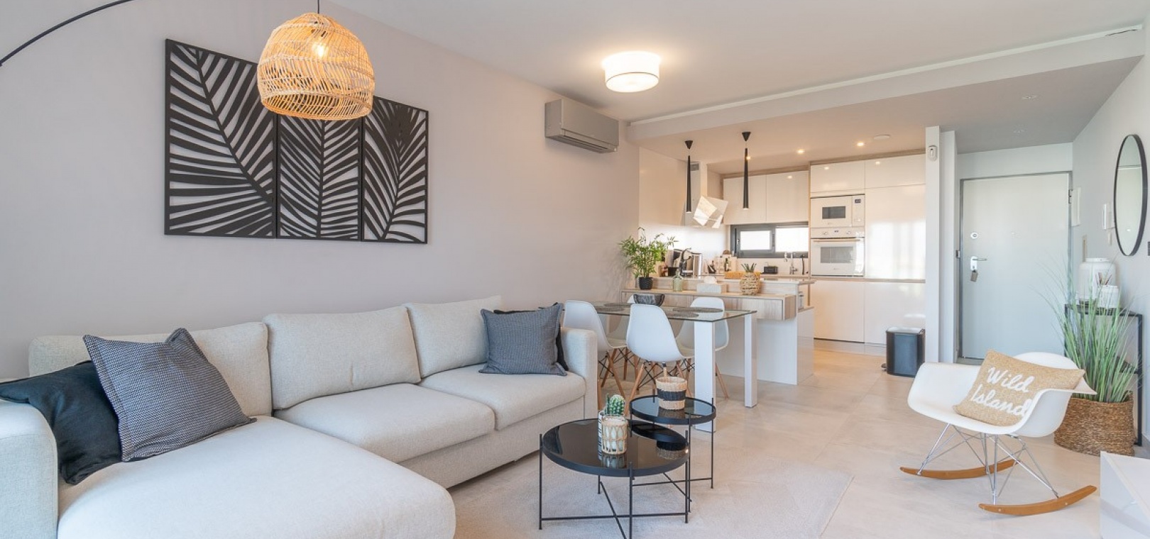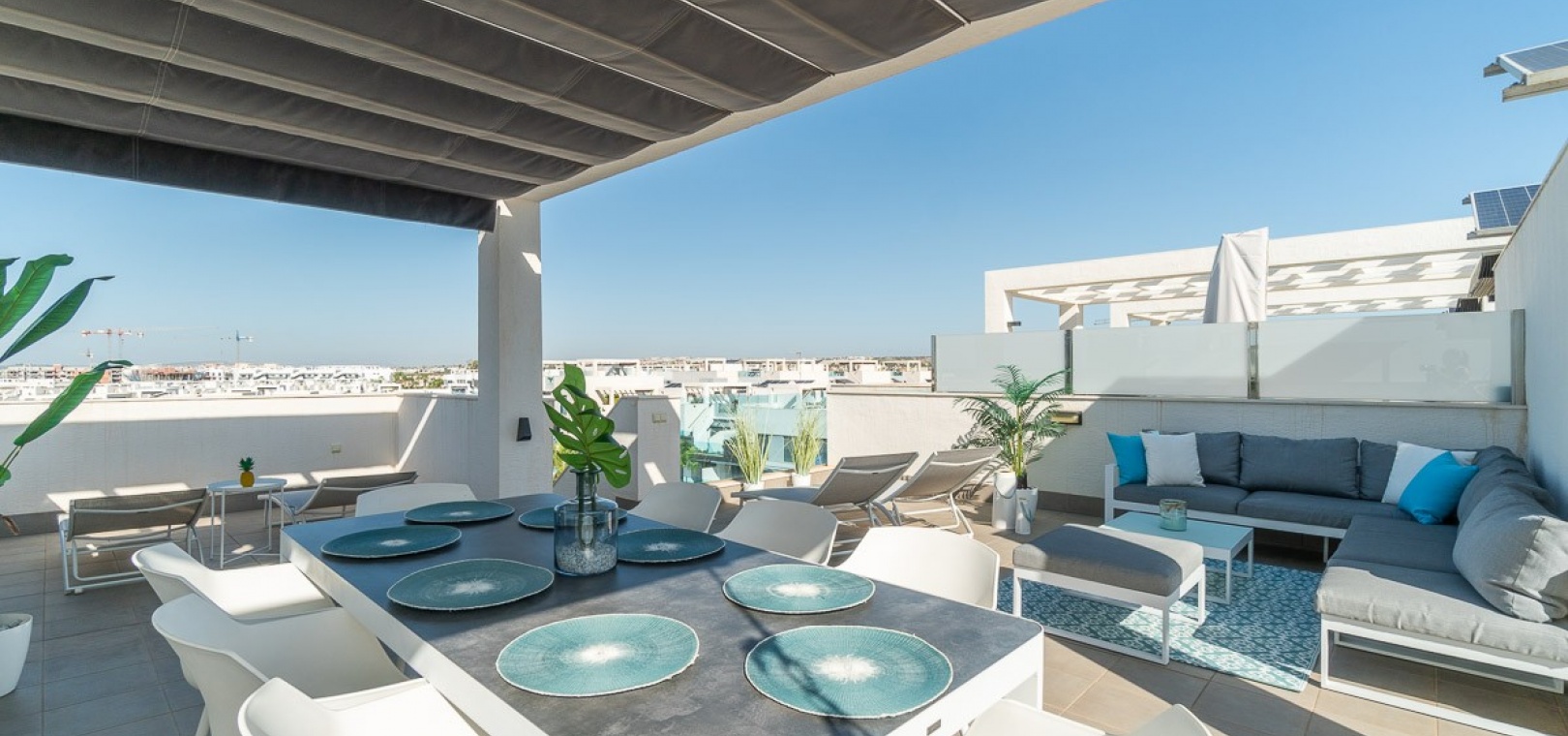 L'appartement est entièrement meublé dans un style contemporain, avec des meubles aux lignes épurées et des tons neutres qui apportent élégance et fonctionnalité. Depuis le salon, vous pouvez accéder à une terrasse privée, idéale pour profiter du climat méditerranéen et de la vue sur les espaces communs. De plus, la propriété dispose d'un solarium exclusif à l'étage supérieur, offrant un espace extérieur supplémentaire parfait pour se détendre, bronzer ou profiter de repas en plein air en toute intimité.